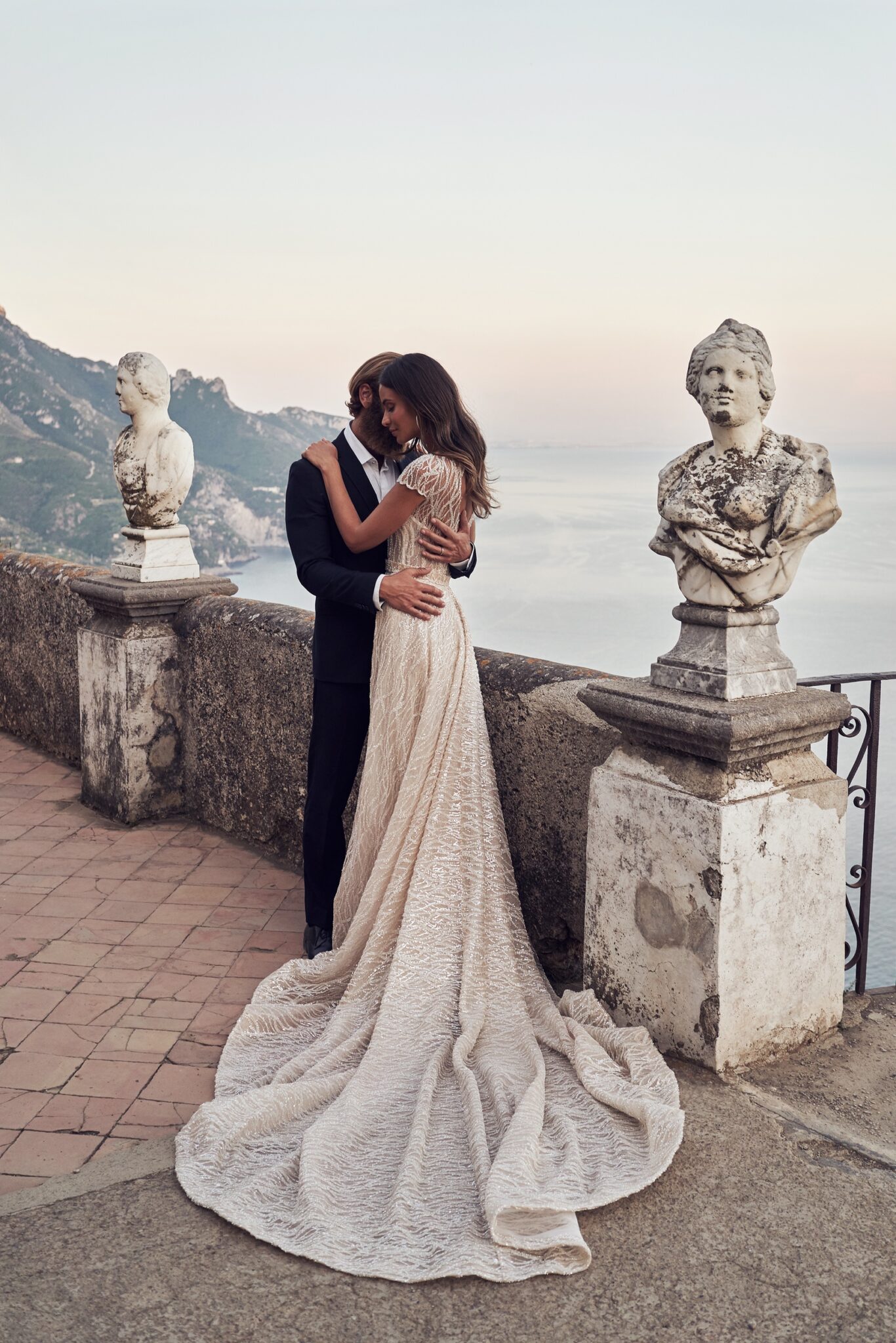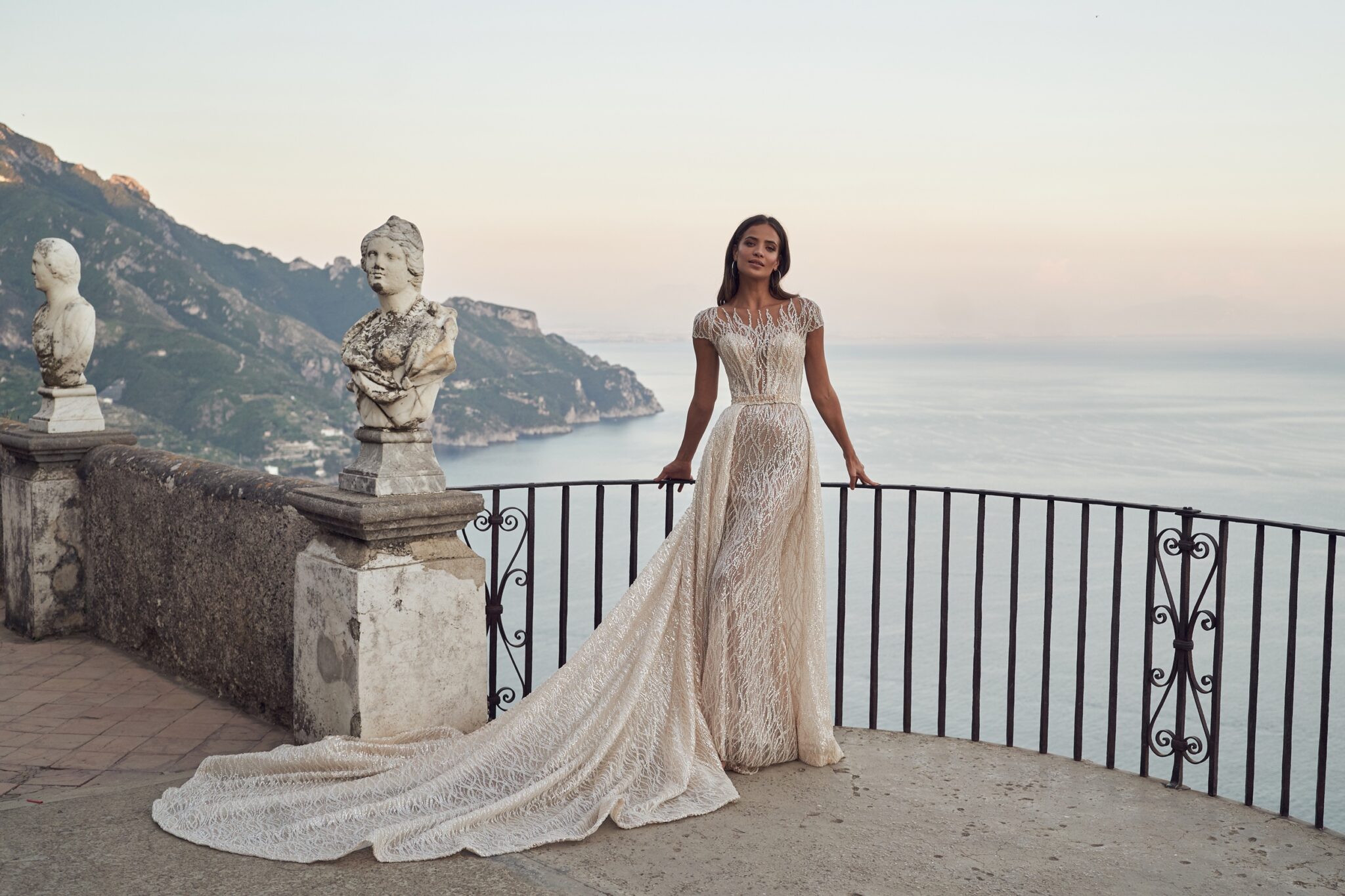 Ніжне весільне плаття Marcia створює дійсно жіночий силует. Малюнок тонких ліній прикрашає всю сукню. Весільне плаття сяє завдяки сяючим кристалам і намистинам. Пояс підкреслює талію і утримує спідницю з довгим хвостом.