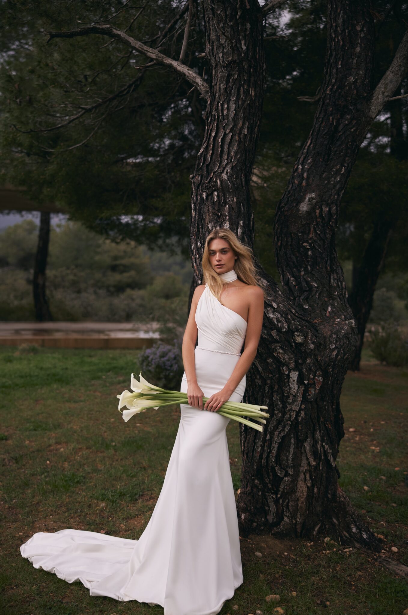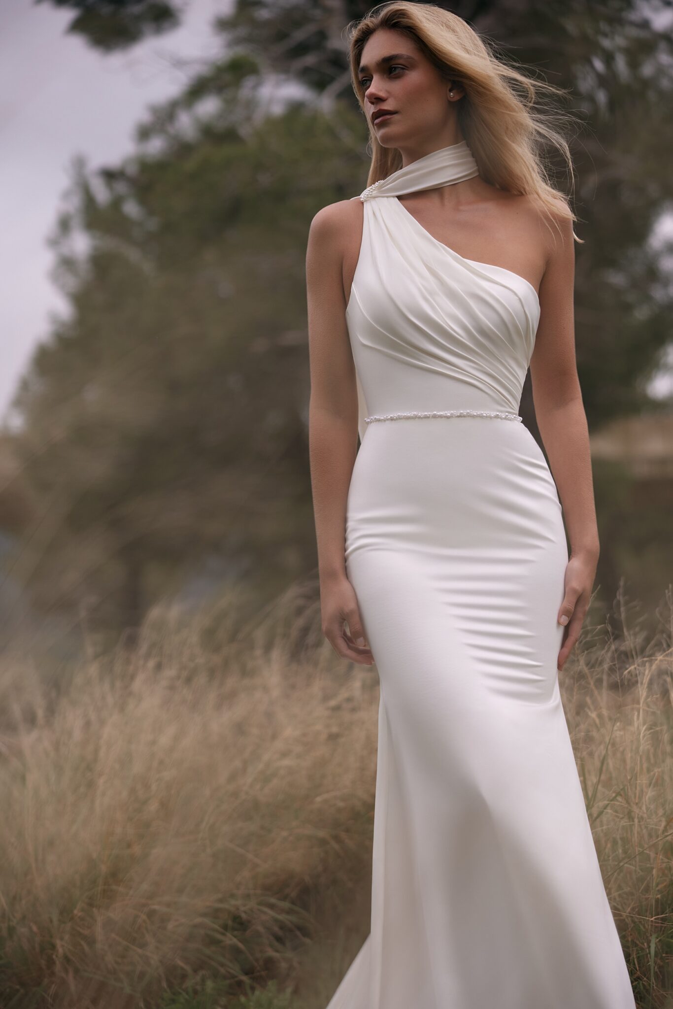 Сукня в стилі “русалка” з асиметричним верхом з легкого атласу.