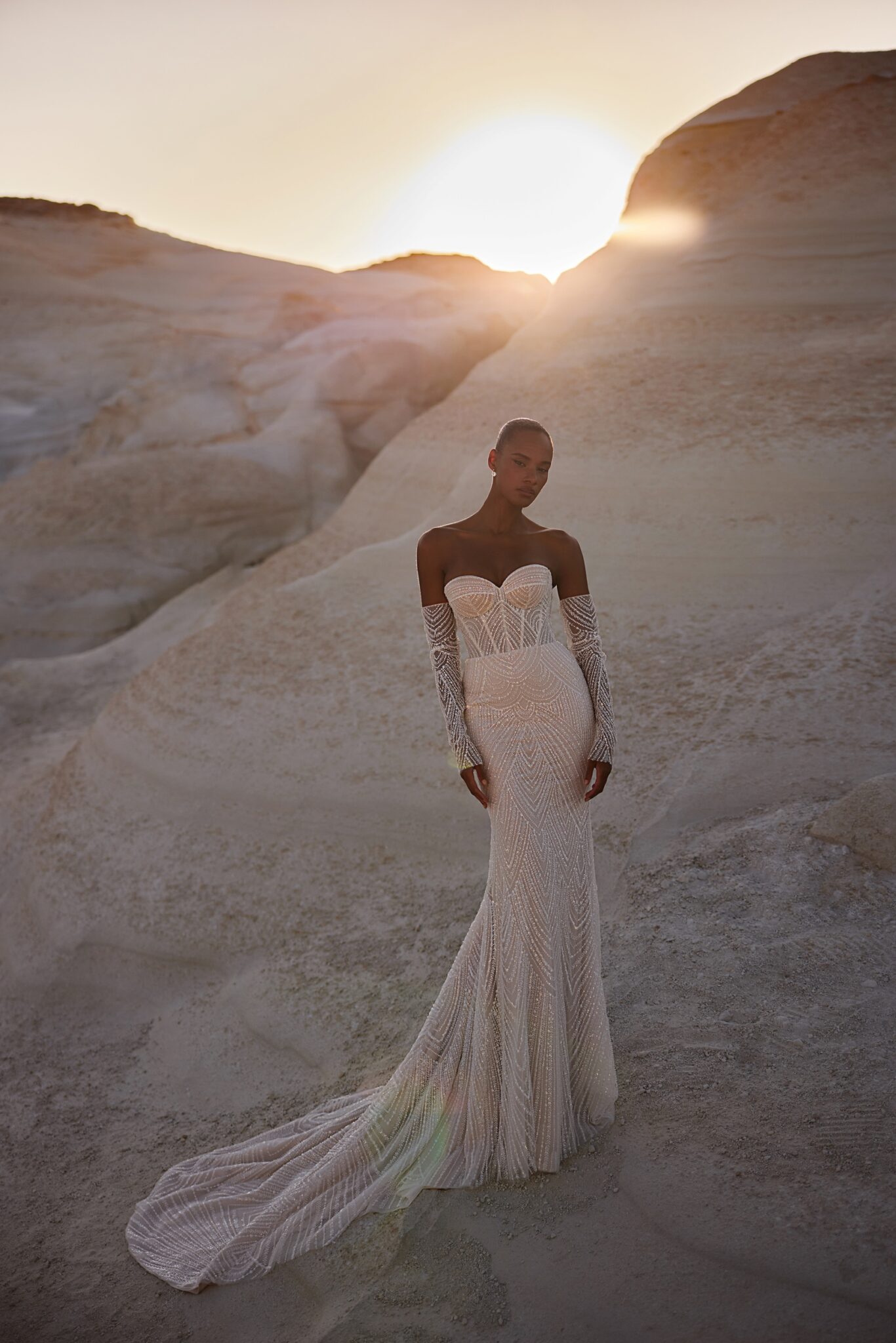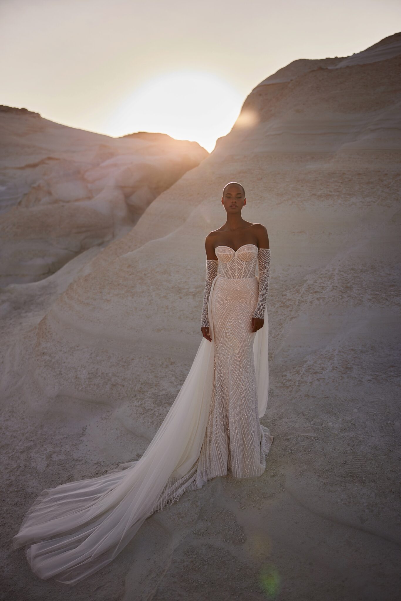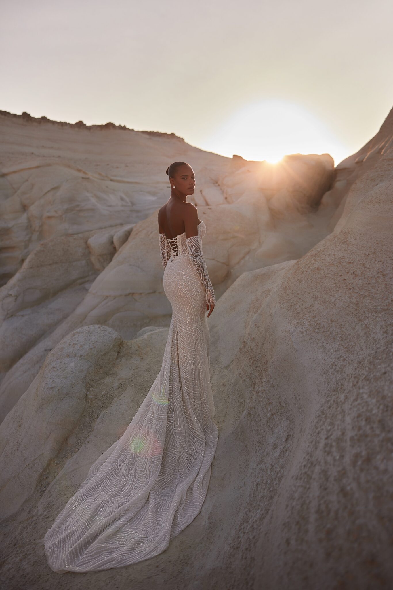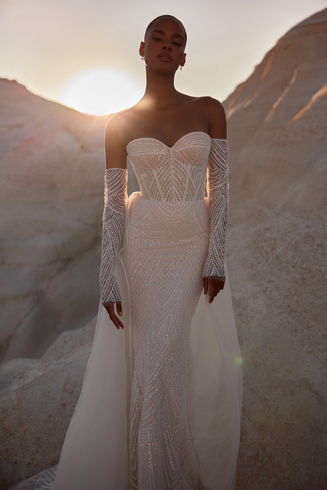 Дивовижна сукня силуету “труба” з вирізом “сердечко” та багатою вишивкою бісером, що утворює орнаментальні мотиви, які створюють ефект сяйва. Знімні рукави-сіточки вишиті таким же бісером, а спинка сукні доповнена прозорим шлейфом.