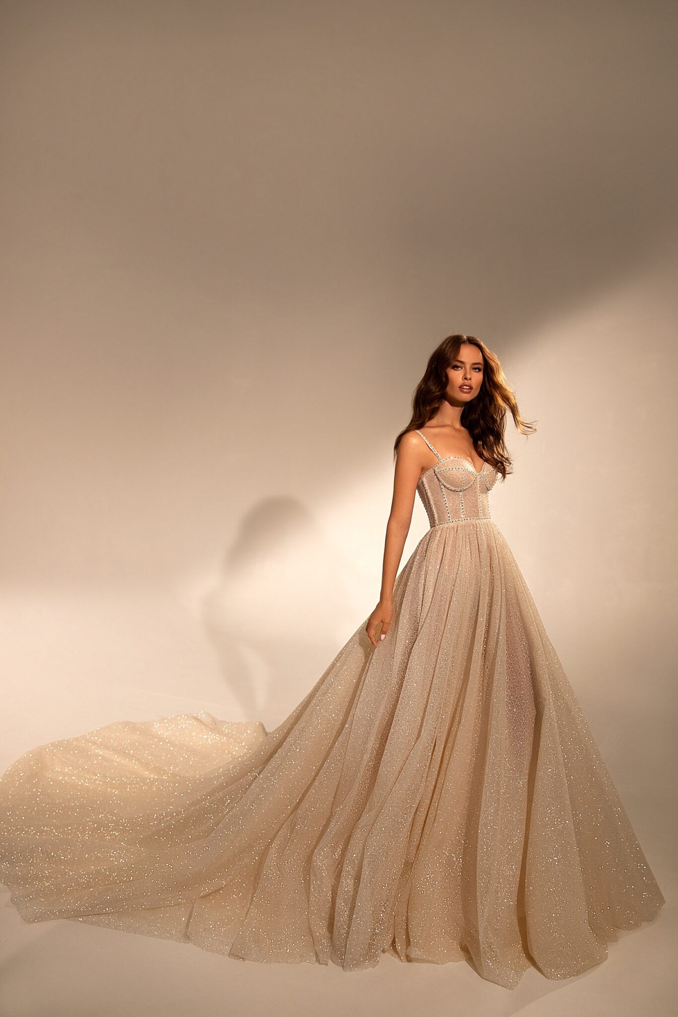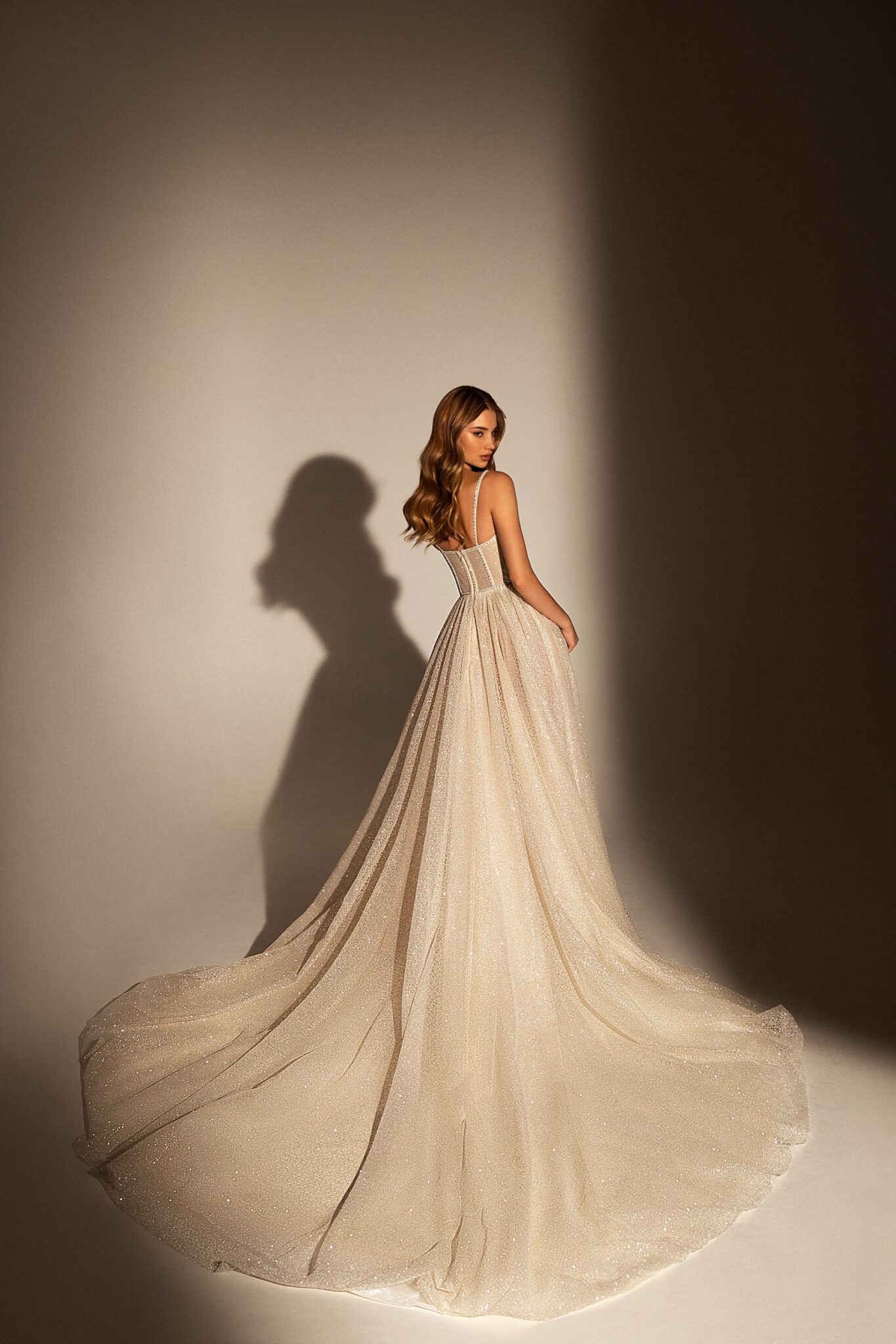 Muse – чудова весільна сукня з розслабленою спідницею та довгим шлейфом. Весільна сукня з V-подібним вирізом на грудях прикрашена плечовими ремінцями і виготовлена з блискучої тканини. Чудова спідниця переходить у довгий шлейф.