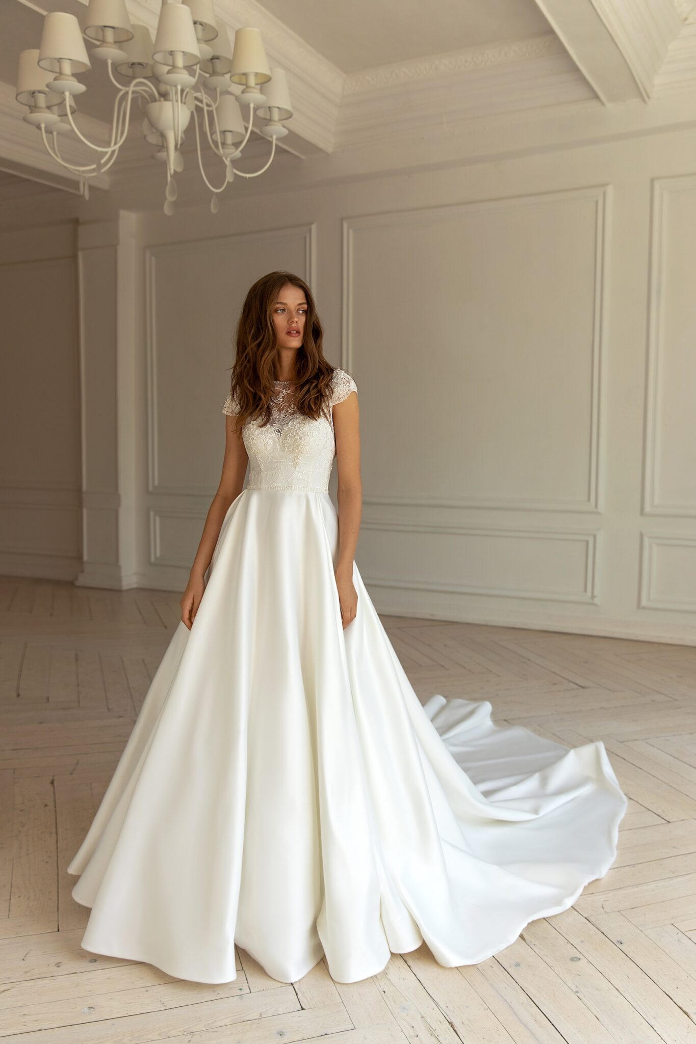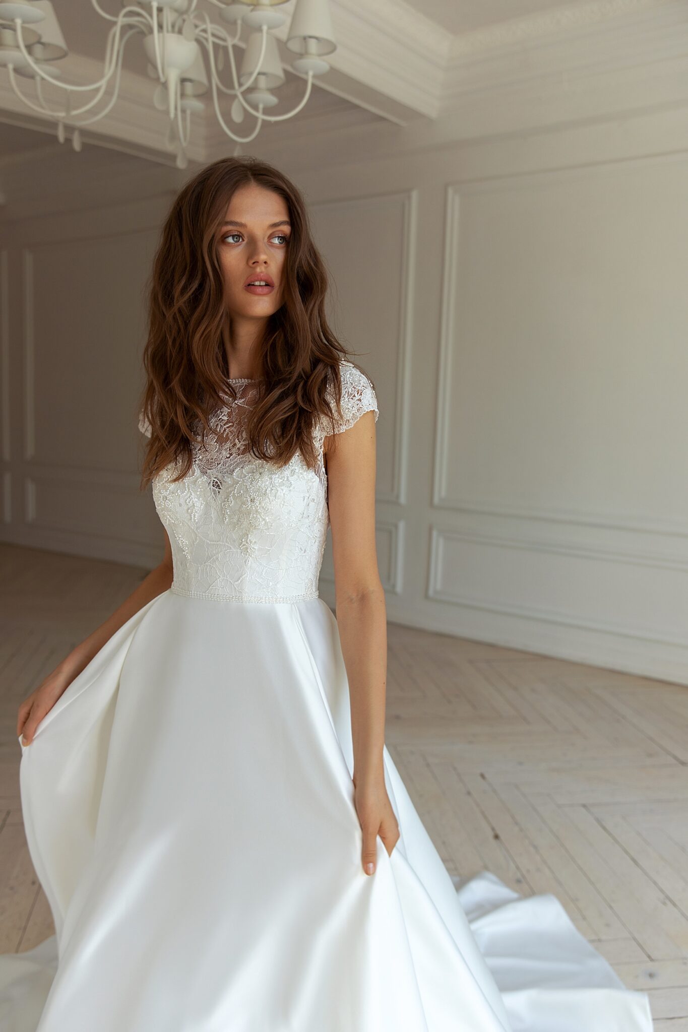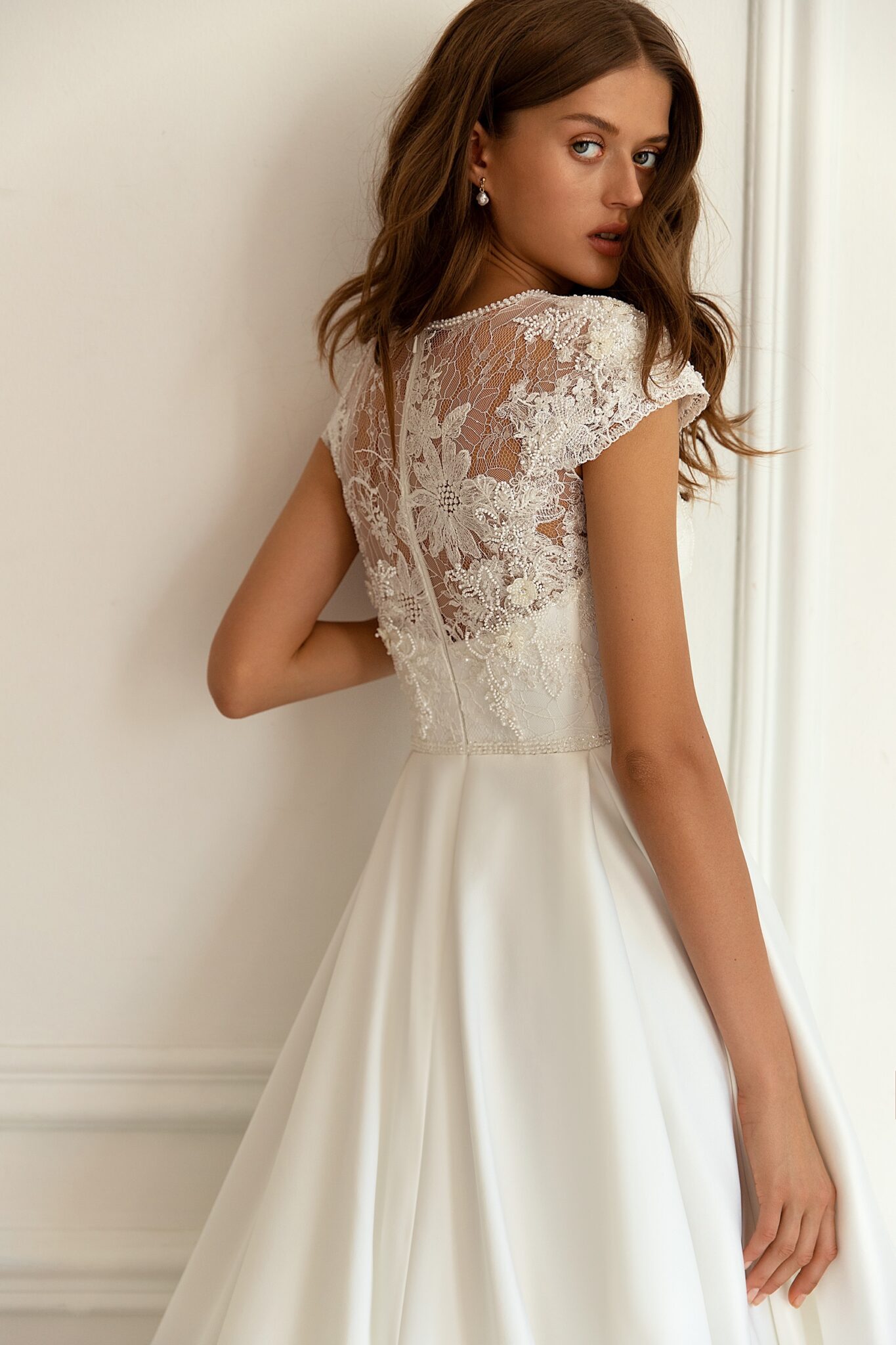 Величне весільне плаття з мереживним корсетом і атласною спідницею. Сукня з вирізом у формі сердечка прикрашена мереживним верхом. Цей верх мережива з квітковим візерунком прикрашений перлами. Ззаду сукня прикрашена довгим мереживним елементом, який проходить до середини спідниці.