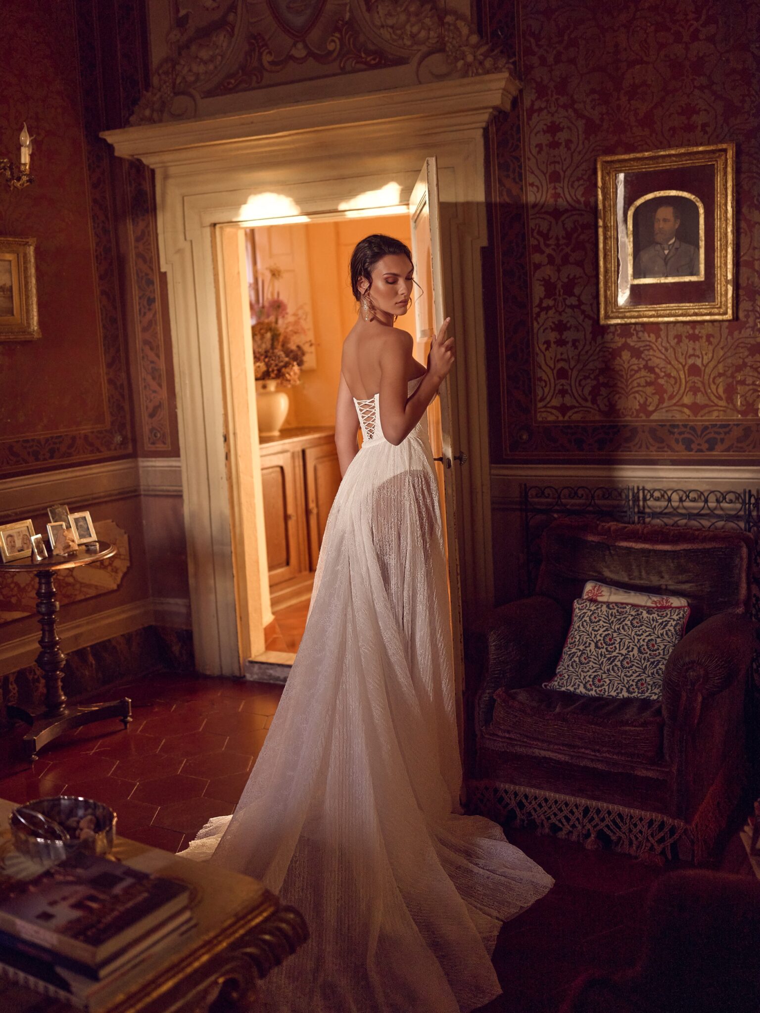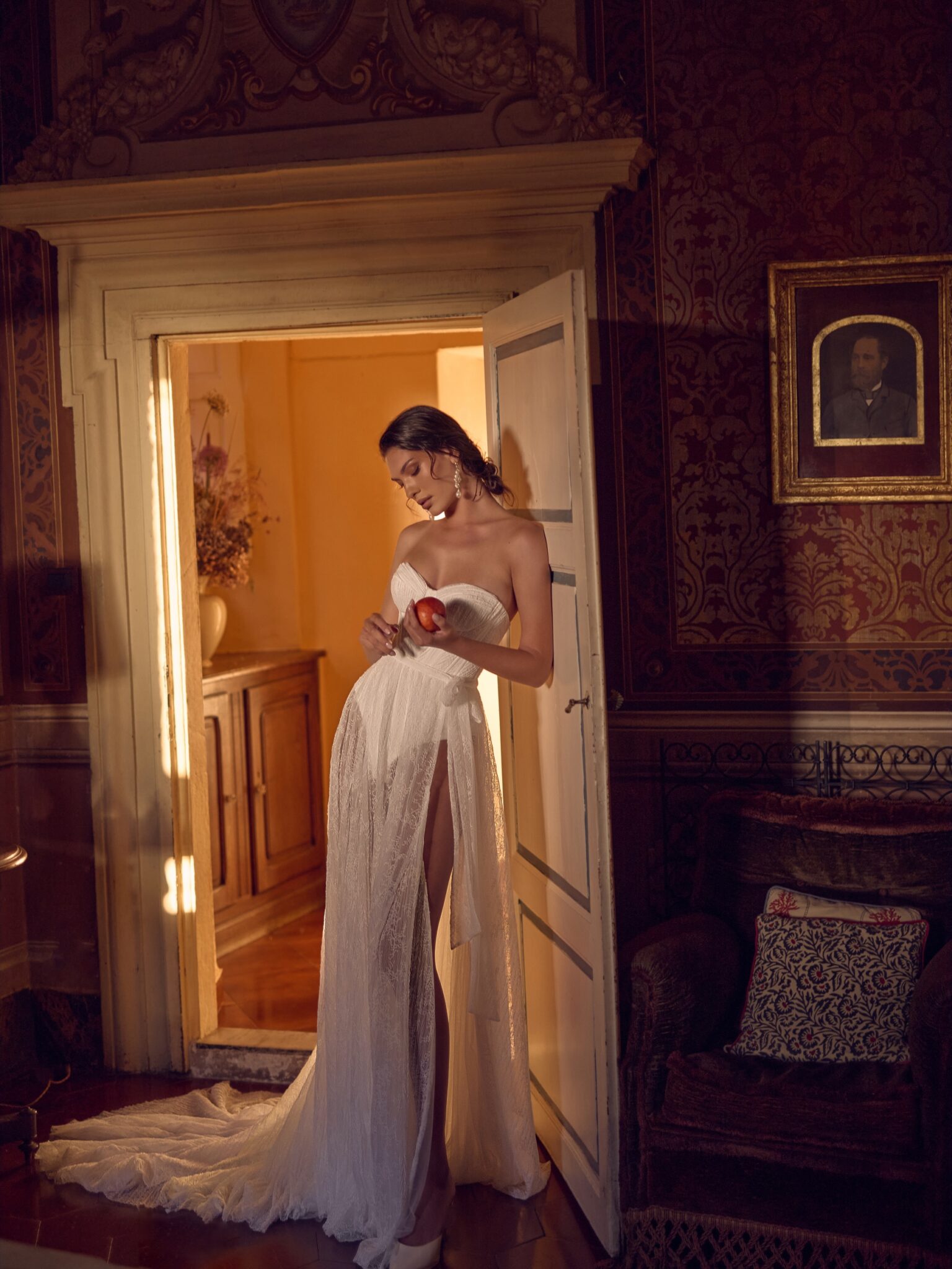 Спідниця пошита з мережива шантільї з тонкою плісированою текстурою і переходить у драматичний шлейф, що спадає до самої підлоги. Сміливий високий розріз на нозі додає вишуканому ансамблю яскравого, ультрамодного відтінку, що робить Немезиду ідеальним вибором для нареченої, яка прагне заявити про себе.
