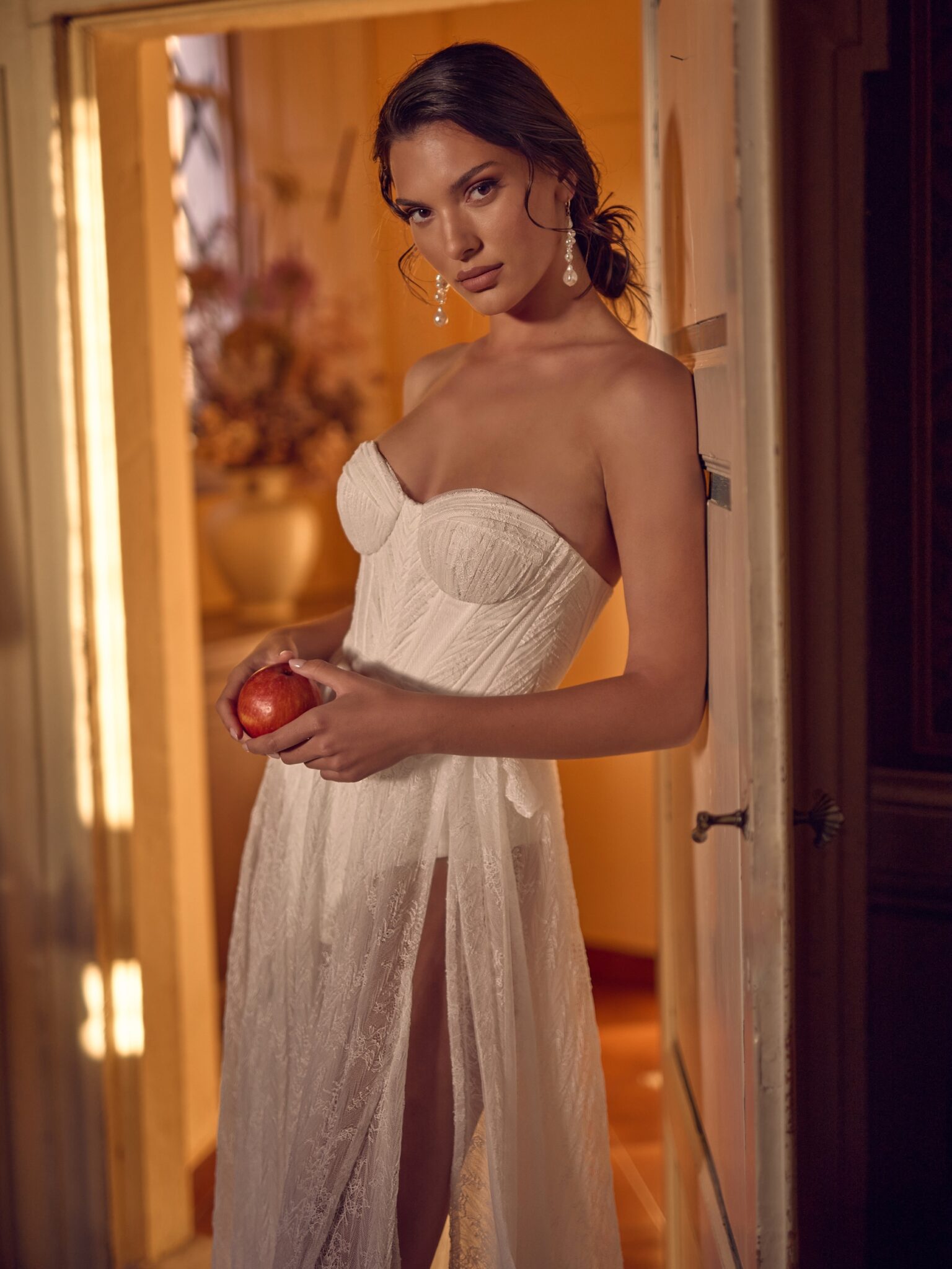Боді та спідниця виготовлені з плісированого мережива шантільї. Боді має елегантне драпірування спереду, що додає глибини та текстури. Корсет зашнуровується ззаду, пропонуючи регульовану посадку і дотик романтичних деталей.