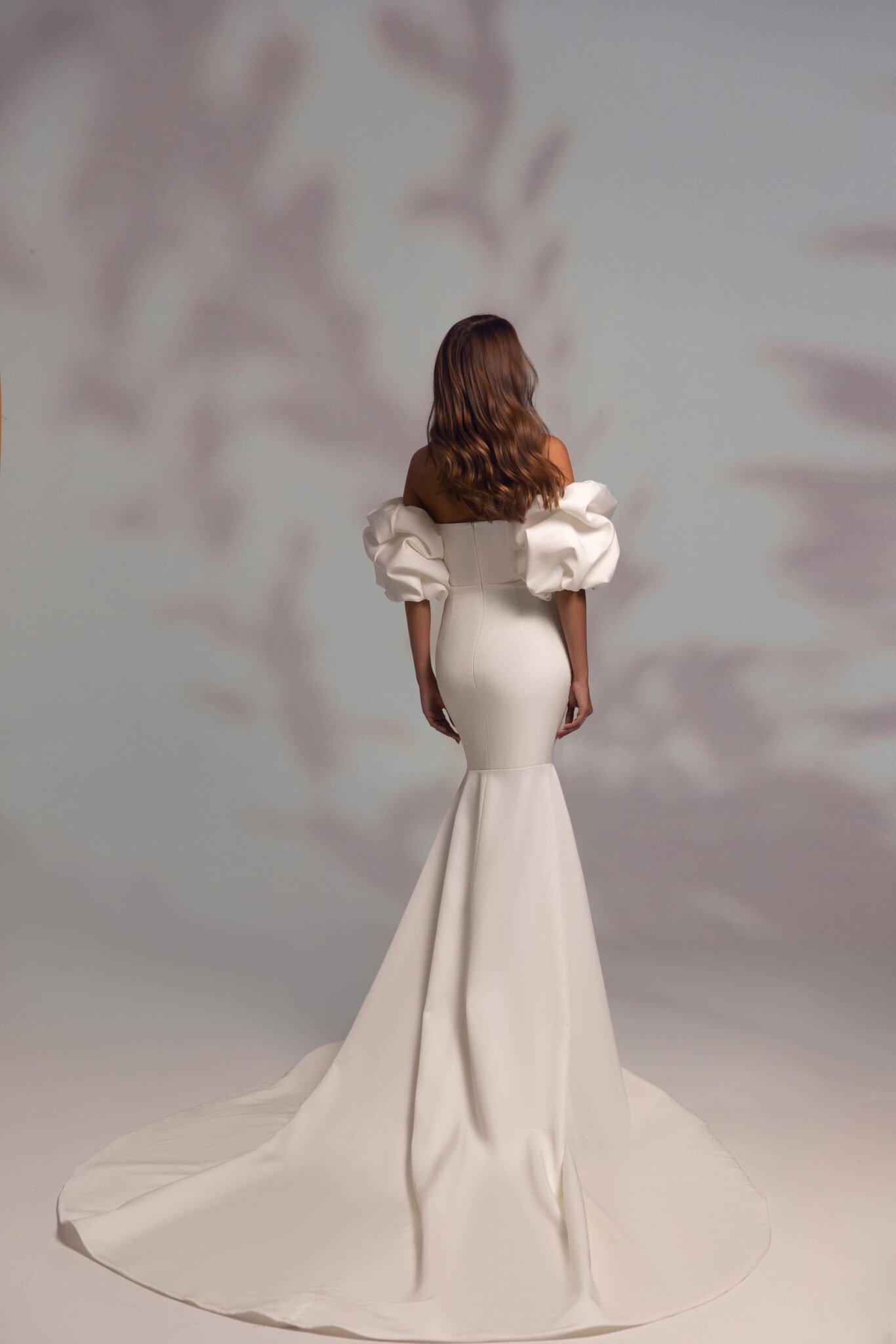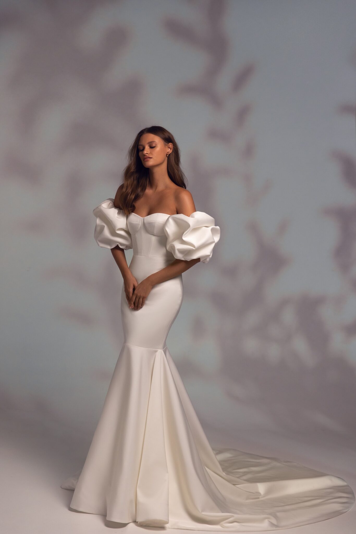 Незвичайна весільна сукня з фантастичними відстібними рукавами. Корсет без бретелей прикрашений чашками і кісточками, а на руках закріплені красиві об’ємні рукави. Спідниця облягає стегна і стає більш розкльошеною до колін, закінчуючись довгим шлейфом.