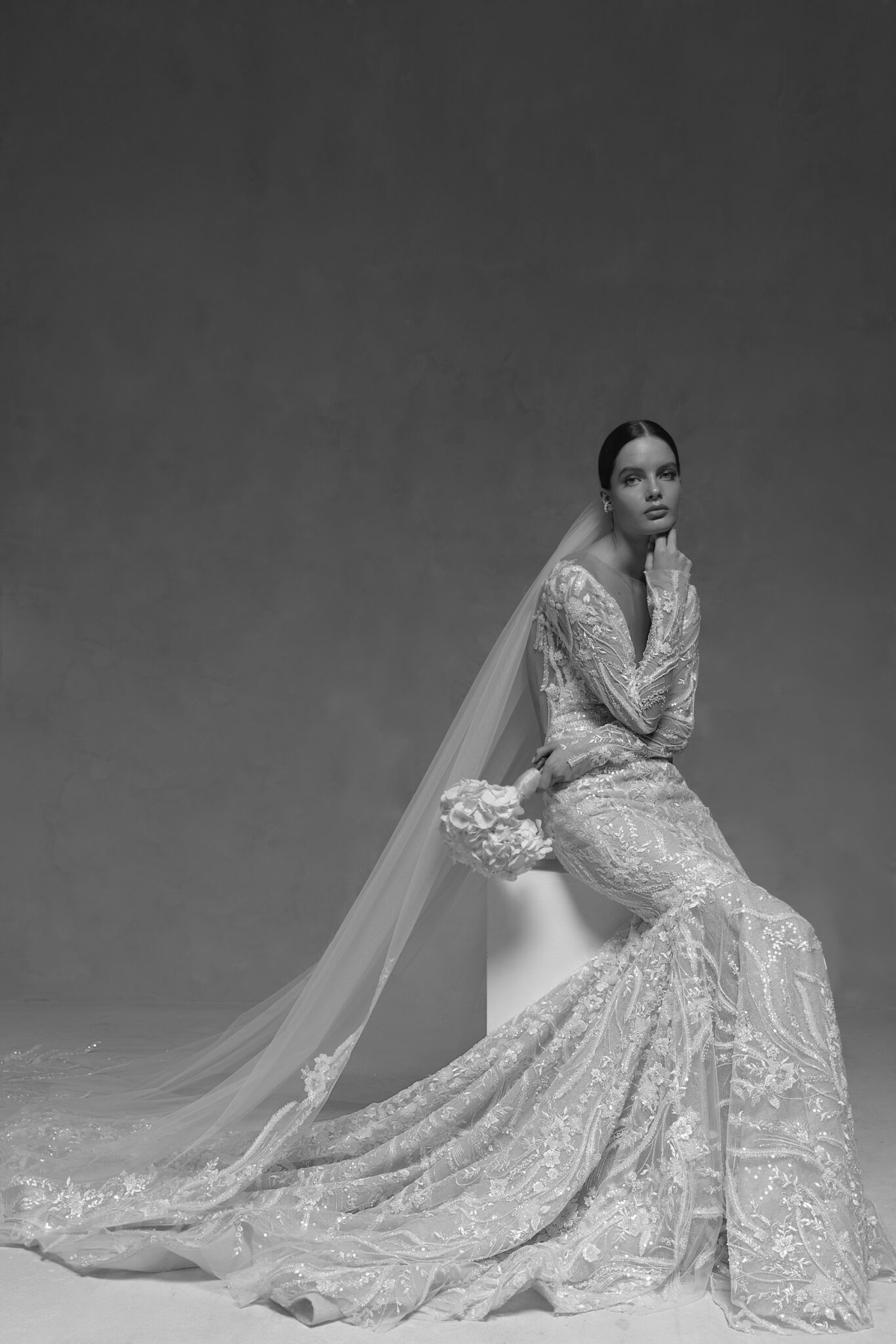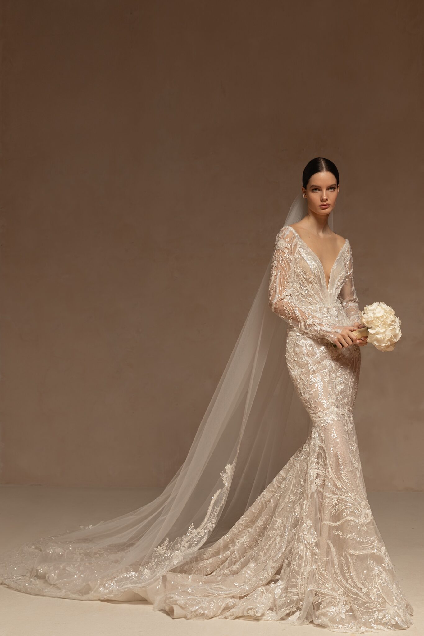 Розкішна одношарова весільна фата зроблена з прозорого тюлю та прикрашена чудовим вишитим мереживом з блискучими пайєтками. Ідеально пасує до весільної сукні WONÁ Concept Goddess. Доступна в катедральній довжині 3 метри.