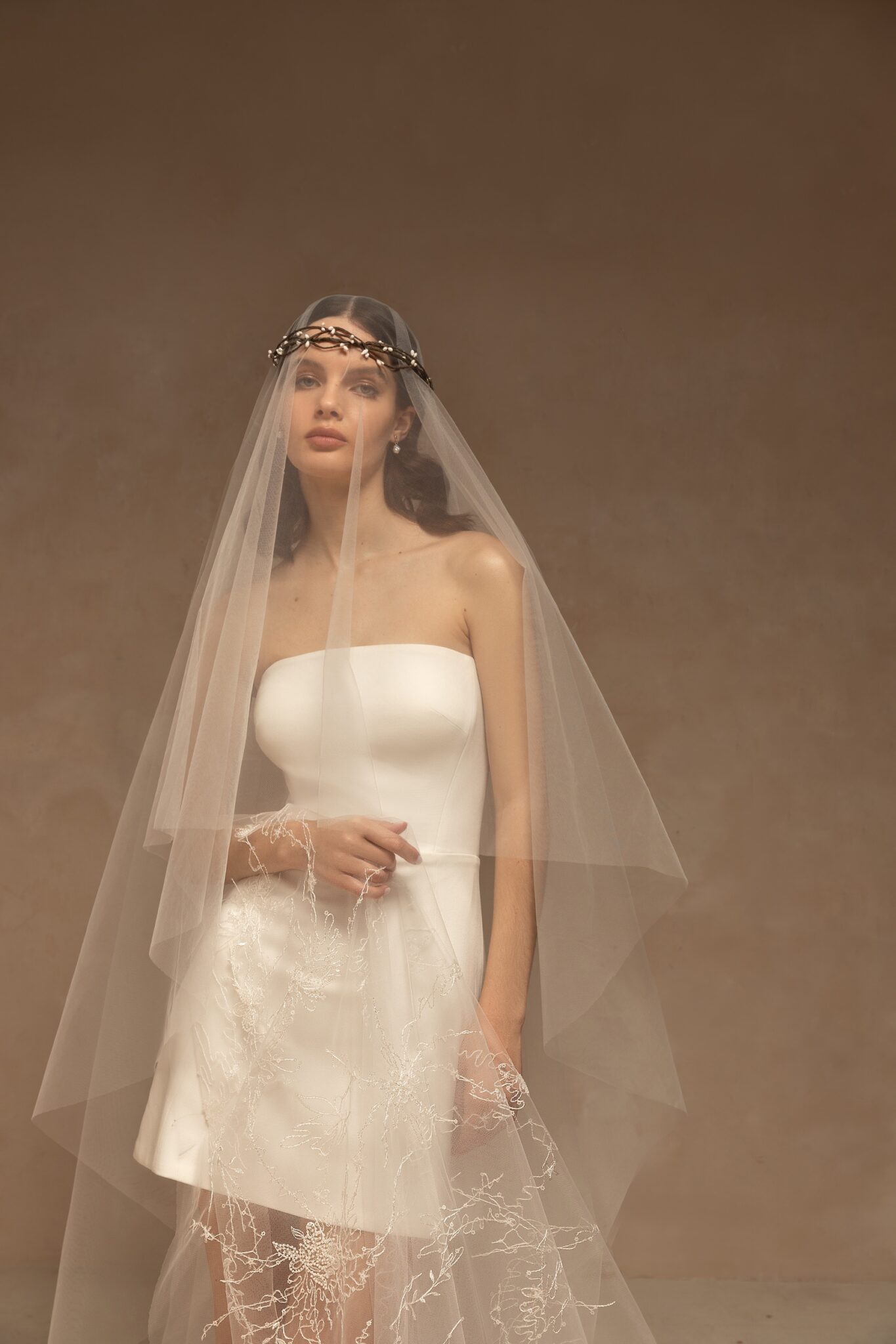 Ніжна одношарова весільна фата з тюлю, прикрашена блискучими аплікаціями з мережива, розташованими на шлейфі фати. Доступна в катедральній довжині. Закладена назад, фата утворить два шари.