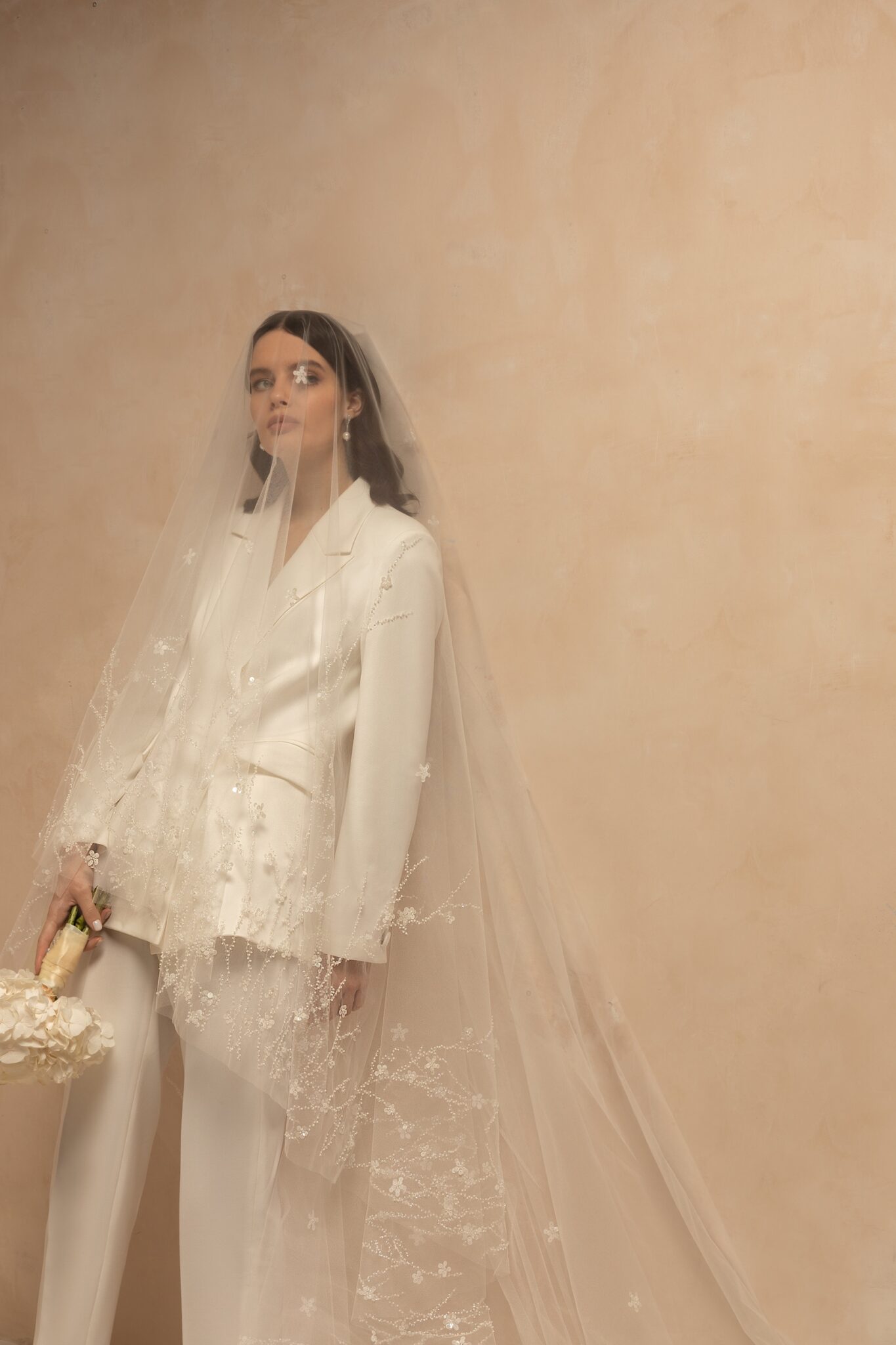 Романтична одношарова вуаль з тюлю, прикрашена вишуканою вишивкою зі стразами та квітковим малюнком. Доступна в катедральній довжині. Злегка згорнута, вуаль створить два шари.