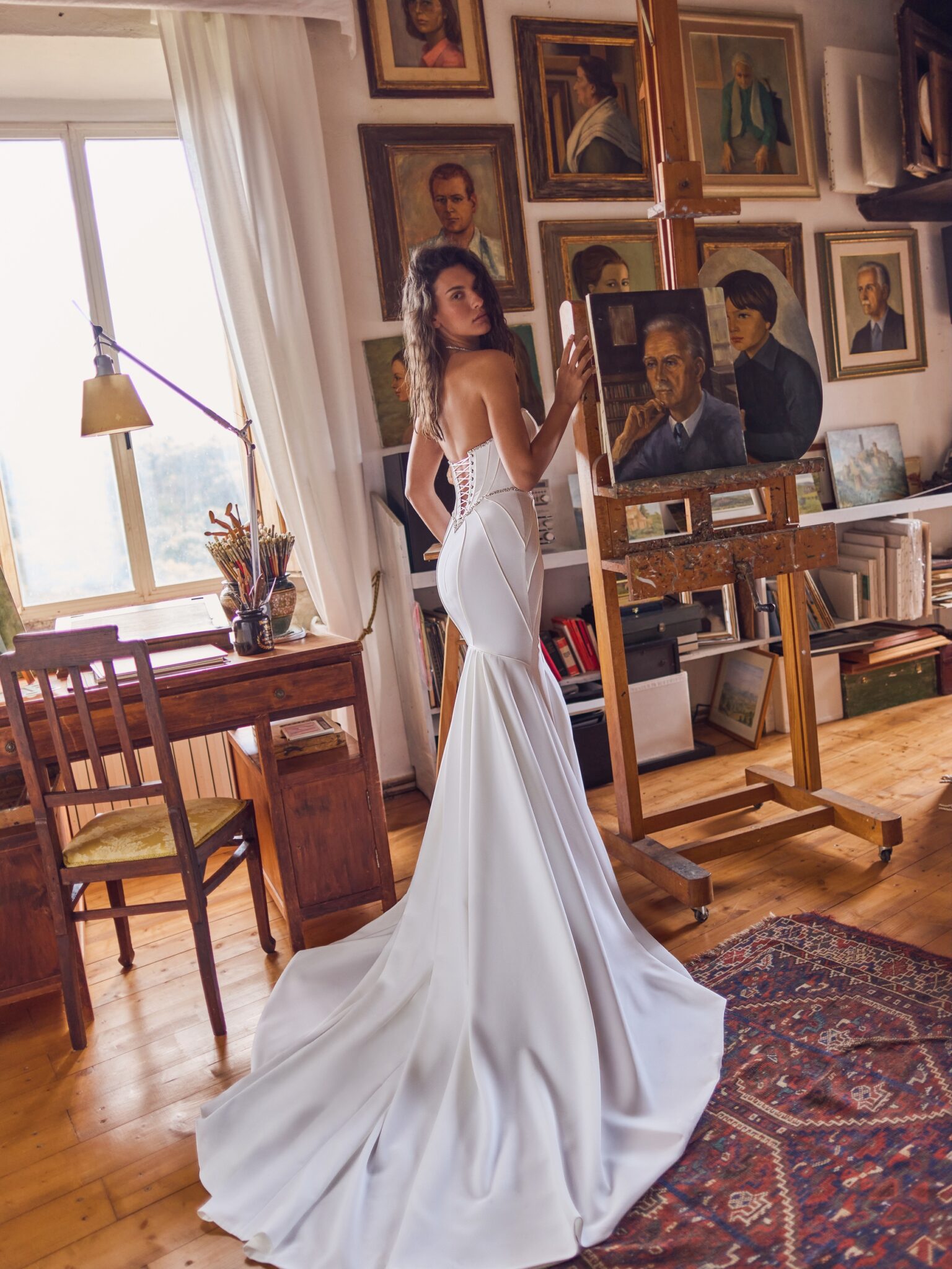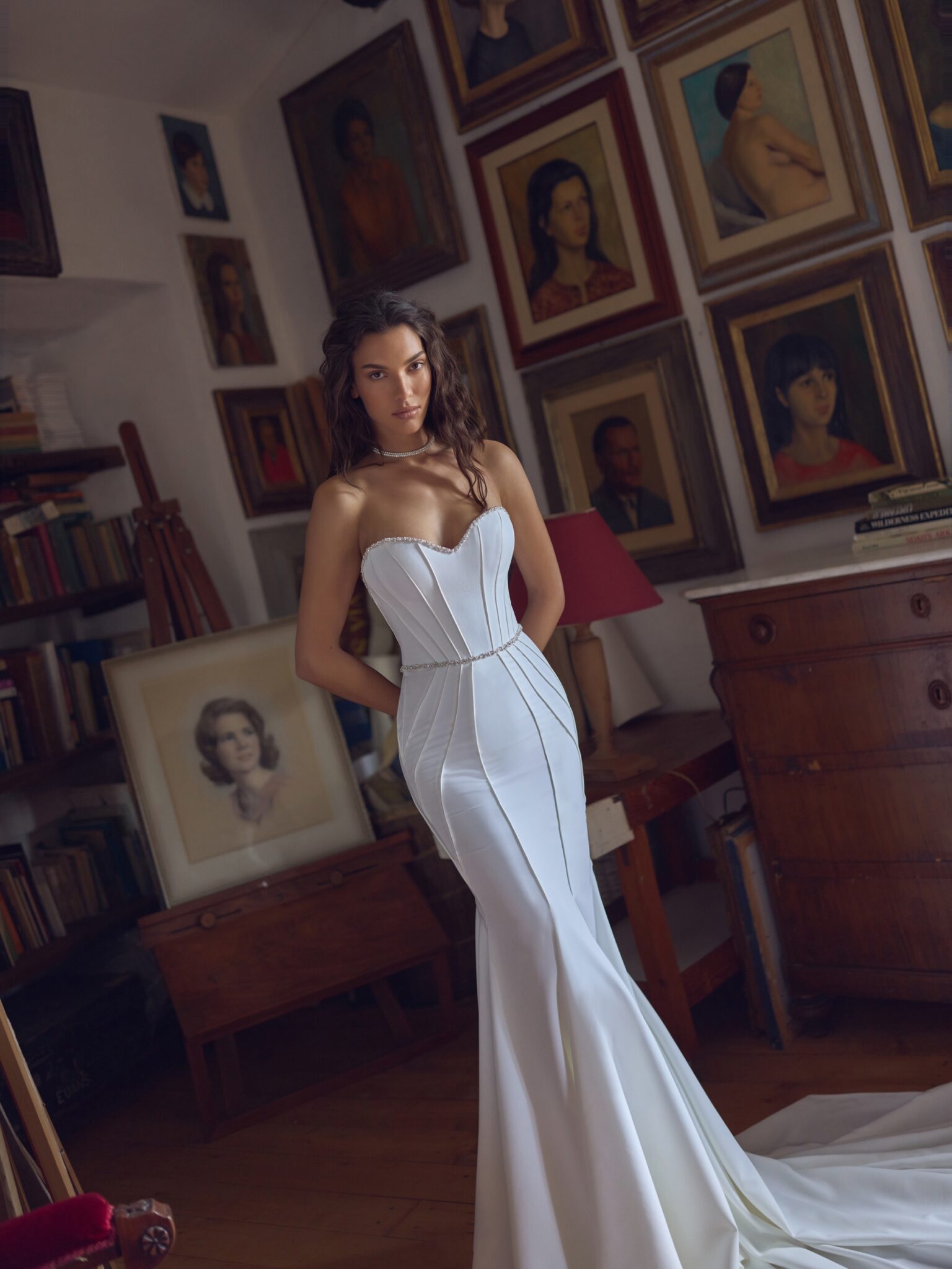 Сукня Odisea – вражаючий силует русалки, створений для того, щоб заявити про себе. Виготовлена з високоякісної костюмної тканини, сукня має скульптурний ліф з мерехтливими кришталевими прикрасами вздовж декольте та поясу, що додають нотку вишуканого блиску.