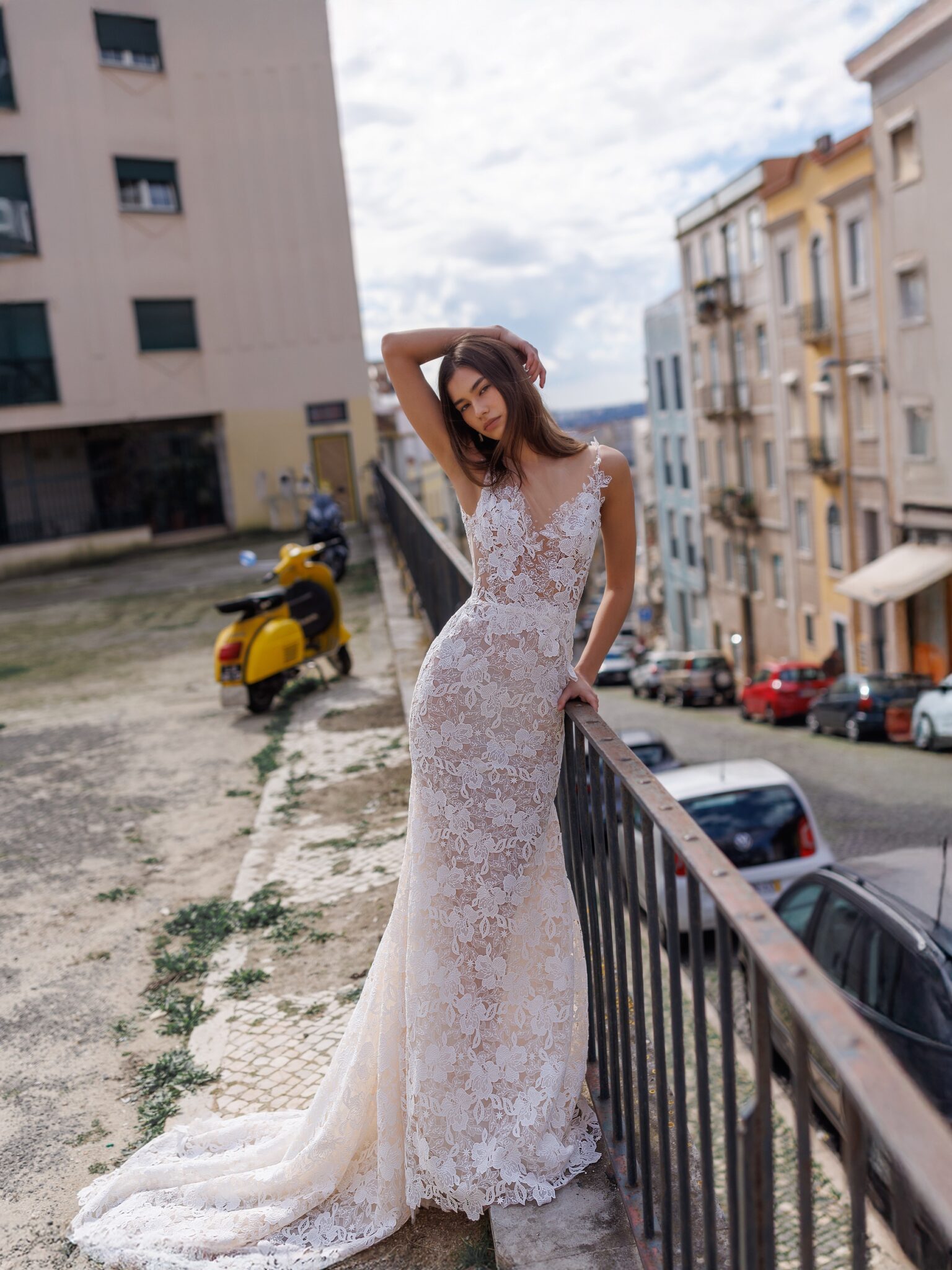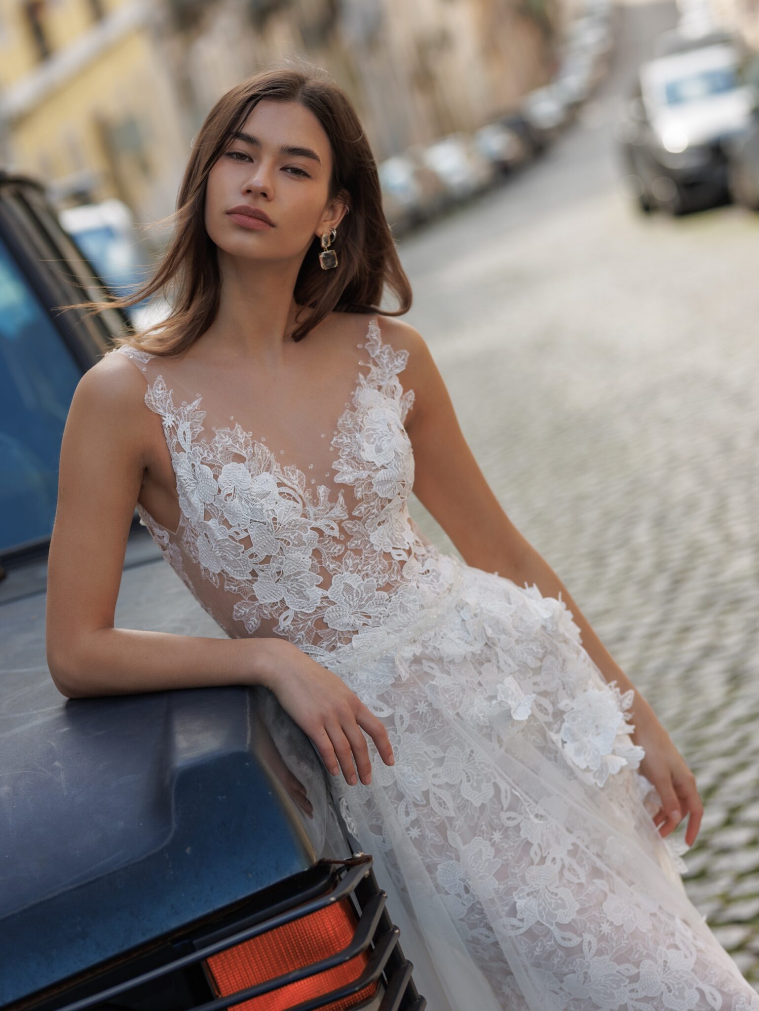 Виготовлена з вишуканого мережива, сукня має знімний фатиновий шлейф, прикрашений ніжними 3D квітковими аплікаціями, що додає образу вигадливості.