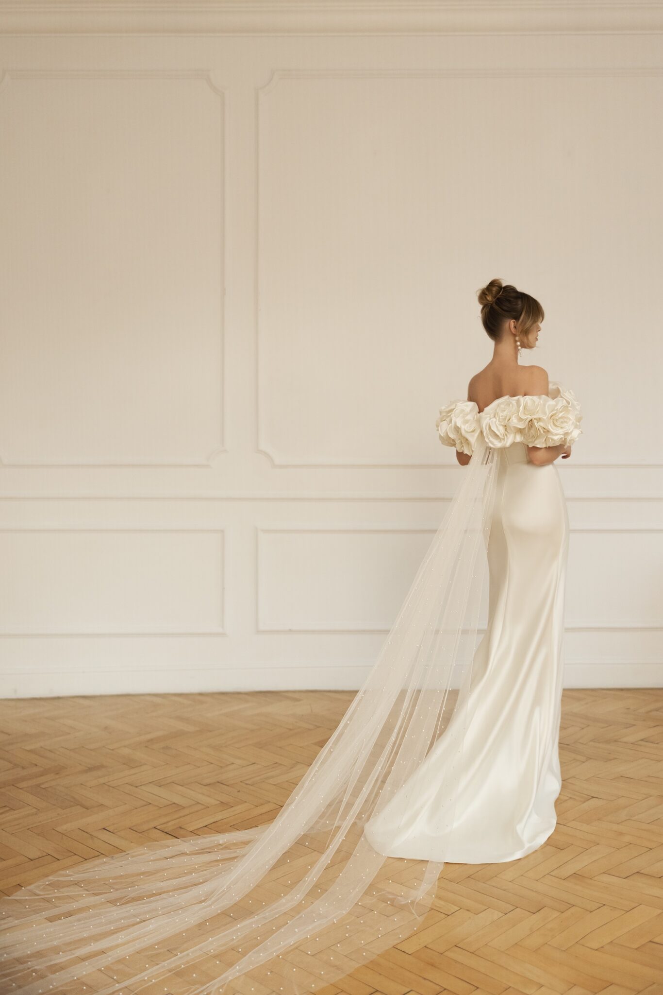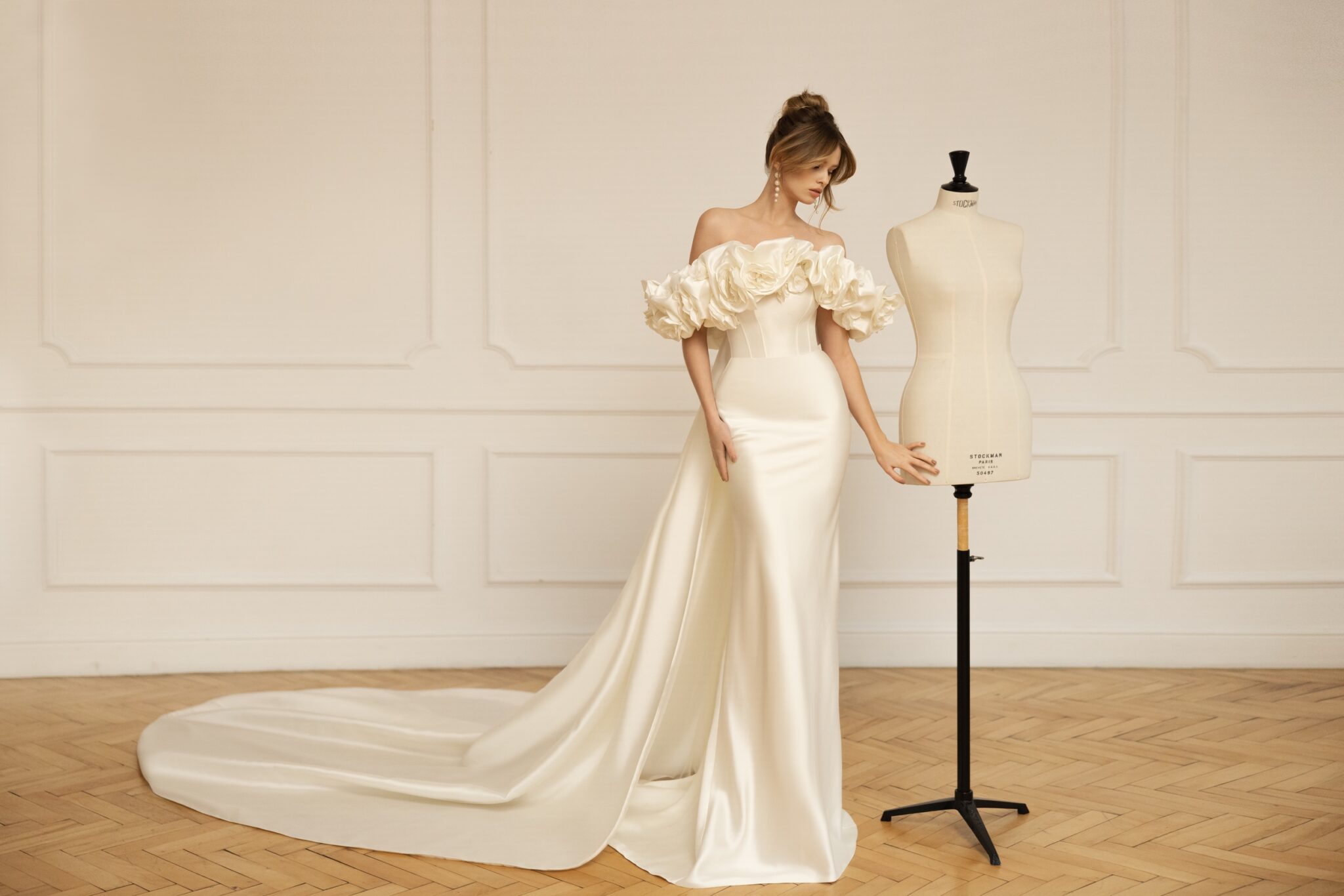 Ця розкішна сукня, виготовлена з шовку мікадо, створює класичний образ нареченої із сучасними нотками. Родзинкою сукні є її знімна накидка з відкритими плечима, виготовлена з численних великих троянд, які спускаються від вирізу спереду до спинки. Красивий приталений ліф переходить у спідницю, яка підкреслює фігуру нареченої. Сукня має два варіанти відстібного шлейфу – стильний з шовку мікадо, або невагомий з фатину, прикрашений штучними перлами. Шлейф застібається на спині і візуально витягує силует