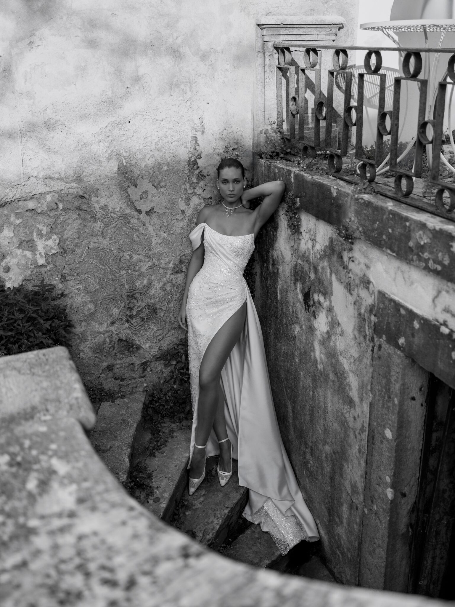 Сукня в стилі русалка з глибоким розрізом на нозі. Виготовлена з атласу та оздоблена мерехтливим мереживом, з драпіруванням на корсеті. Мереживо додає нотку гламуру до загального вигляду, надаючи сукні елегантності та вишуканості. Ідеально підходить для особливих випадків, коли ви хочете виділитися грацією та стилем.
