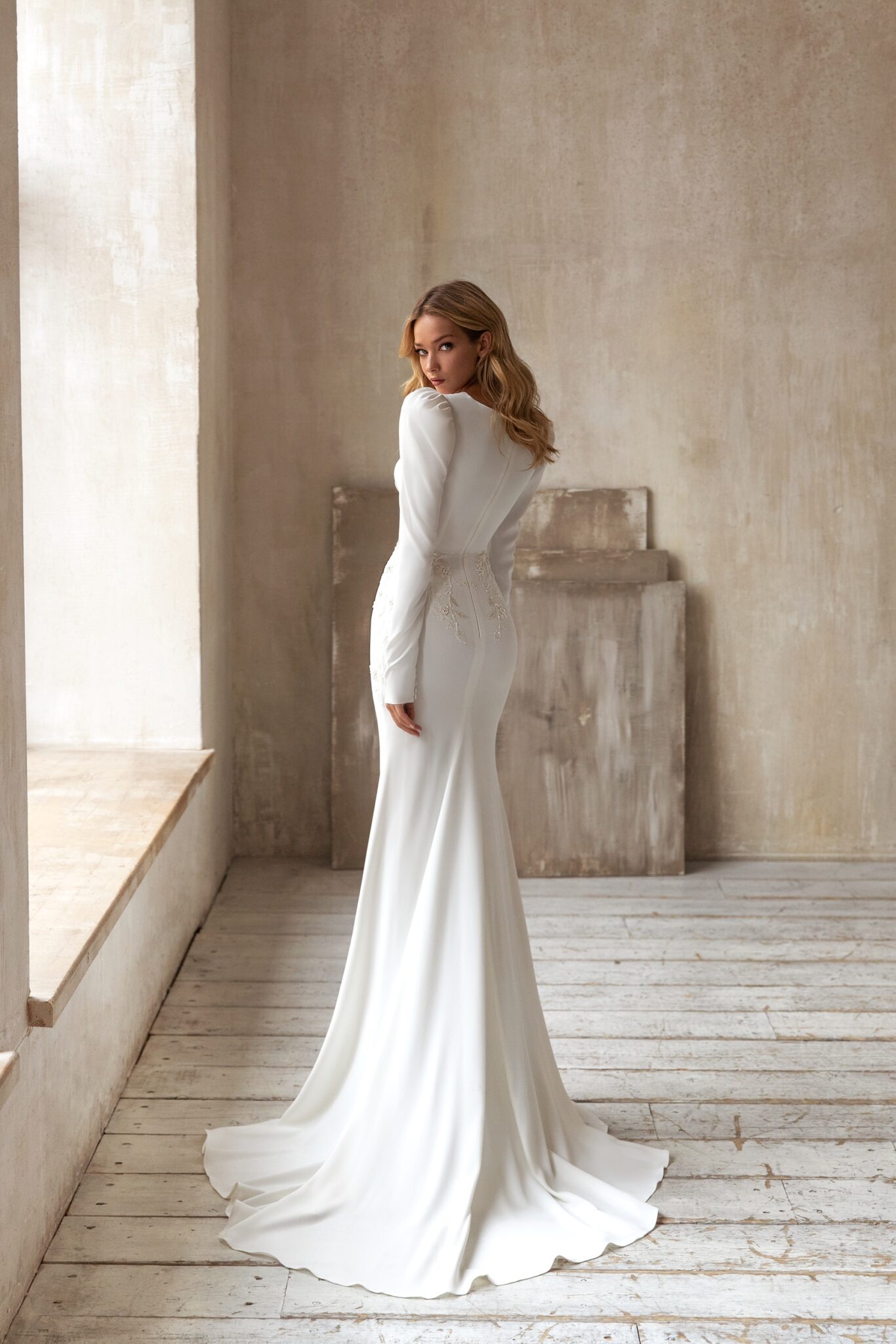 Selest – це весільна сукня у стилі “рибка” з чудовим дизайном. Сукня прикрашена V-подібним вирізом знизу. Довгі вільні рукава прикрашені маленькими гудзиками. Від грудей до талії сукня прикрашена вишивкою. Квіти та листки прикрашені намистинами, пайетками та кристалами. Спідниця має короткий шлейф.