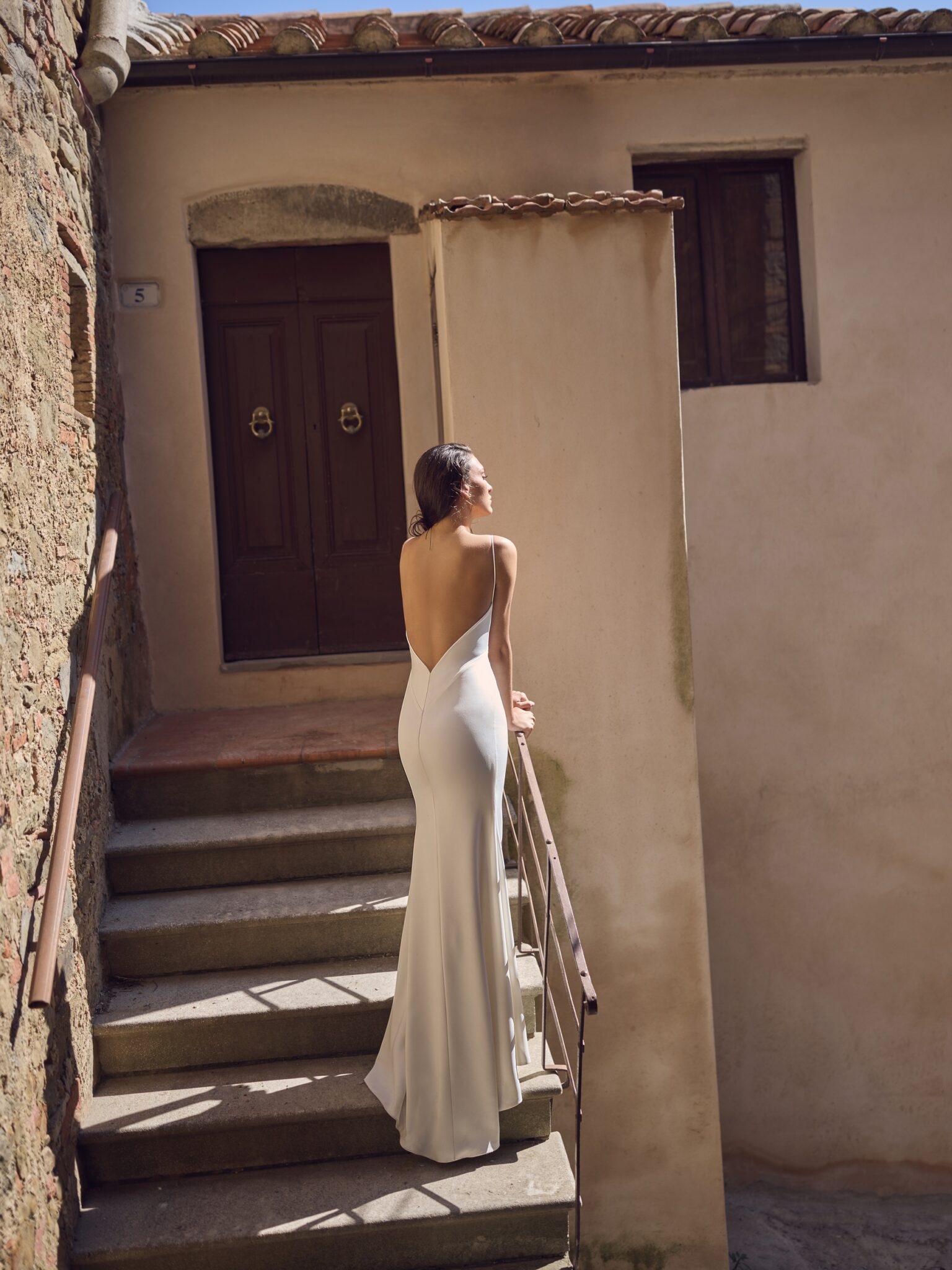 Сукня виготовлена з легкого атласу, що елегантно струмує по тілу. Вона має зухвалий високий розріз і відкриту спину, врівноважену тонким шлейфом, що додає їй витонченості. Вишукана і водночас смілива – Sparta створена для сучасних муз, які керують кімнатою.
