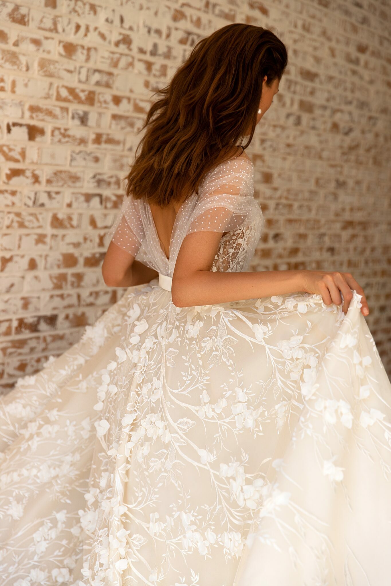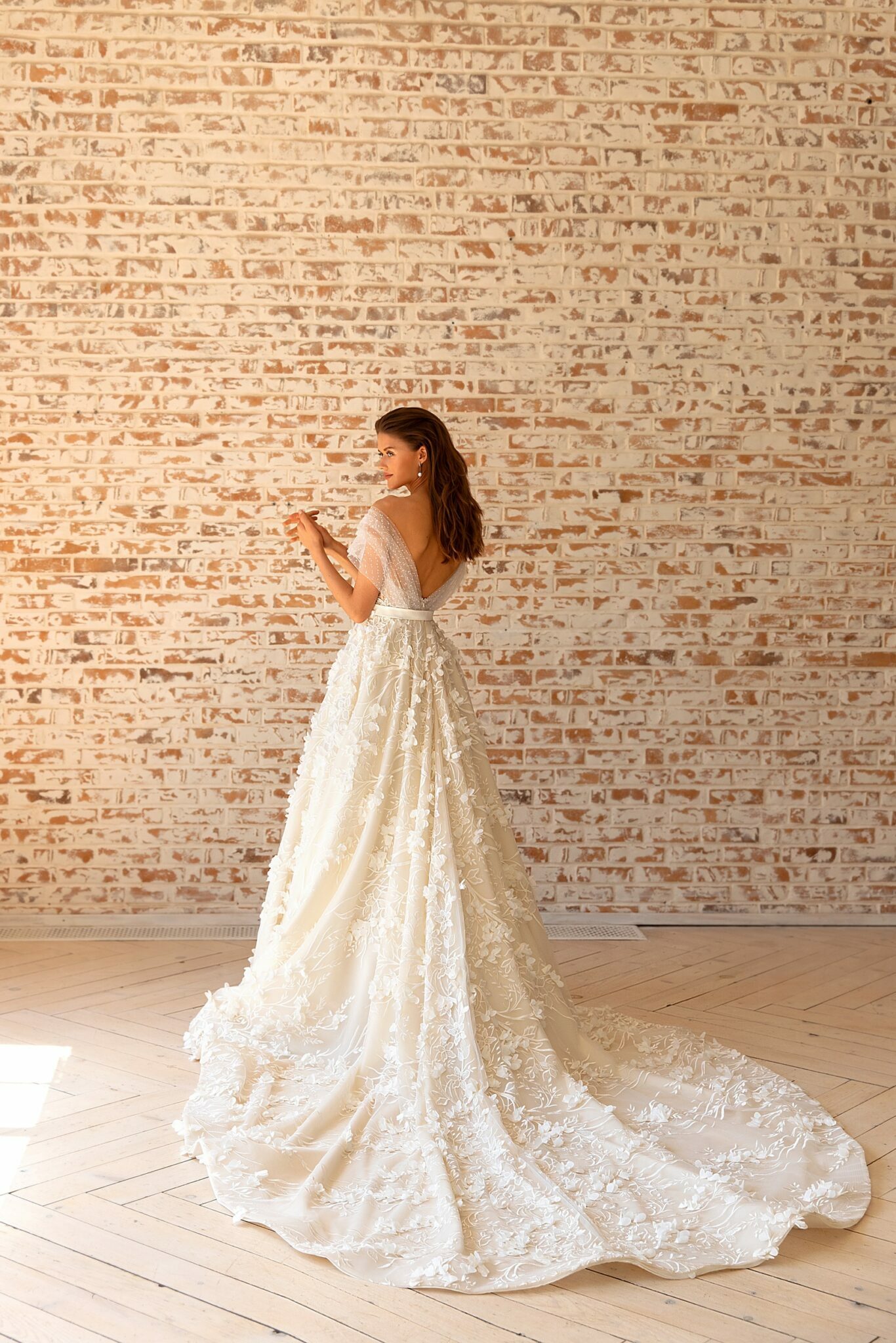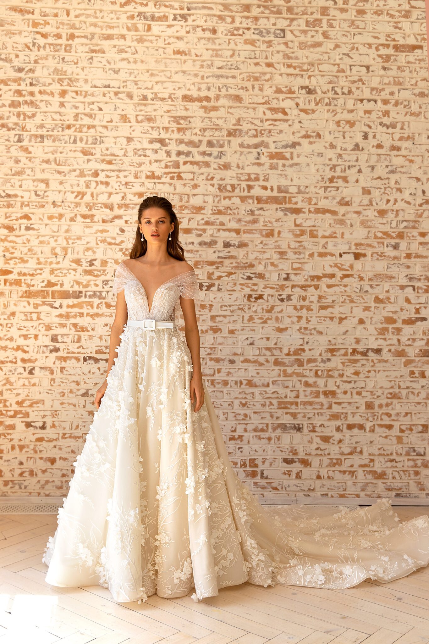 Чудовий весільний наряд – це справжній жіночий наряд. Великі мереживні квіти прикрашають всю сукню. Ці квіти вишиті блискучими намистинами. Сукня прикрашена короткими рукавами та глибоким V-подібним вирізом на спині. Маленький пояс підкреслює талію нареченої. Тонкі смужки на плечах та срібні намистини привертають увагу. Довгий шлейф виглядає захоплююче.