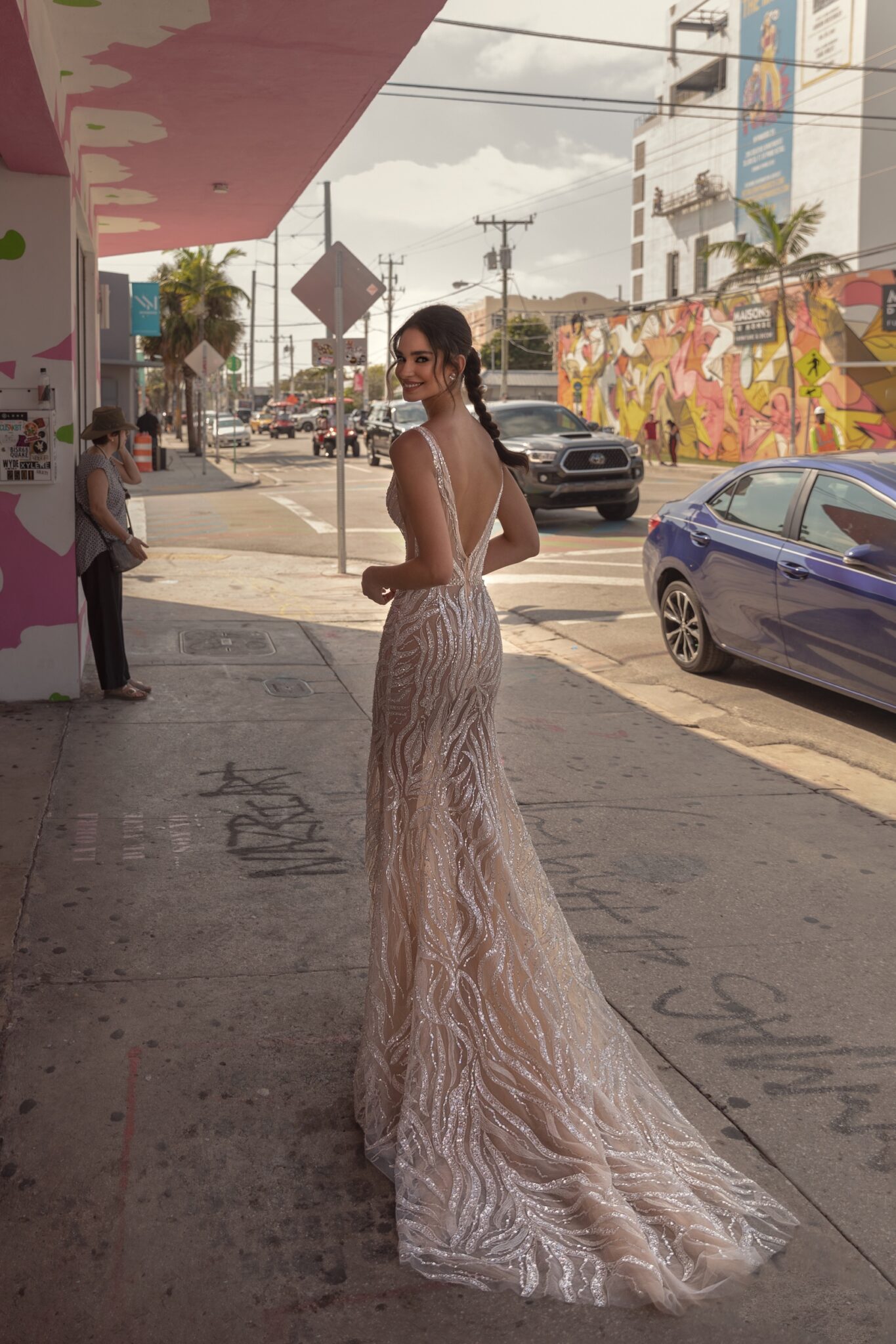 Tilda – весільна сукня у стилі “рибка” з довгим шлейфом. Сукня зроблена з бежевого вуалю з білим квітковим орнаментом. Вона повністю вишита намистинами і блискітками. V-подібний виріз знизу та глибокий виріз на спинці сукні додають ніжності. Є розрізи під пахвами. Пояс з бісеру акцентує талію.