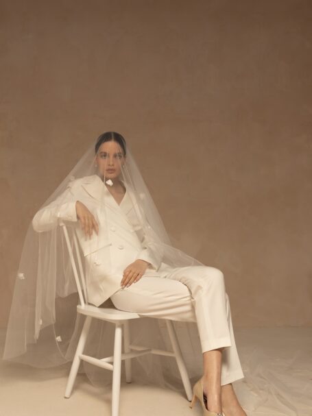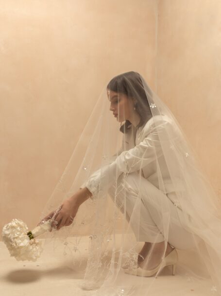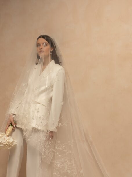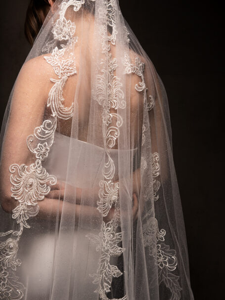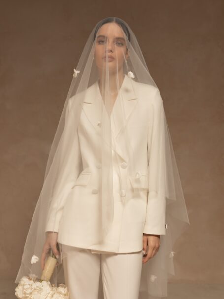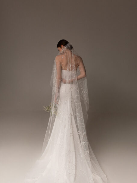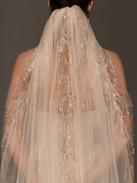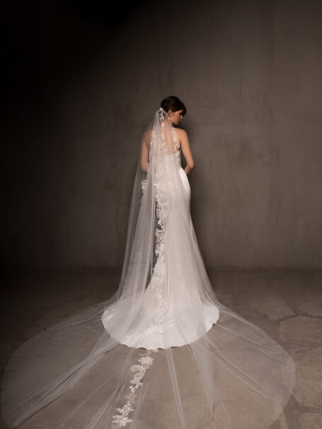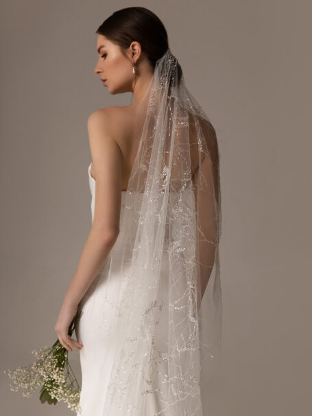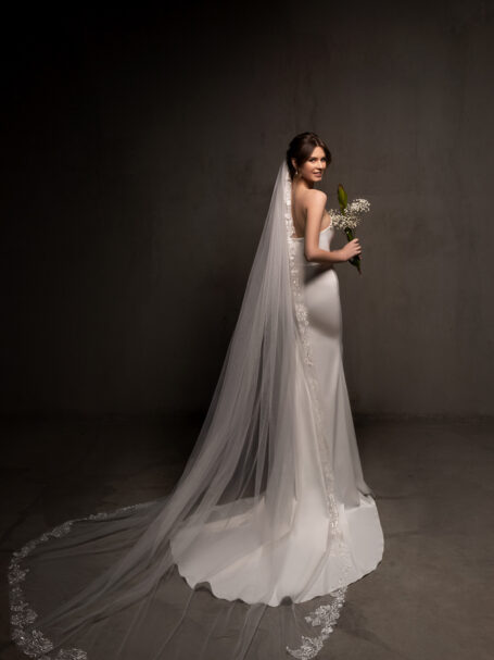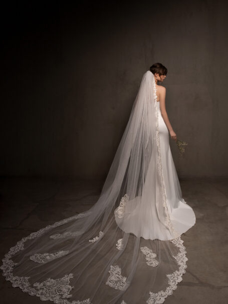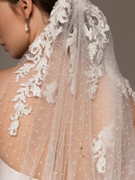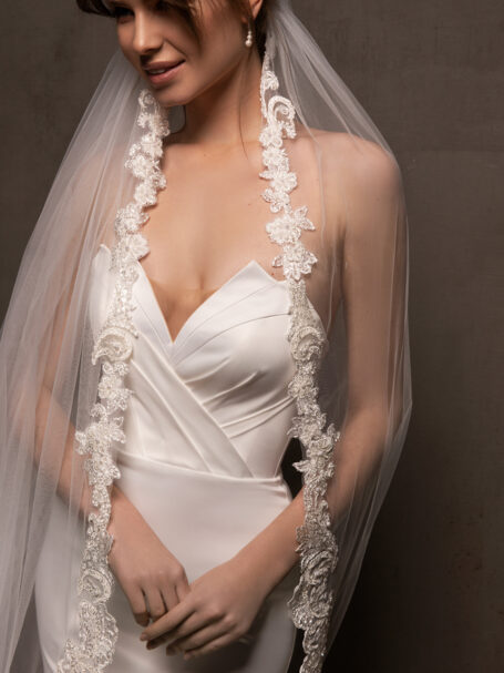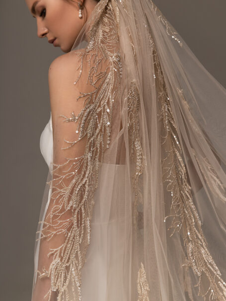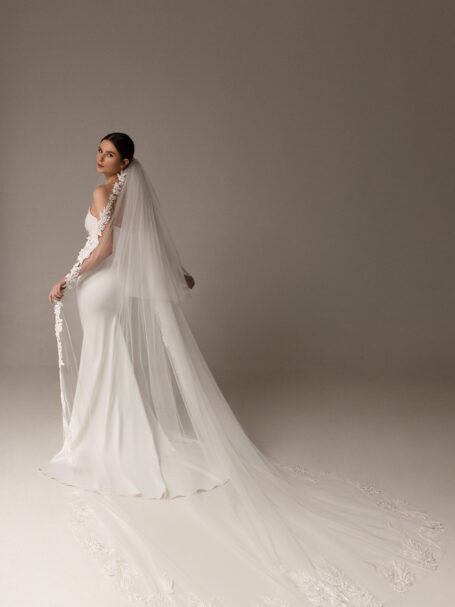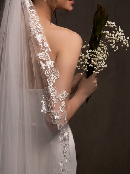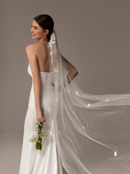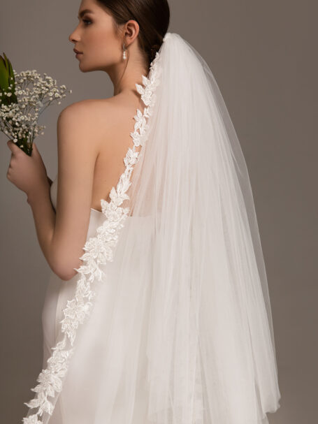 Чарівна і лаконічна фата для нареченої, виготовлена з гладкого тюлю та прикрашена великими аплікаціями у вигляді квіткових мотивів. Доступна у катедральній довжині.
