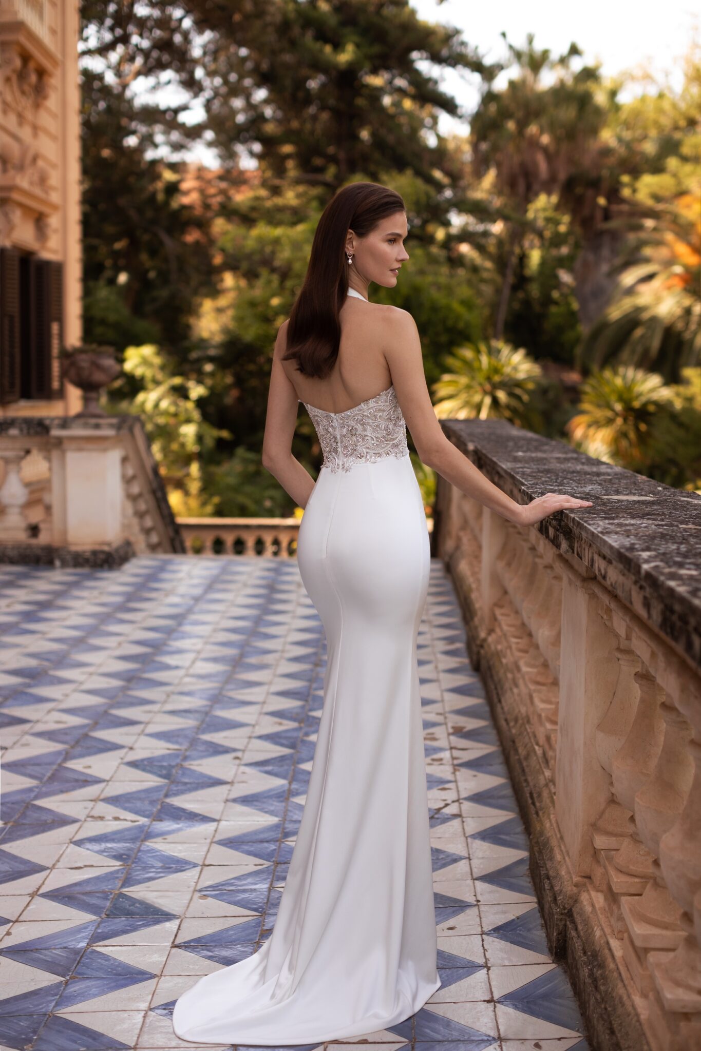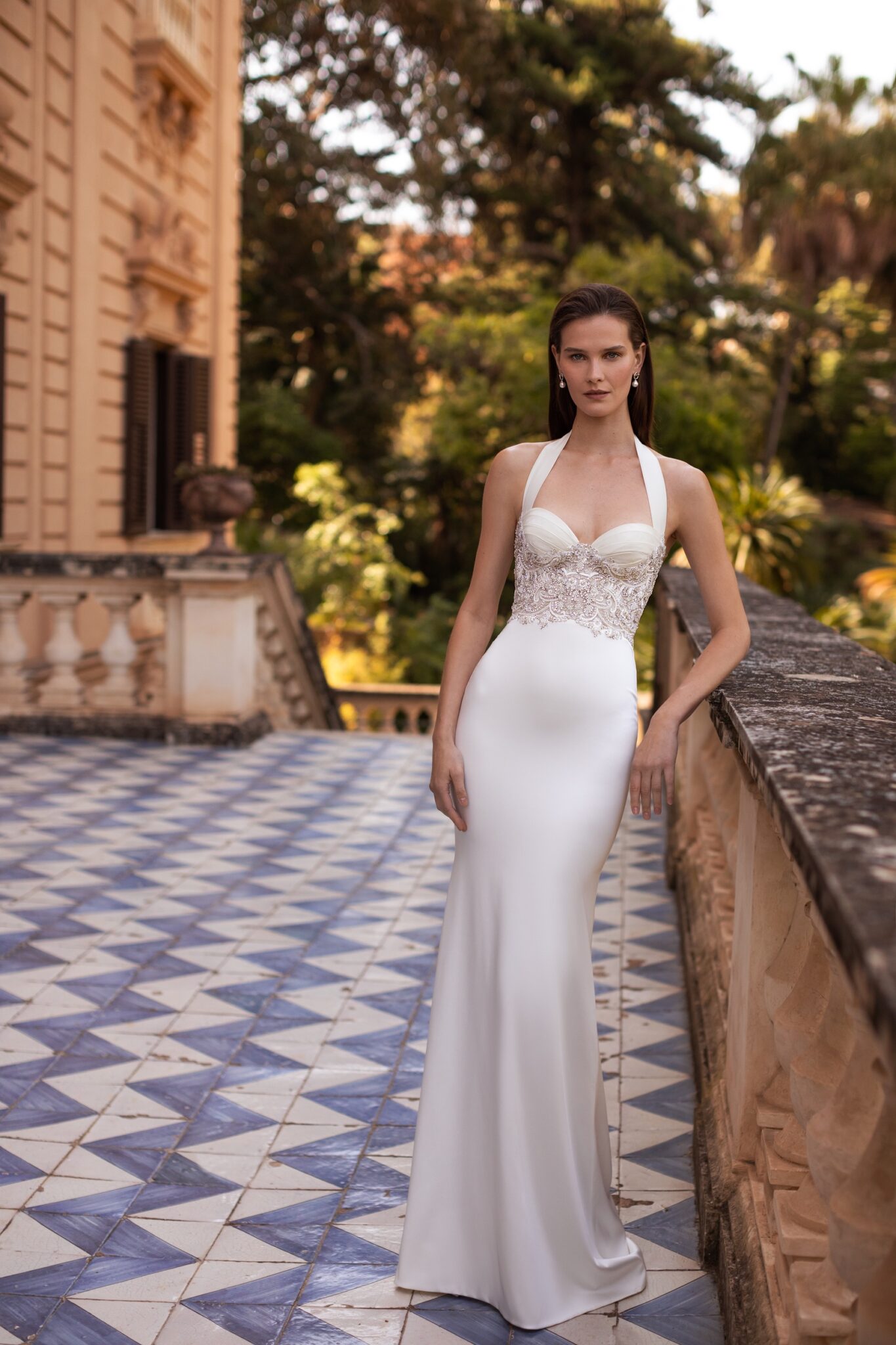 Ця сукня в стилі ретро має облягаючий фасон русалки, катедральний шлейф та серцевидний виріз корсету з мережива і широким ремінцем навколо шиї, що надає їй сексуальності та вишуканості. Якщо виконана в білому або сріблястому вишивці на особливому тюлі, така сукня доповнюється чудовою класичною сатиновою додатковою спідницею, що створює гладкий силует.