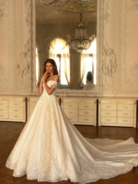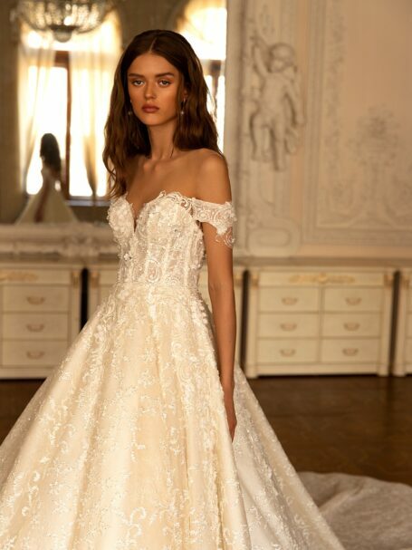 У весільній сукні Yuna ви почуватиметеся як принцеса. Поєднання тканин та силуету “А-силует” виглядають чудесно. Корсет та глибокий виріз прикрашені мереживними мотивами. Той самий візерунок знаходиться на спідниці, виготовленій з вуалі. Великий виріз та вуальні рукава доповнюють весільну сукню.