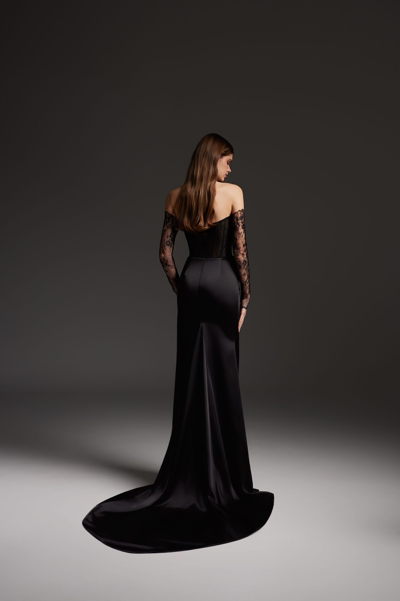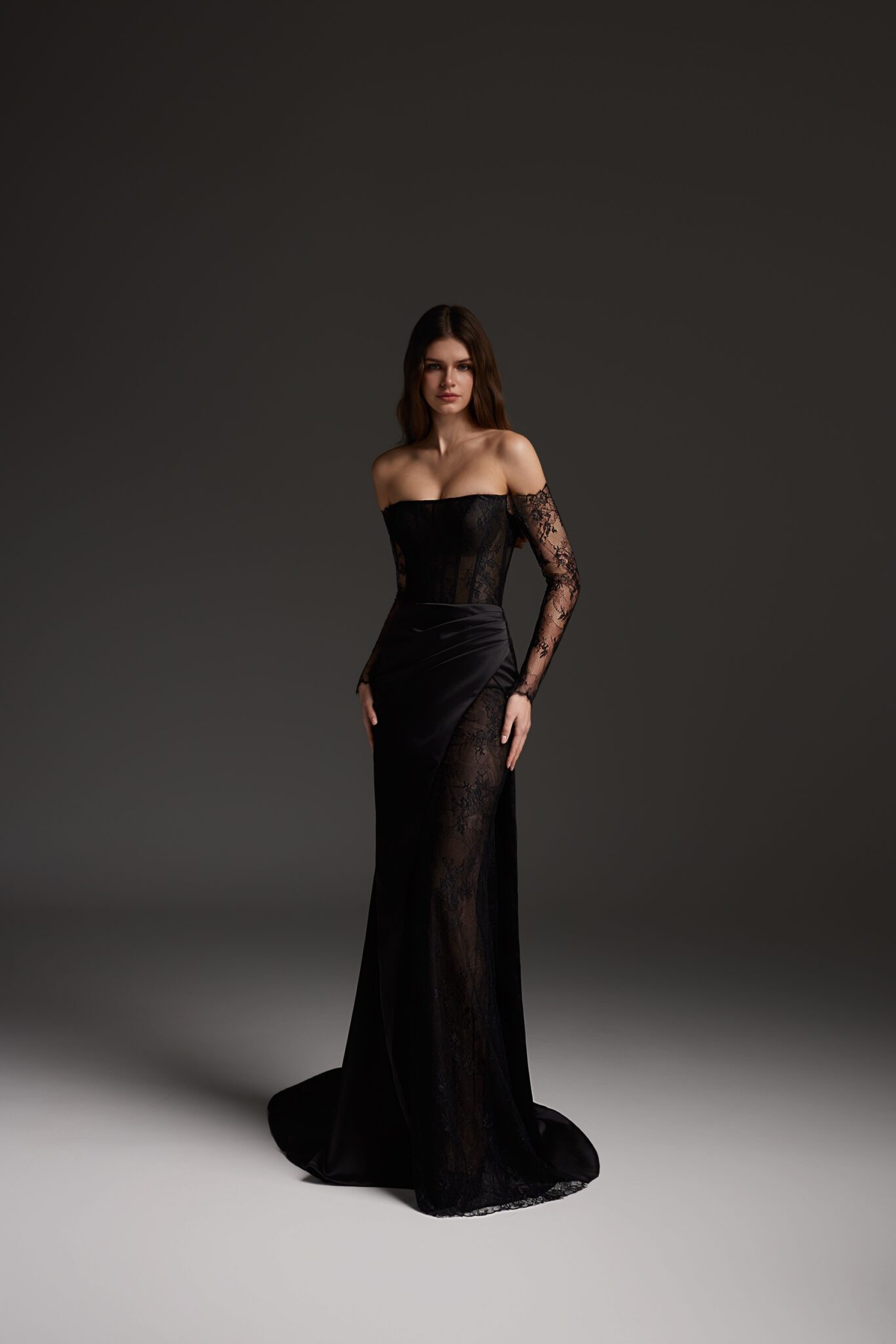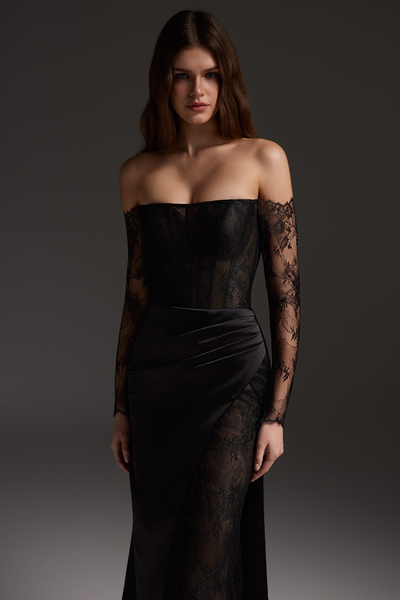 Романтична сукня 2706 прямого крою виконана з сатину з мереживними вставками. Корсетний верх з рівним вирізом, довгі мереживні рукави та мереживна вставка в розпірці додають образу жіночності та елегантності. Доступна в чорному кольорі.
