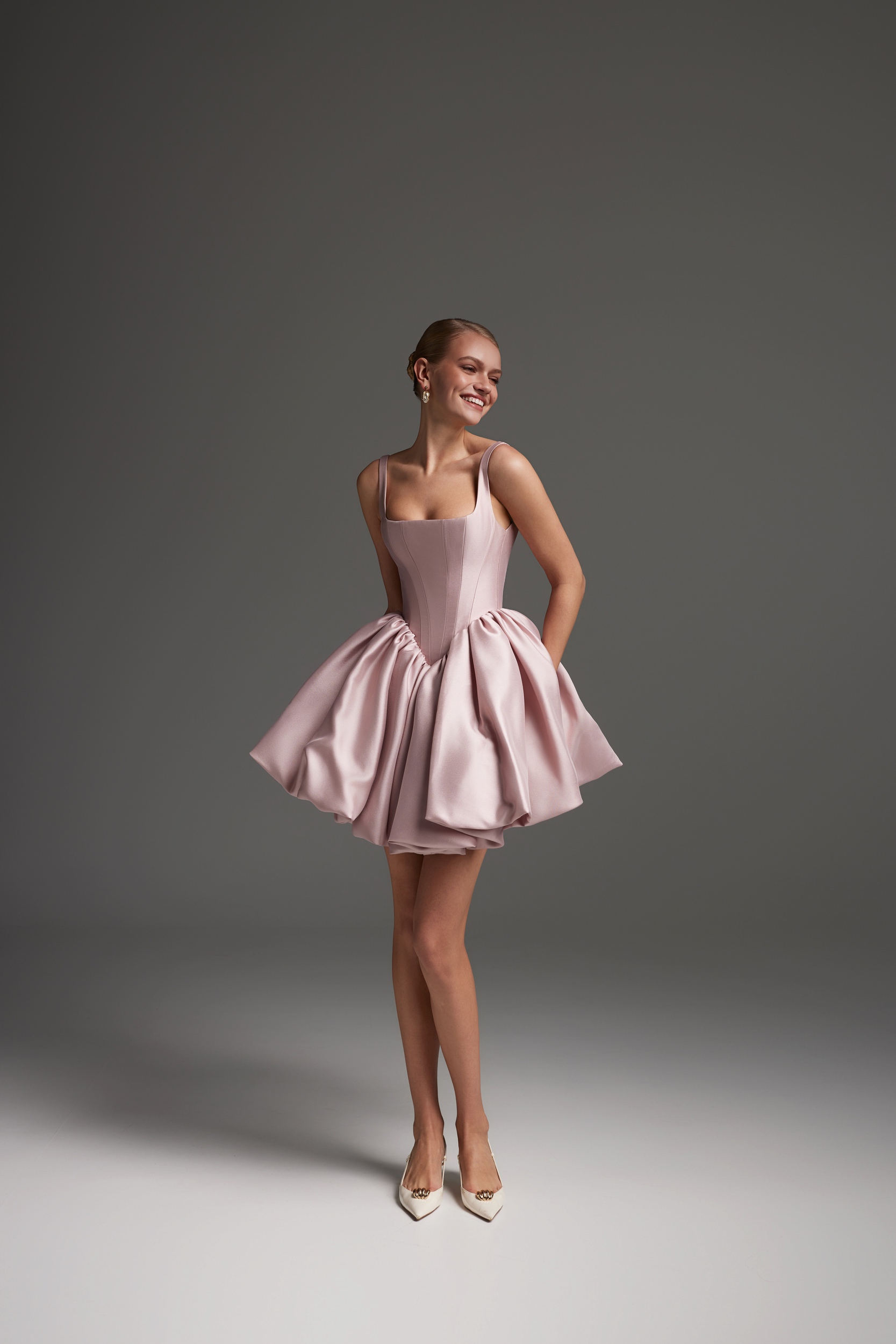 Міні-сукня з гладкого мікадо на базі корсету зі шнурівкою. Прямий виріз і прості бретелі додають елегантності, а пишна спідниця — легкості та грайливості. Доступна в чорному, айворі та рожевому.