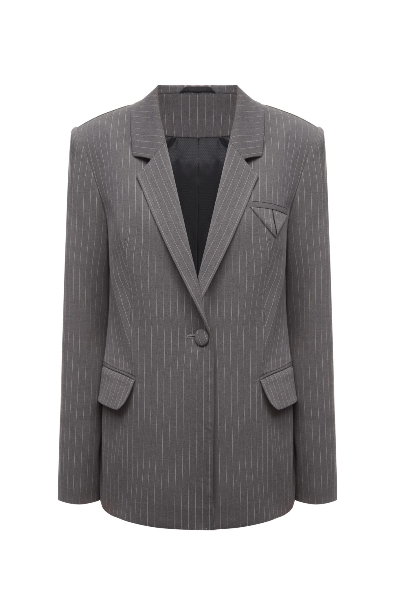Цей темно-сірий піджак у смужку додає чіткого, вишуканого штриху до будь-якого вбрання завдяки своєму вільному крою та класичним смужкам. Він ідеально поєднується зі смугастим топом і спідницею-шортами в тон, створюючи вишуканий і скоординований образ. Чисті лінії та позачасовий дизайн роблять його елегантним доповненням до будь-якого шикарного ансамблю.