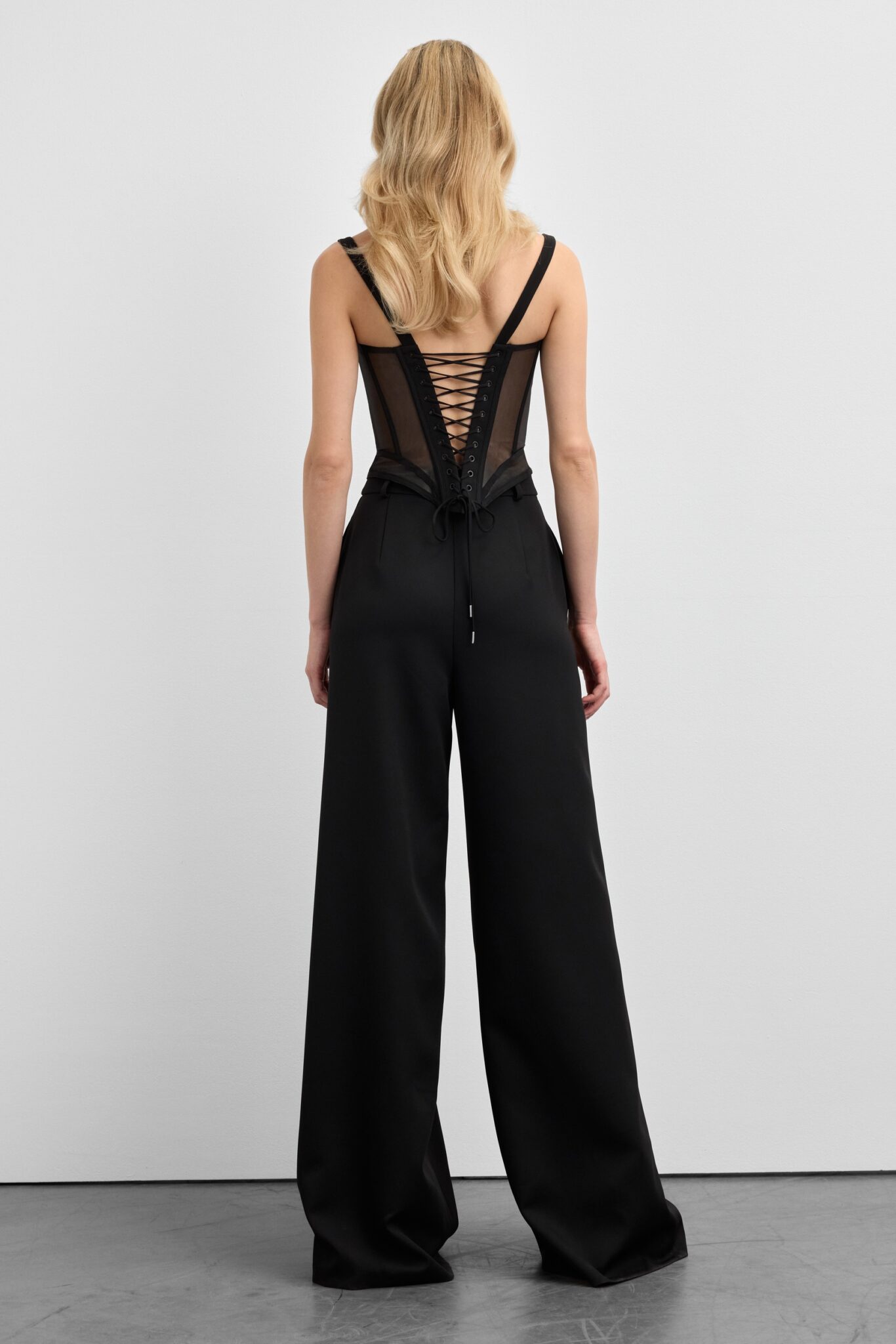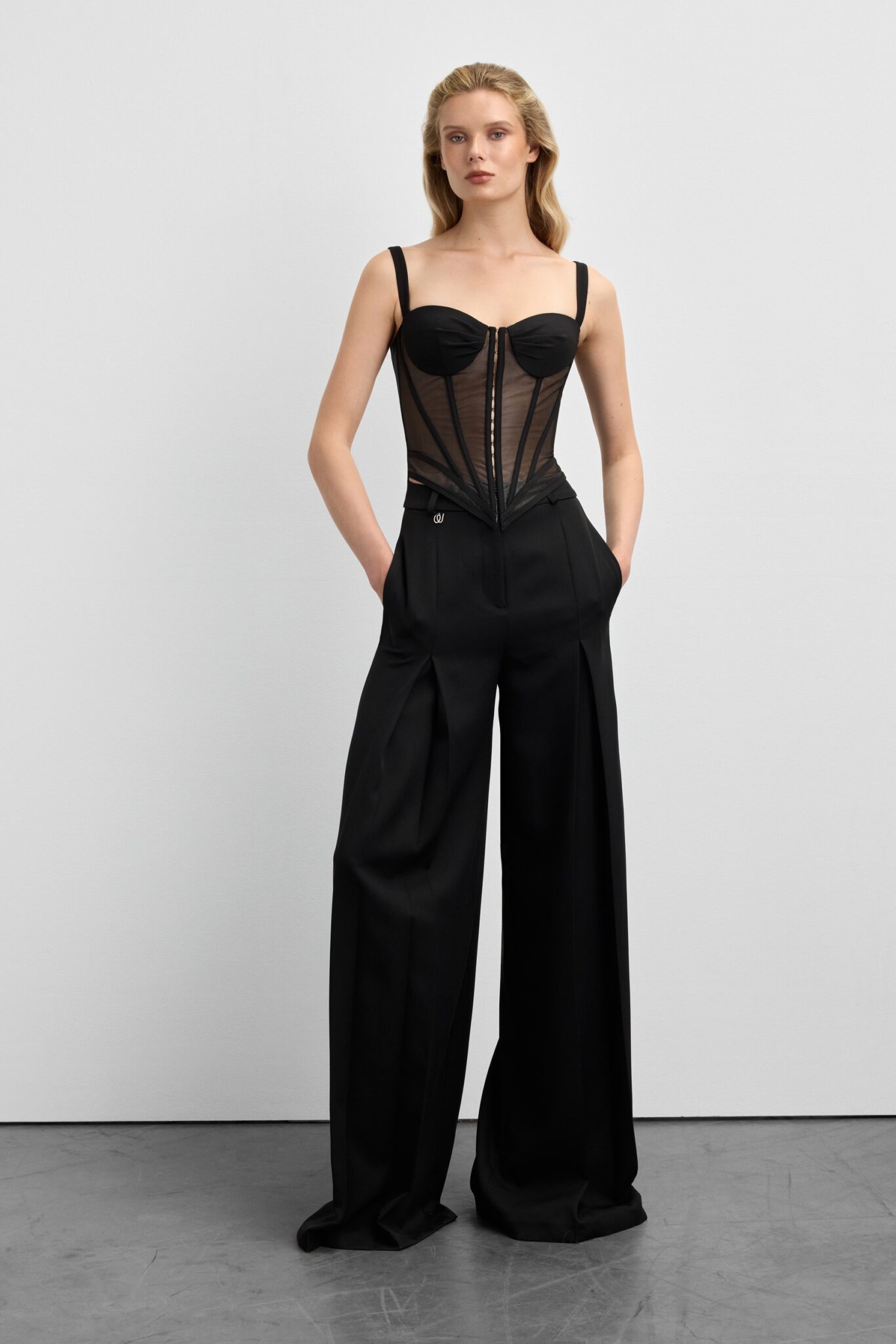 Неліновані широкі штани з високою талією, защипами та фірмовою прикрасою W на поясі. Легка текстура без підкладки робить їх ідеальними для повсякденного стилю. Доступні у чорному та молочному кольорах.