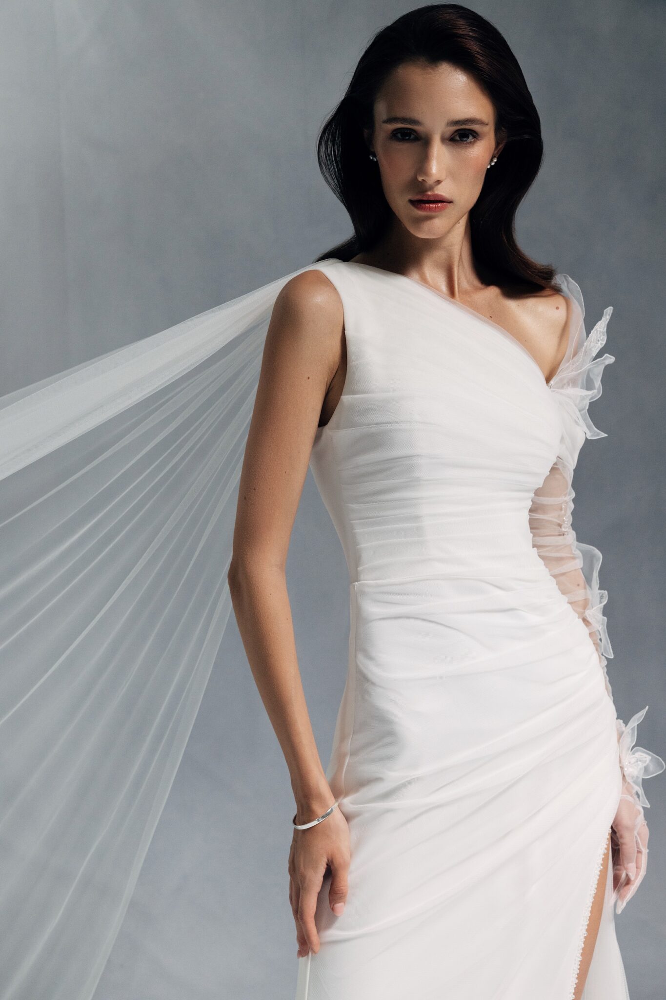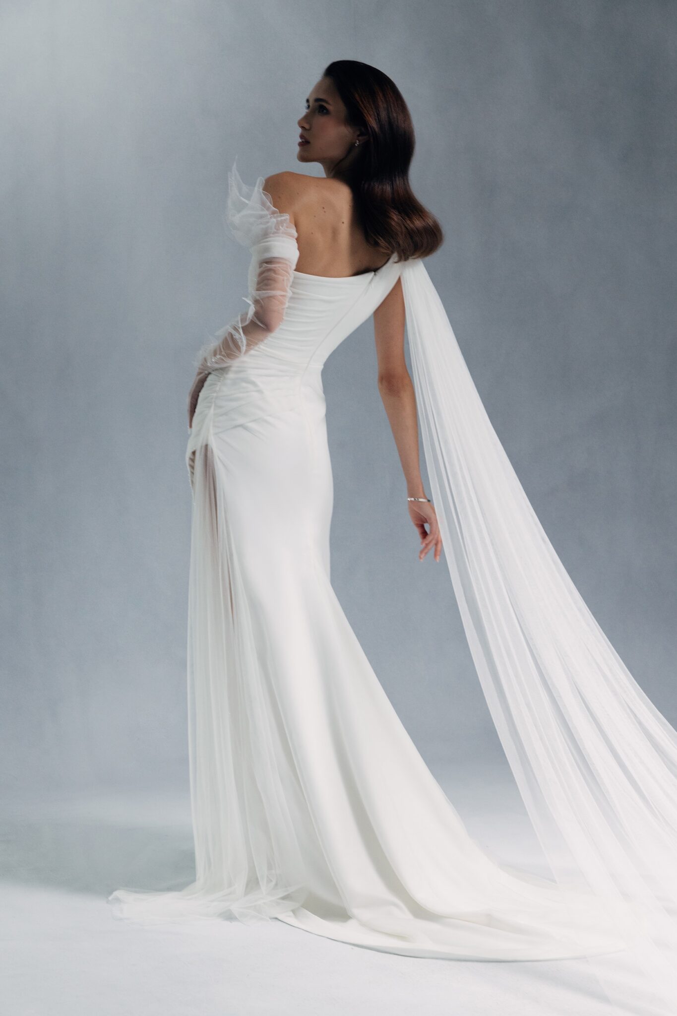 Елегантно драпірована асиметрична сукня з вирізом на одне плече, доповнена прозорими фатиновими рукавами. Один рукав повторює драпірування сукні, а гофрована спідниця та боковий розріз додають ідеального завершального штриху.
