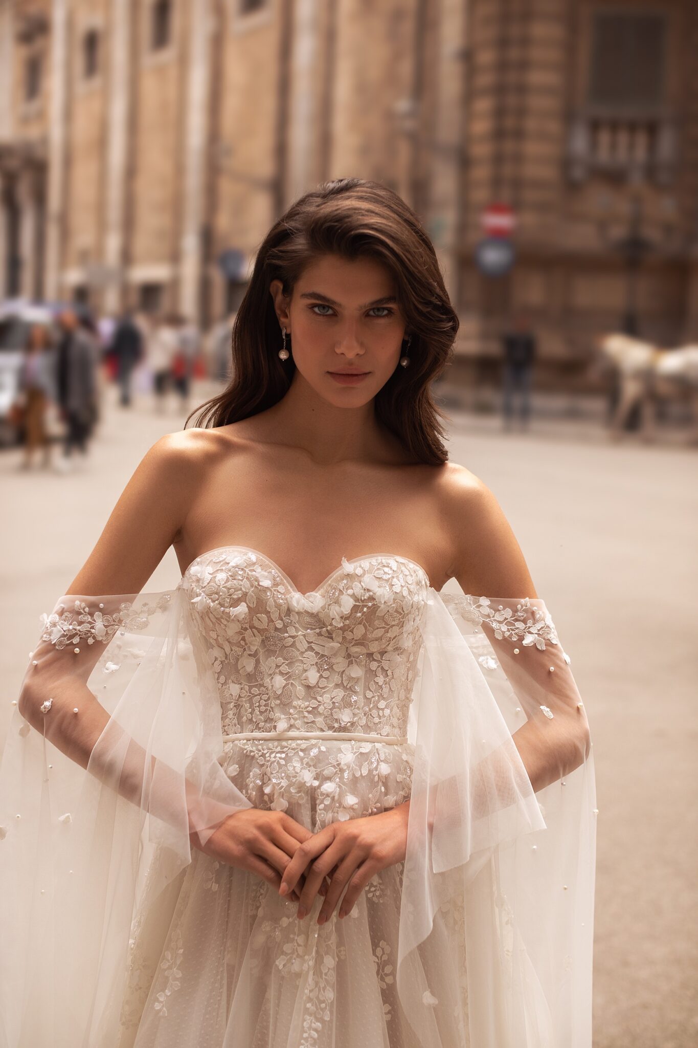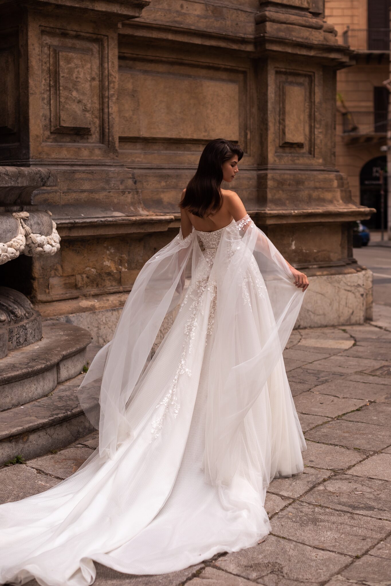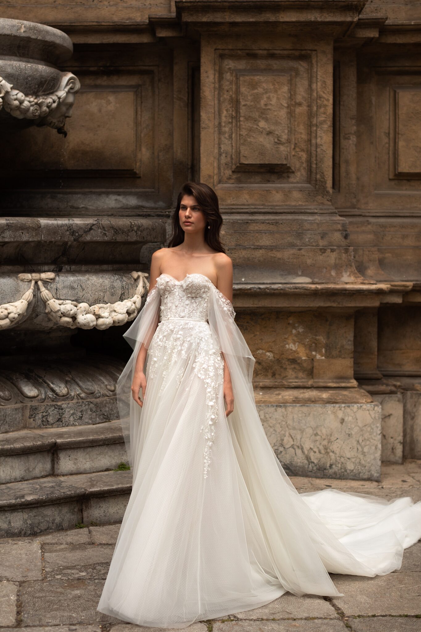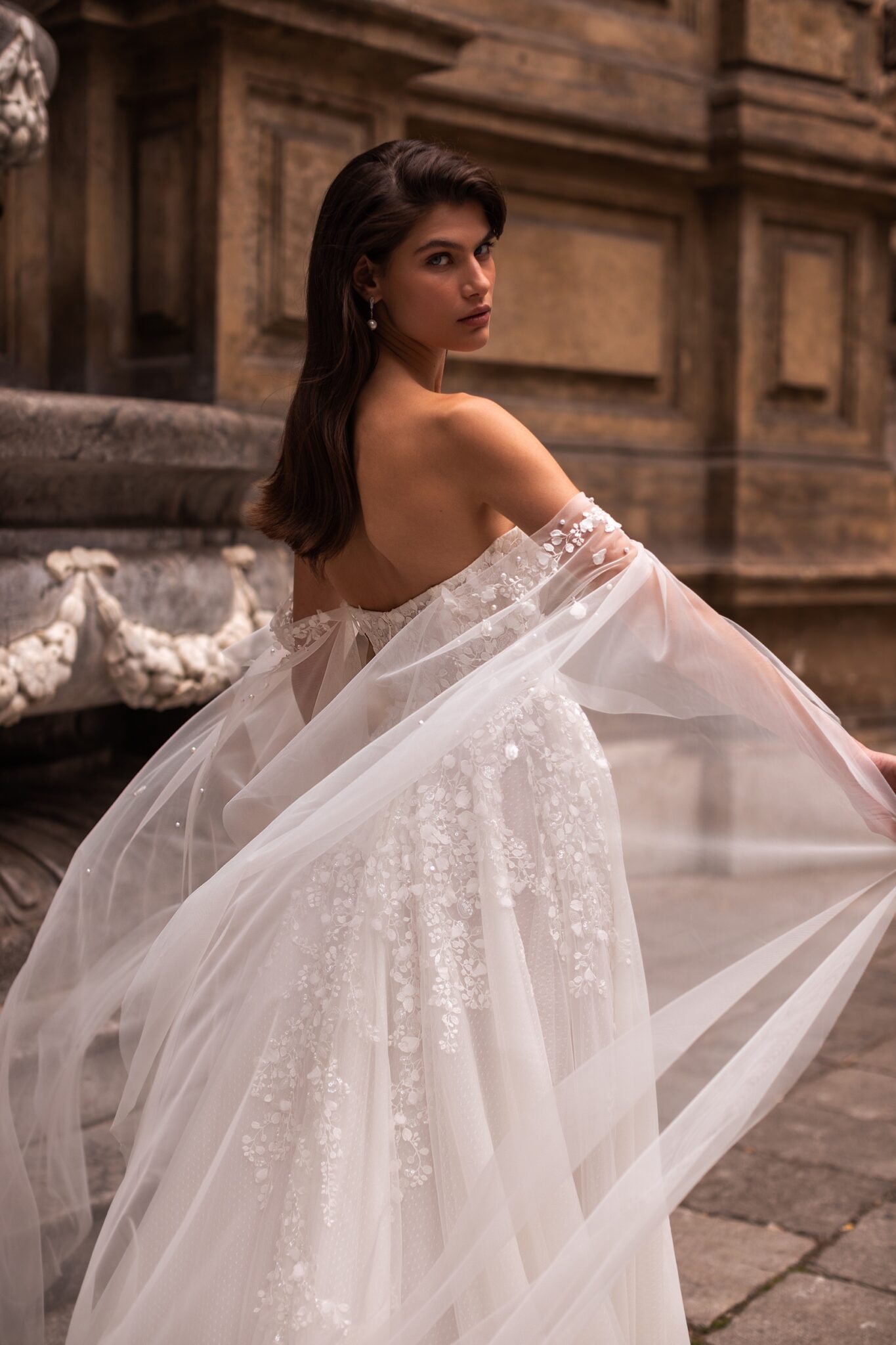 Aidana – ніжна весільна сукня в стилі “A-силует”, що прикрашена чудовою вишивкою. Безбретельний корсет з серцеподібним вирізом прикрашений 3D вишивкою з квітів та маленькими бісерними прикрасами. Романтичні опущені рукава поєднують легкий тюль з мініатюрними квітковими вишивками. Вільна спідниця з вуали має довгий шлейф, що надає образу витонченості та легкості.