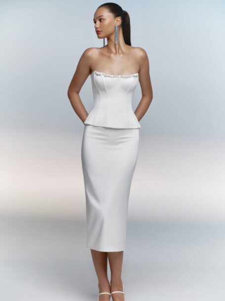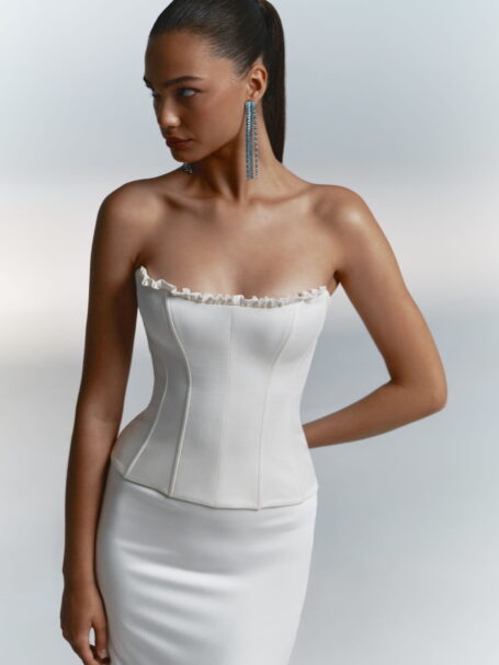 Розкішна весільна сукня з глянцевого атласу. Корсет без бретелей прикрашений драпіруванням і гострим вирізом. Спідниця силуету “рибка” приталена на стегнах і стає вільною від колін, закінчуючись фантастичним шлейфом.