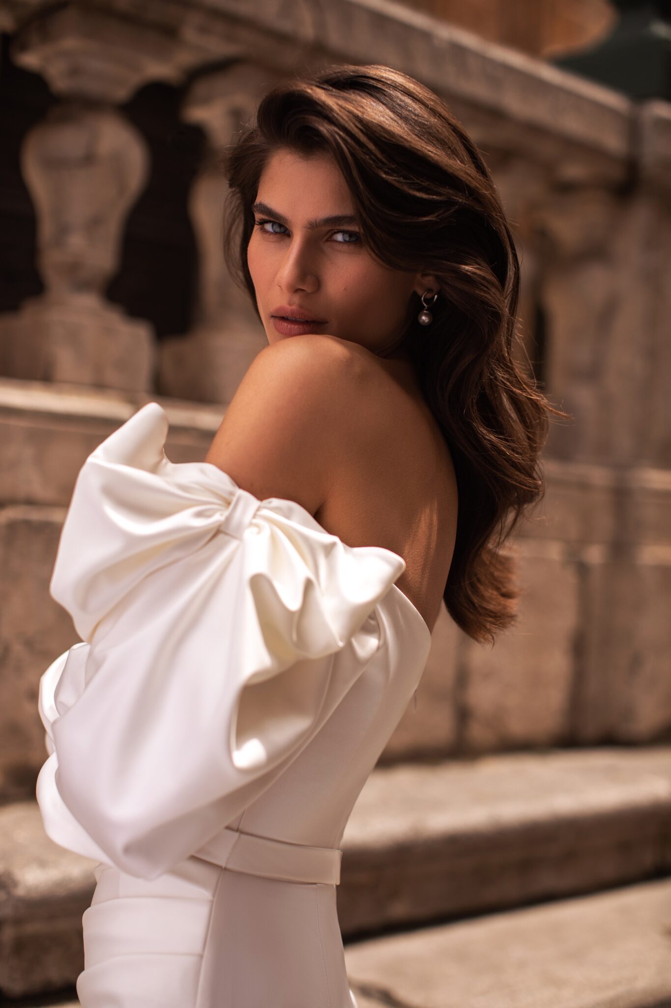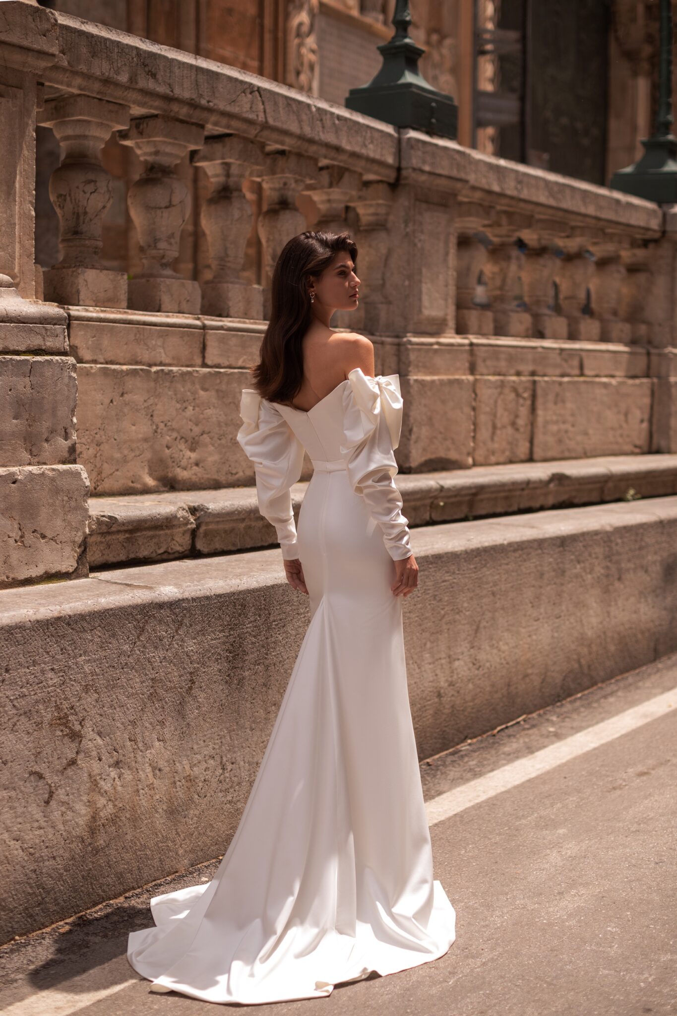 Жіночна сукня-рибка з атласним корсетом та вирізом у формі серця. Прикрашена драпіруванням і довгими об’ємними рукавами з великими бантами на плечах. Асиметрична атласна спідниця прямого крою з витонченим шлейфом, прикрашена м’якими складками та розрізом до стегна.