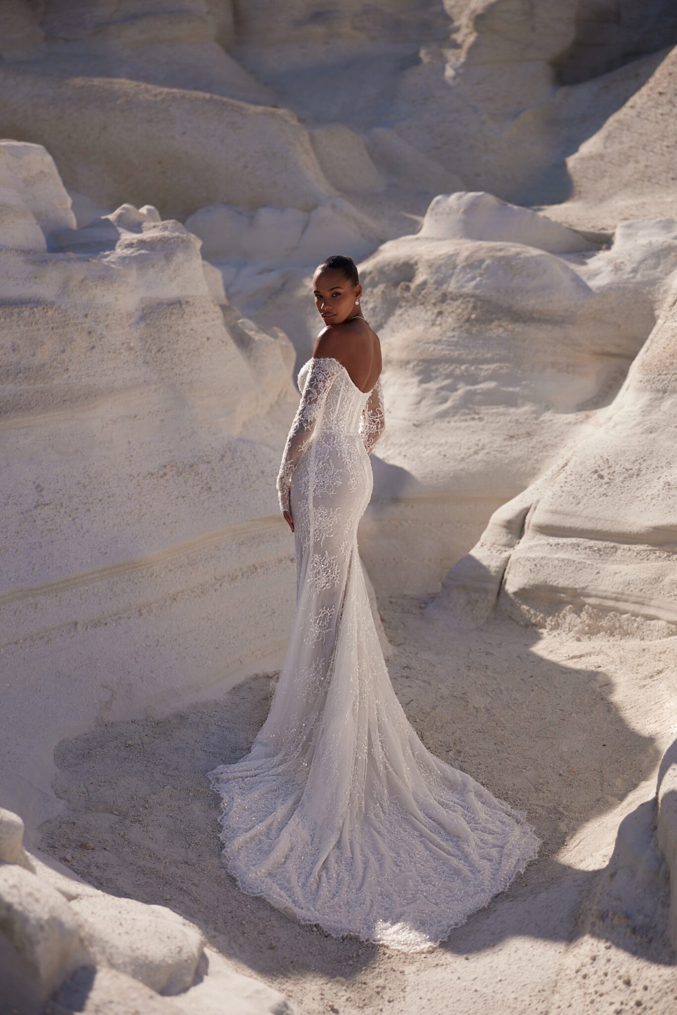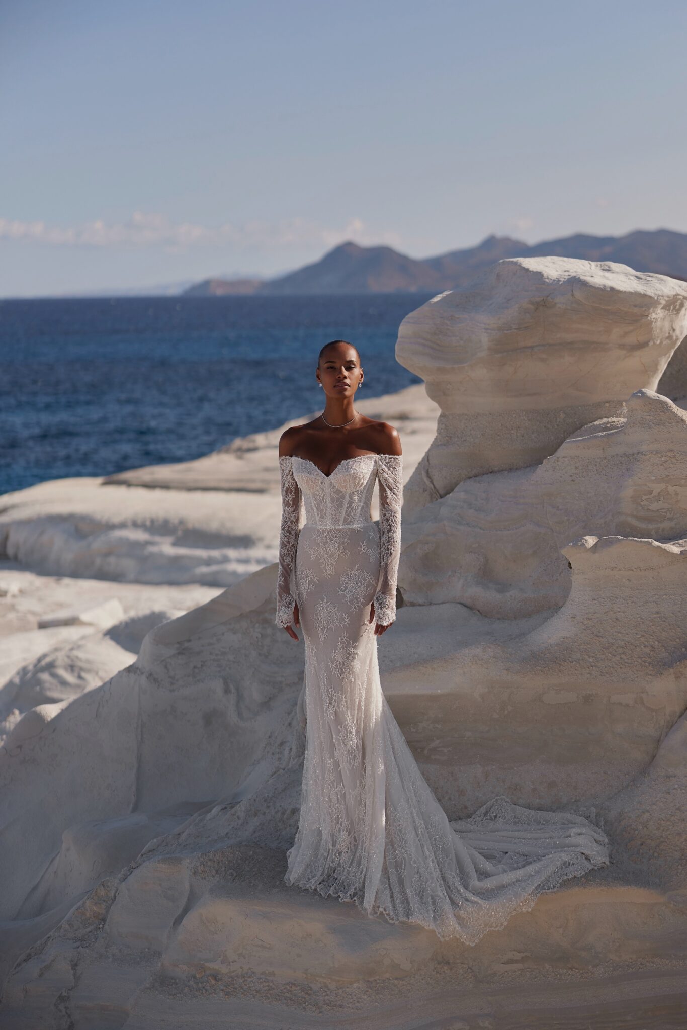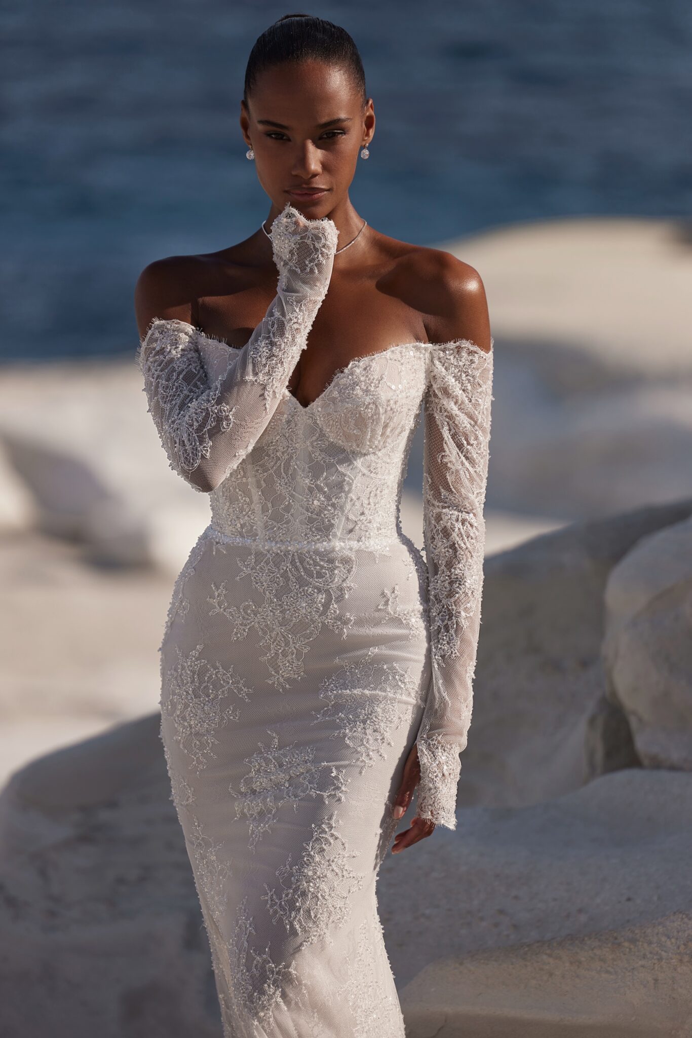 Шикарна сукня з відкритими плечима, глибоким декольте та багато розшитою бісером сіткою, що створює квітковий орнамент, який додає ансамблю нотку гламуру. Основою сукні є жорсткий корсет, а спідниця “русалчин хвіст” виконана з напівпрозорої легкої тканини, що робить образ збалансованим та жіночним.