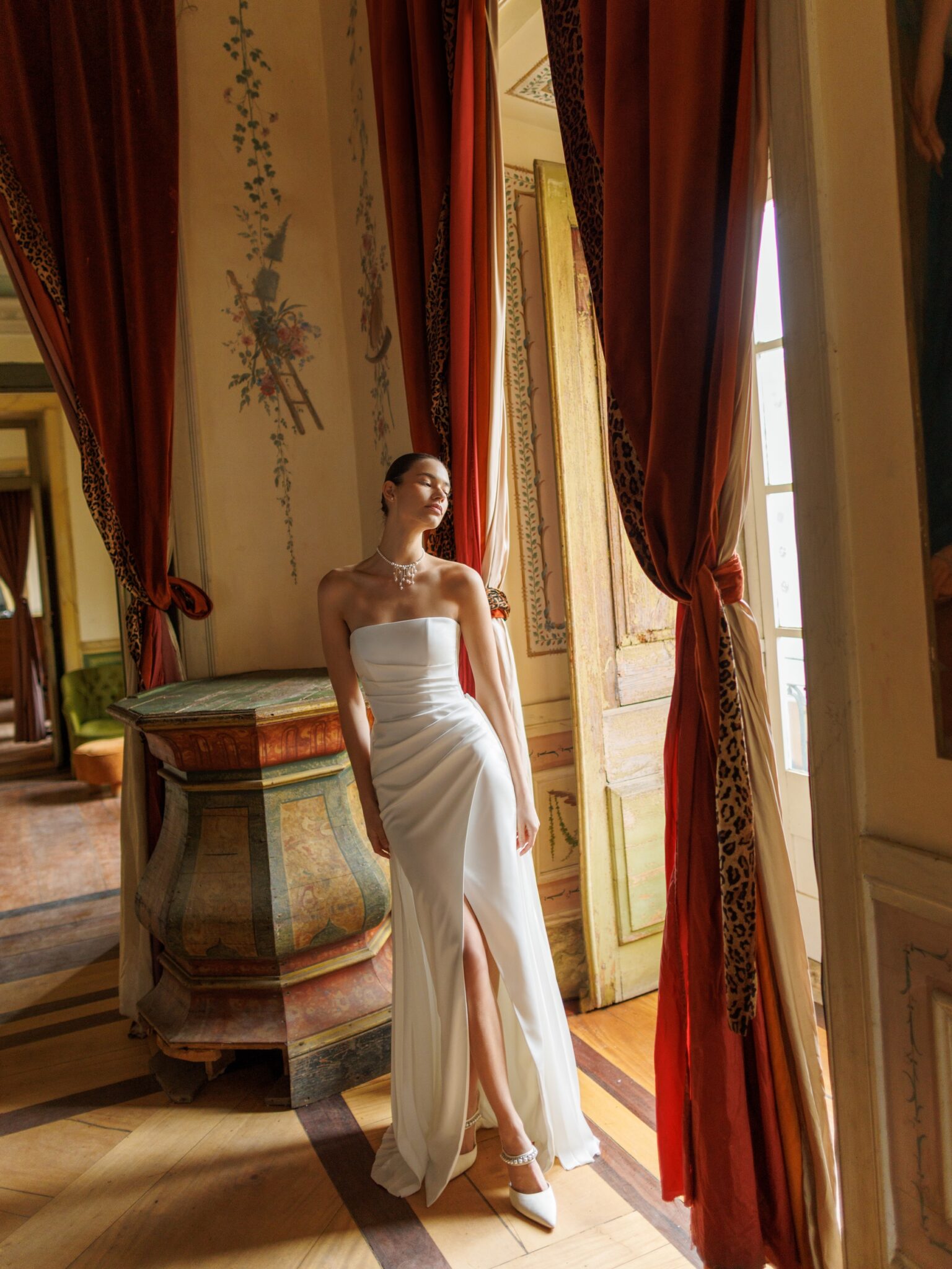 Виготовлена з атласу, сукня має сміливий розріз до стегна та скульптурний драпірований корсет, що застібається на блискавку ззаду, надаючи статуарності та облягаючи фігуру.