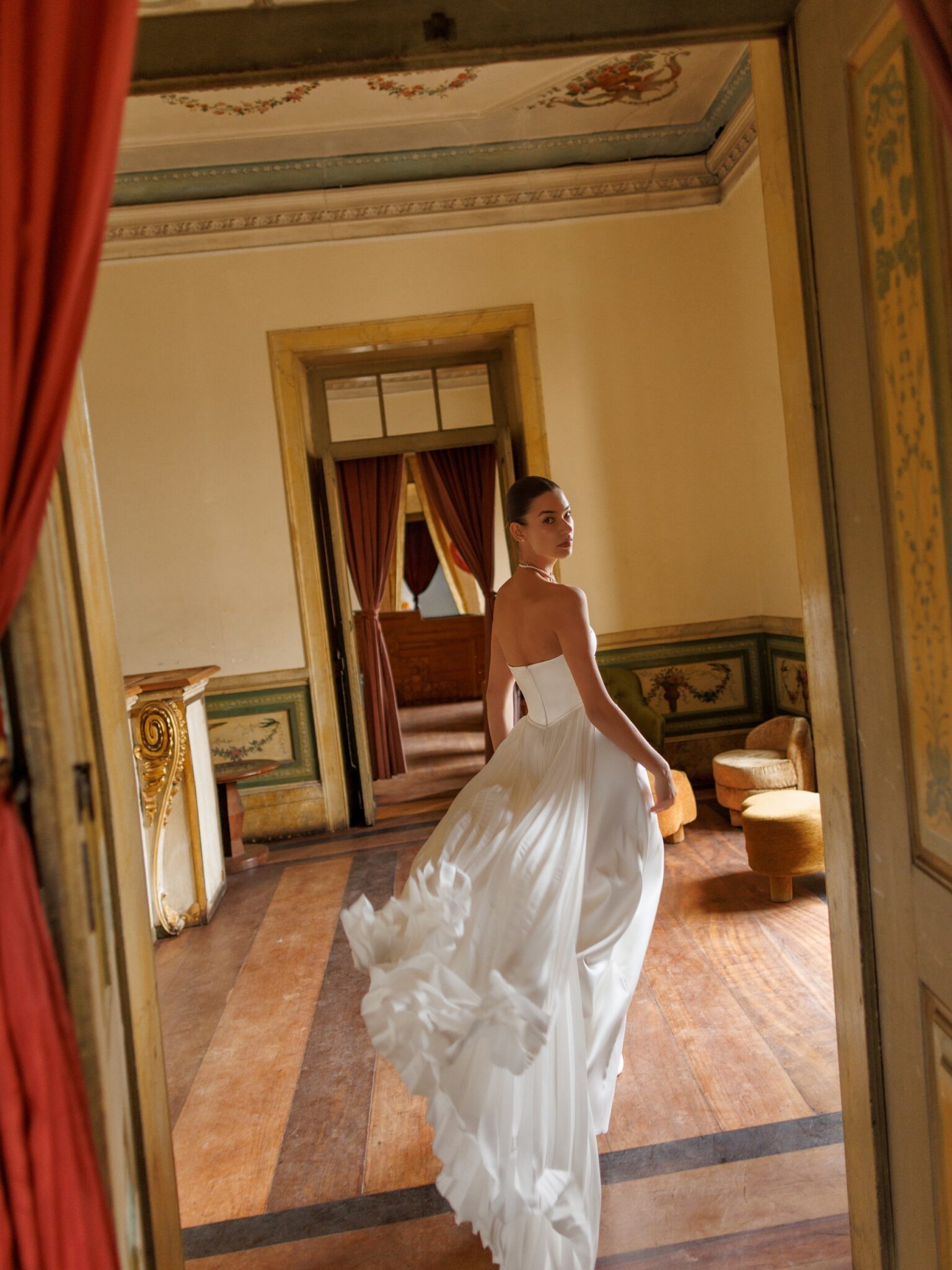 Окремим елементом є оригінальний знімний шлейф, виготовлений з плісированої тканини, що додає легкого руху та нотки вигадливості до загального образу.