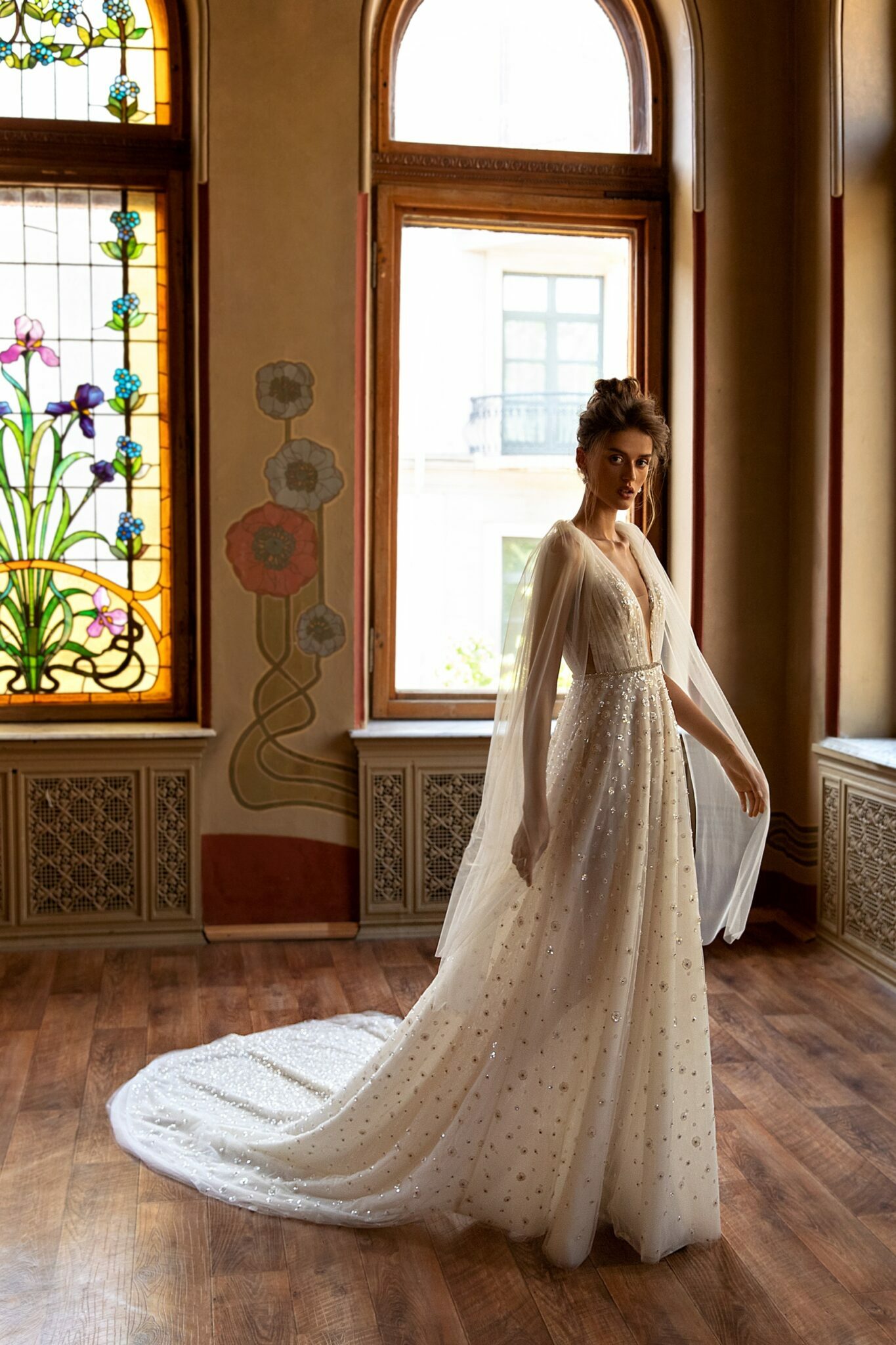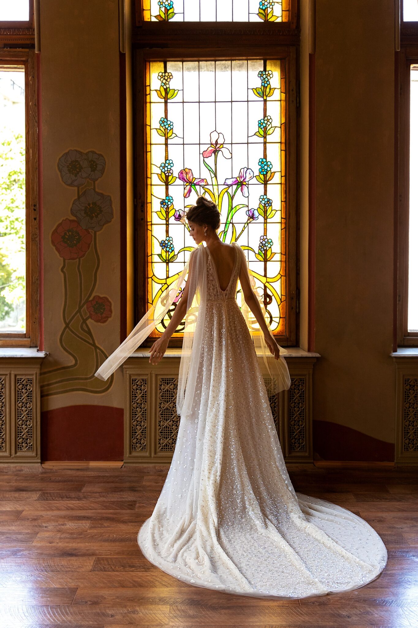 Лаконічна і ніжна весільна сукня Aqua ідеально підходить для жіночого образу. Ця сукня у стилі “А-силует” на тонких бретельках виготовлена з різних видів мережива. Корсет прикрашений намистинами. Лінії V-подібного вирізу декольте та інші вирізи також прикрашені намистинами. Фантастична спідниця переходить у довгий шлейф.