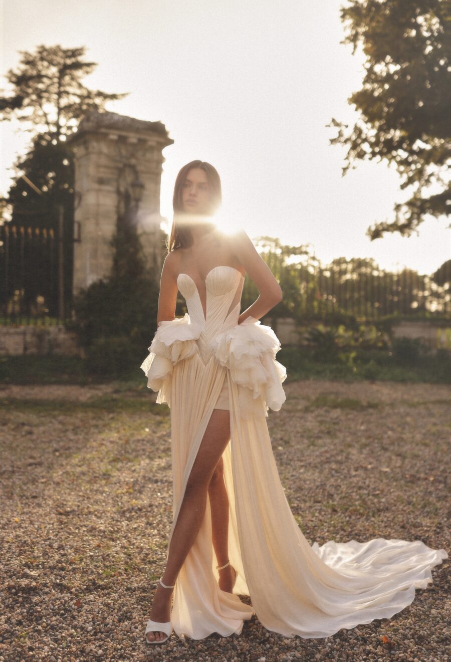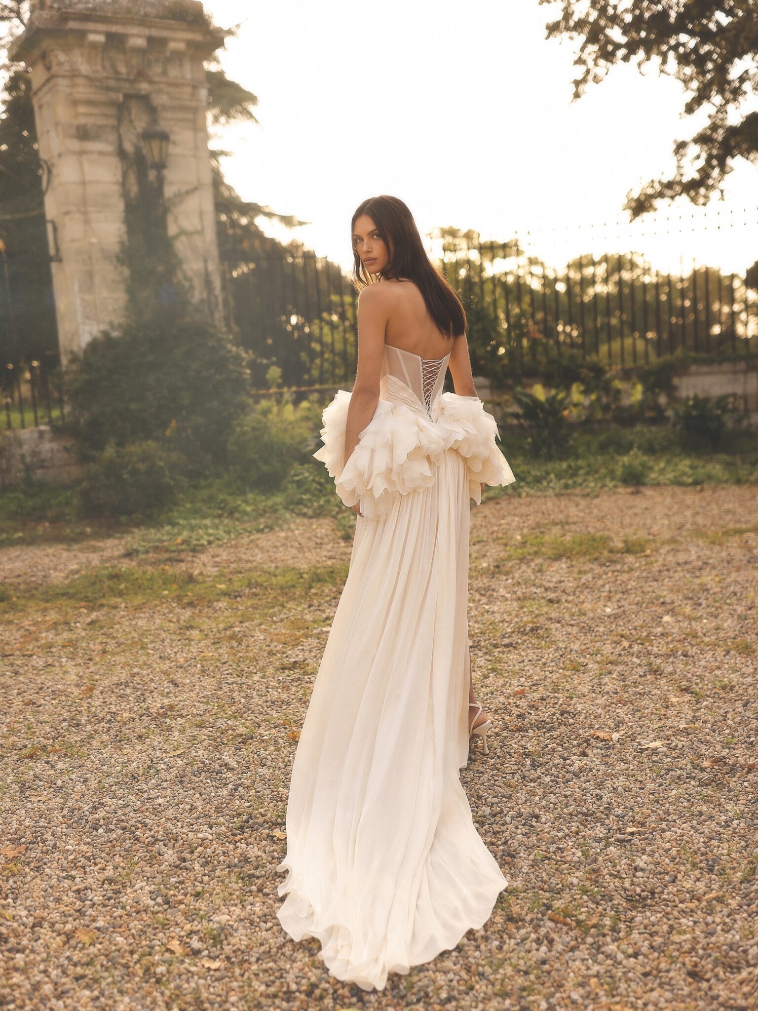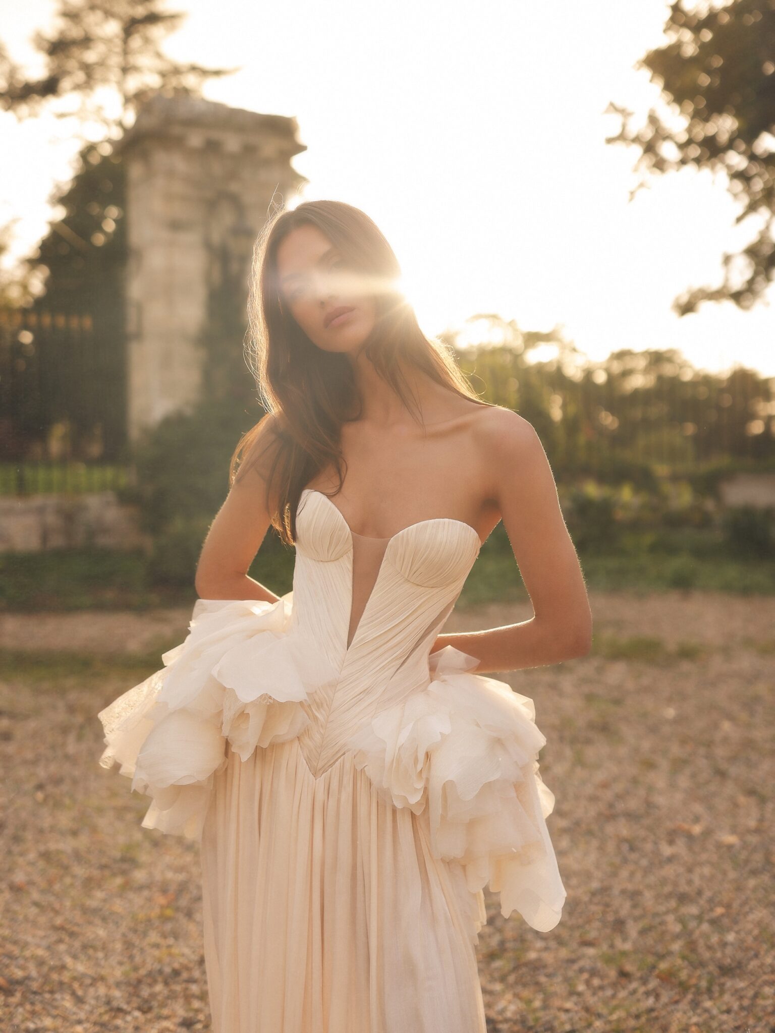 Корсет із витонченим драпіруванням підкреслює фігуру, а лінію талії оздоблюють драматичні, скульптурні рюші різних форм і відтінків — справжній кутюрний акцент, що додає силуету глибини та об’ємності.
