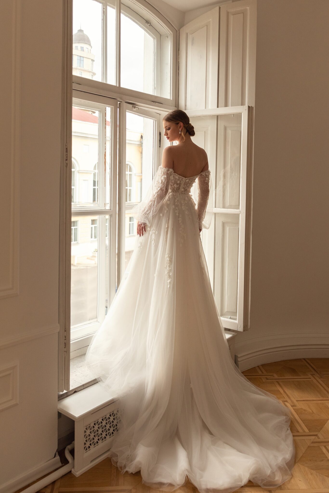 Astoria – ніжна весільна сукня А-силуету. Корсет без бретелей з вирізом у формі серця прикрашений квітковим 3D мереживом і дрібними намистинами. Лінія талії прикрашена таким ж мереживом і невеликим бантом. Опущені з пліч рукави стали поєднанням прозорого мережива і невагомого фатину. Вільна спідниця з фатину має довгий шлейф.