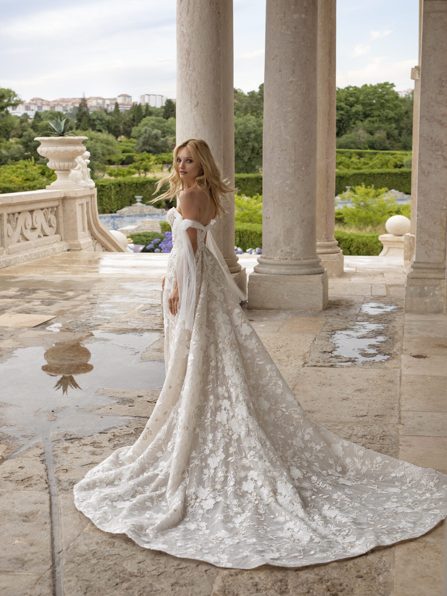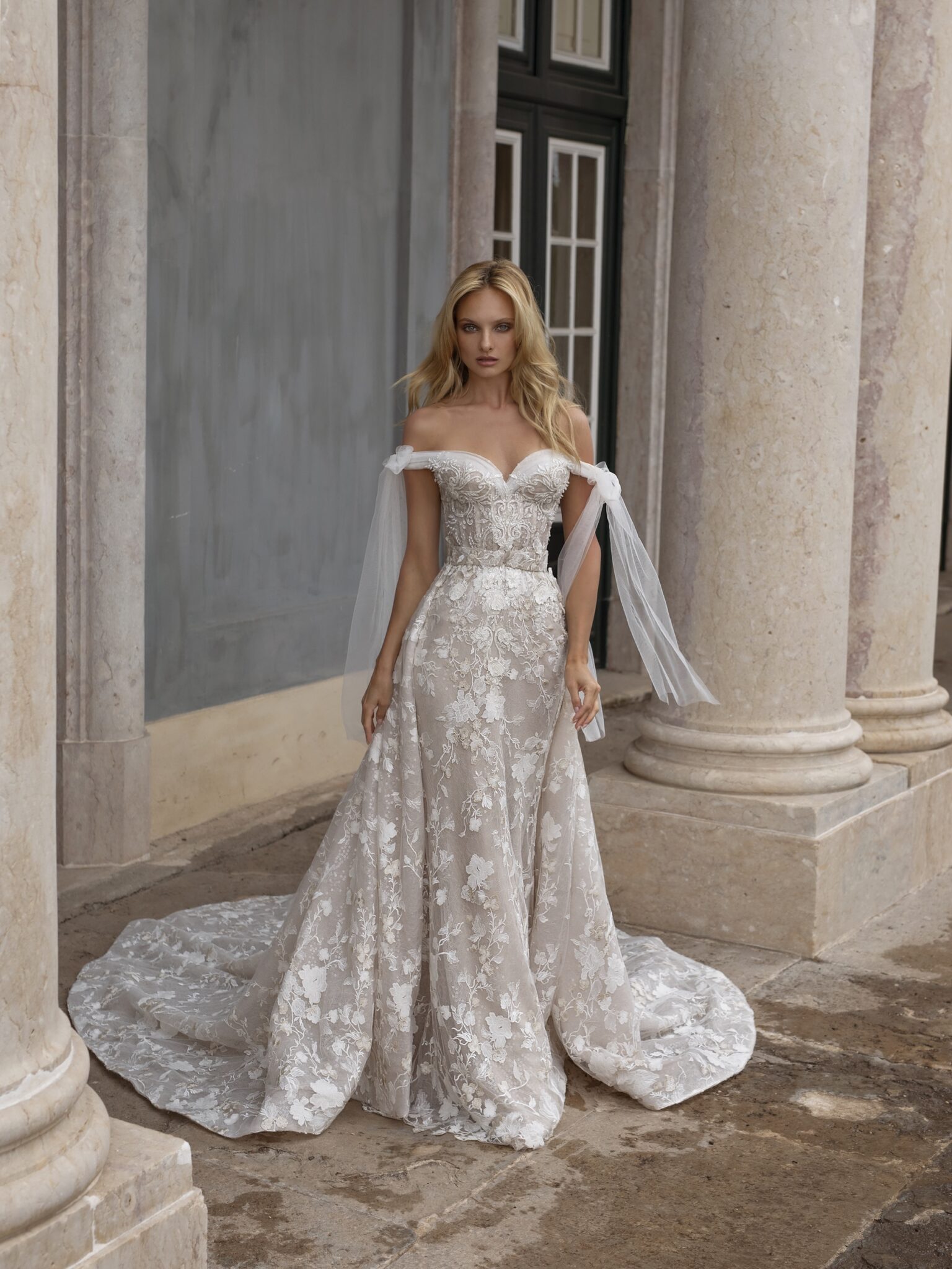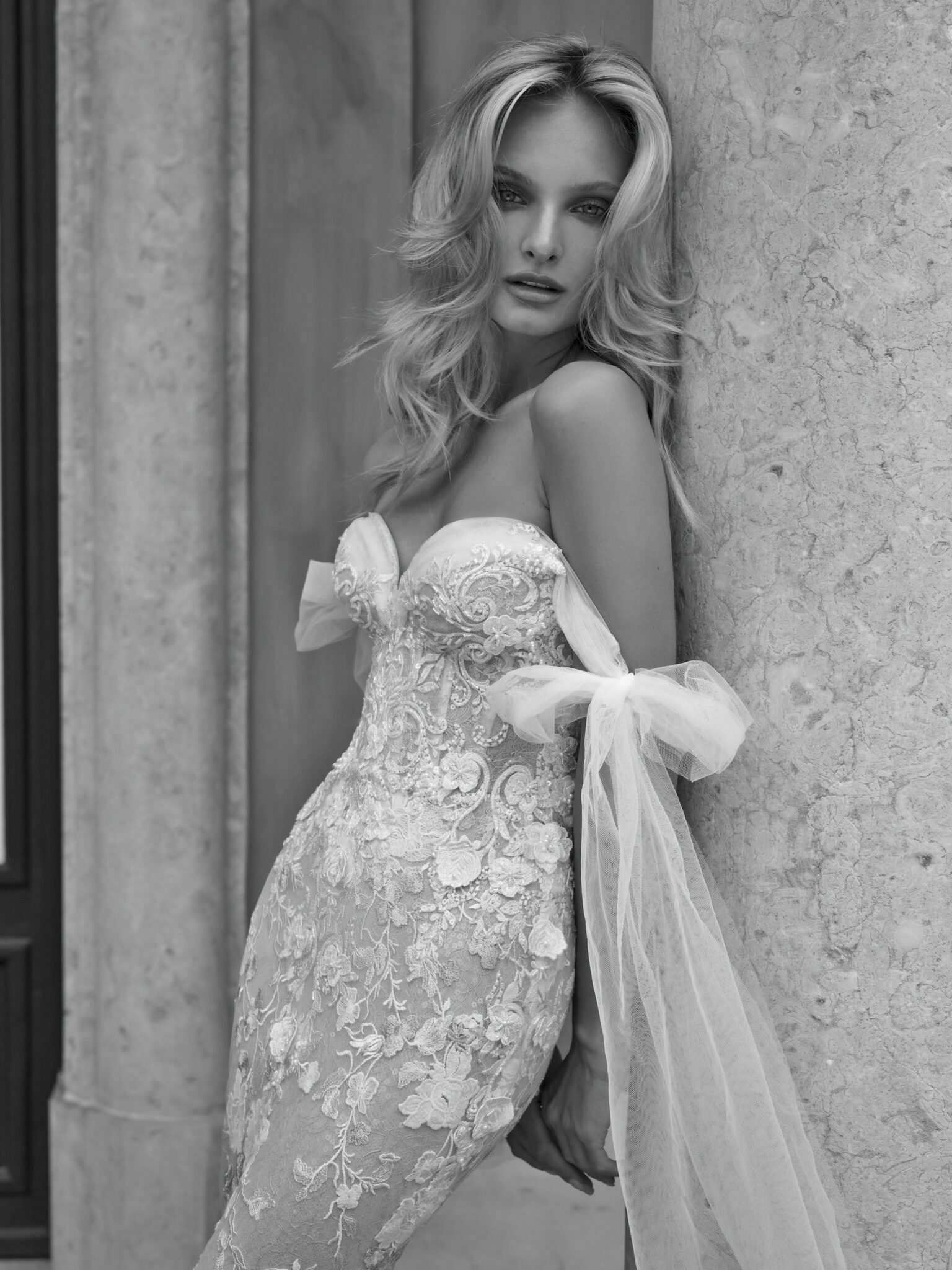 Сукня Carrera – спокуслива облягаюча сукня у стилі шіфон, яка підкреслює фігуру та створює ідеальний силует. Ця сукня без бретелек повністю зроблена з квітів і малюнків мережива різних розмірів і форм. Корсет прикрашений вуалью, яка зав’язується в невеликий бантик. Знімна спідниця завершує образ.