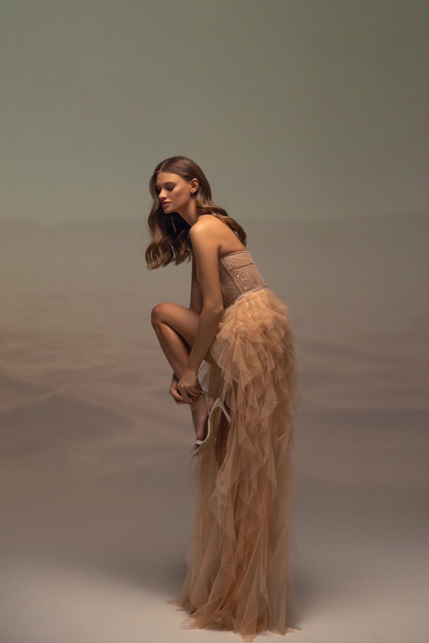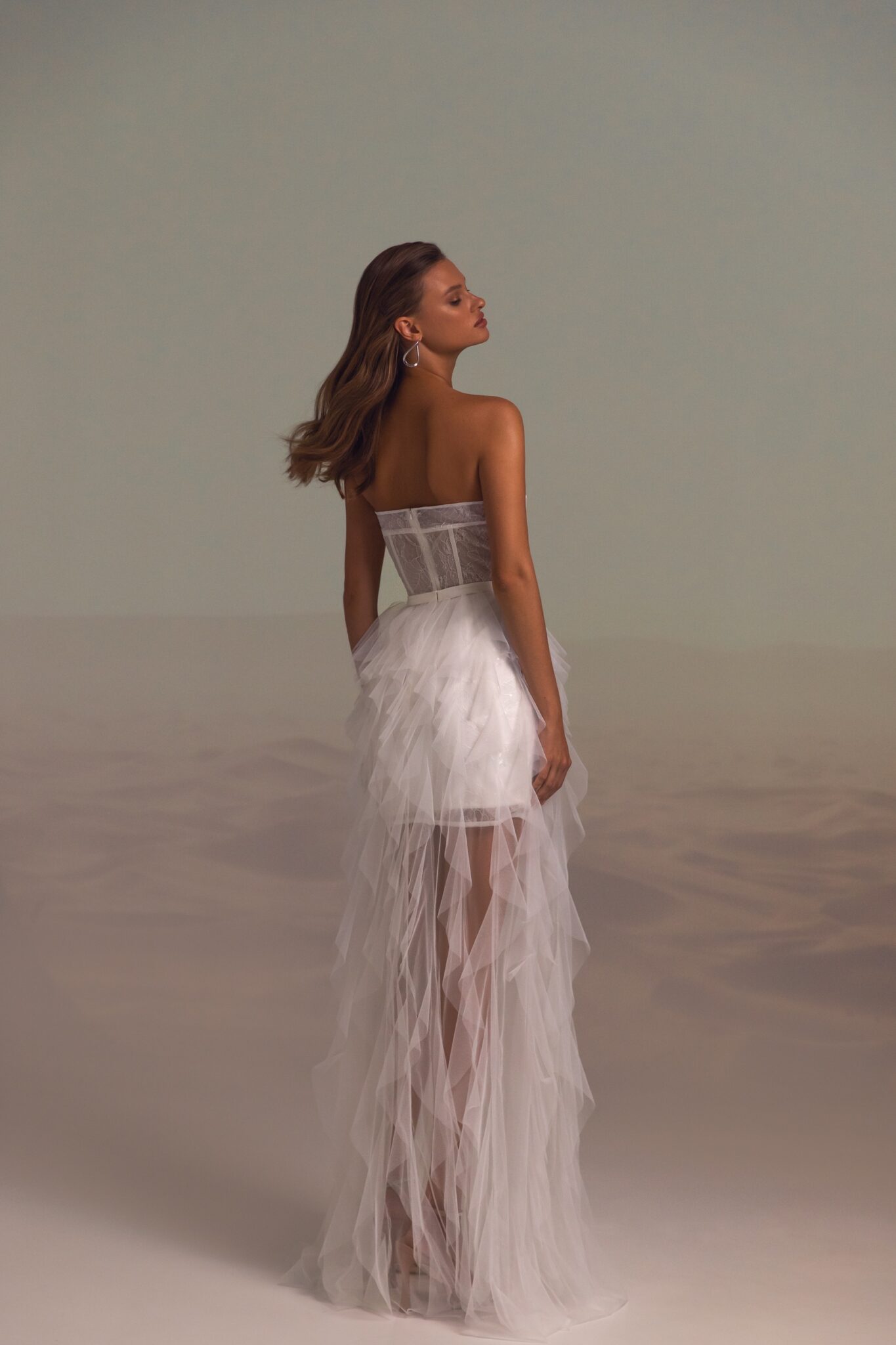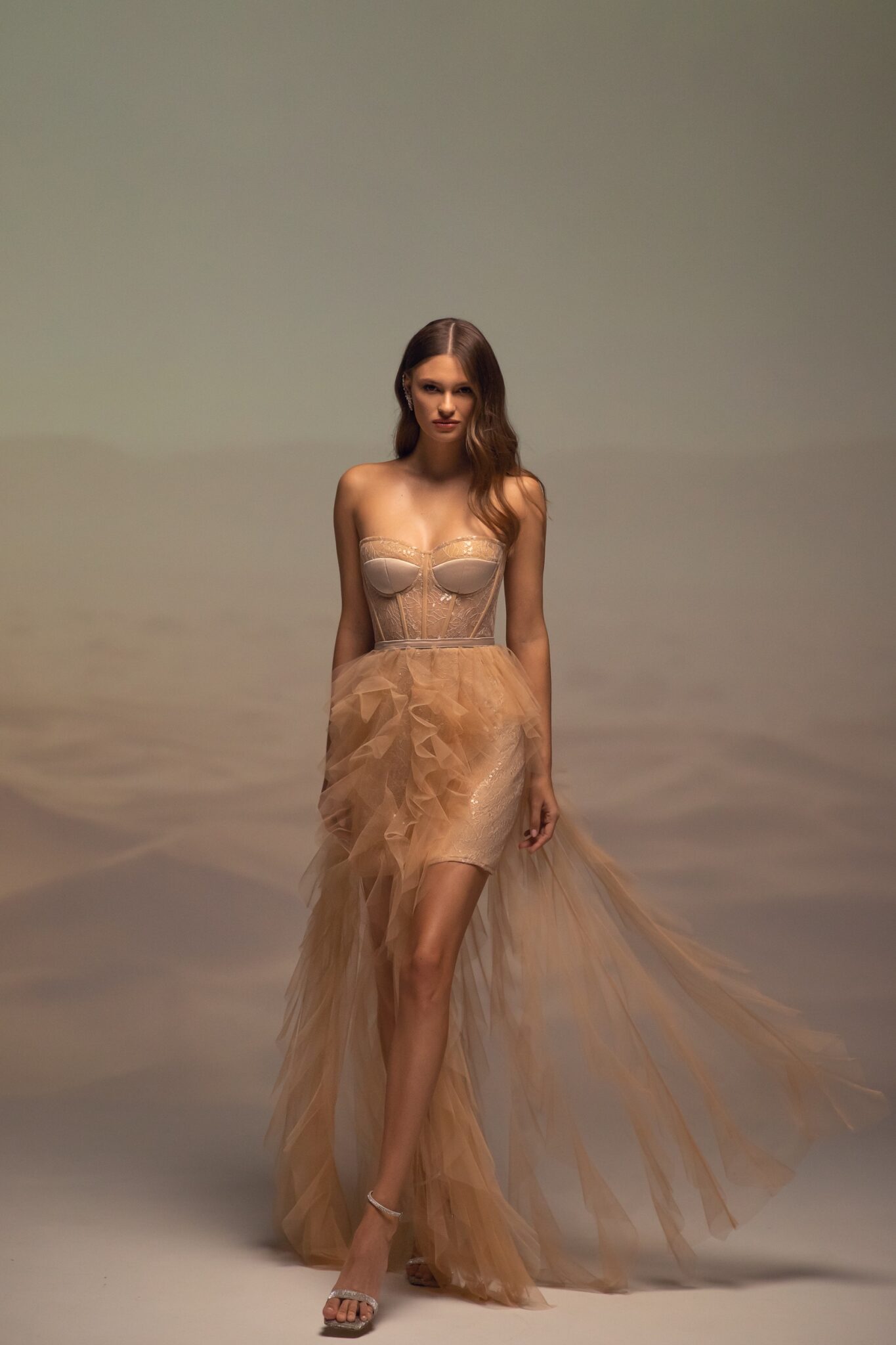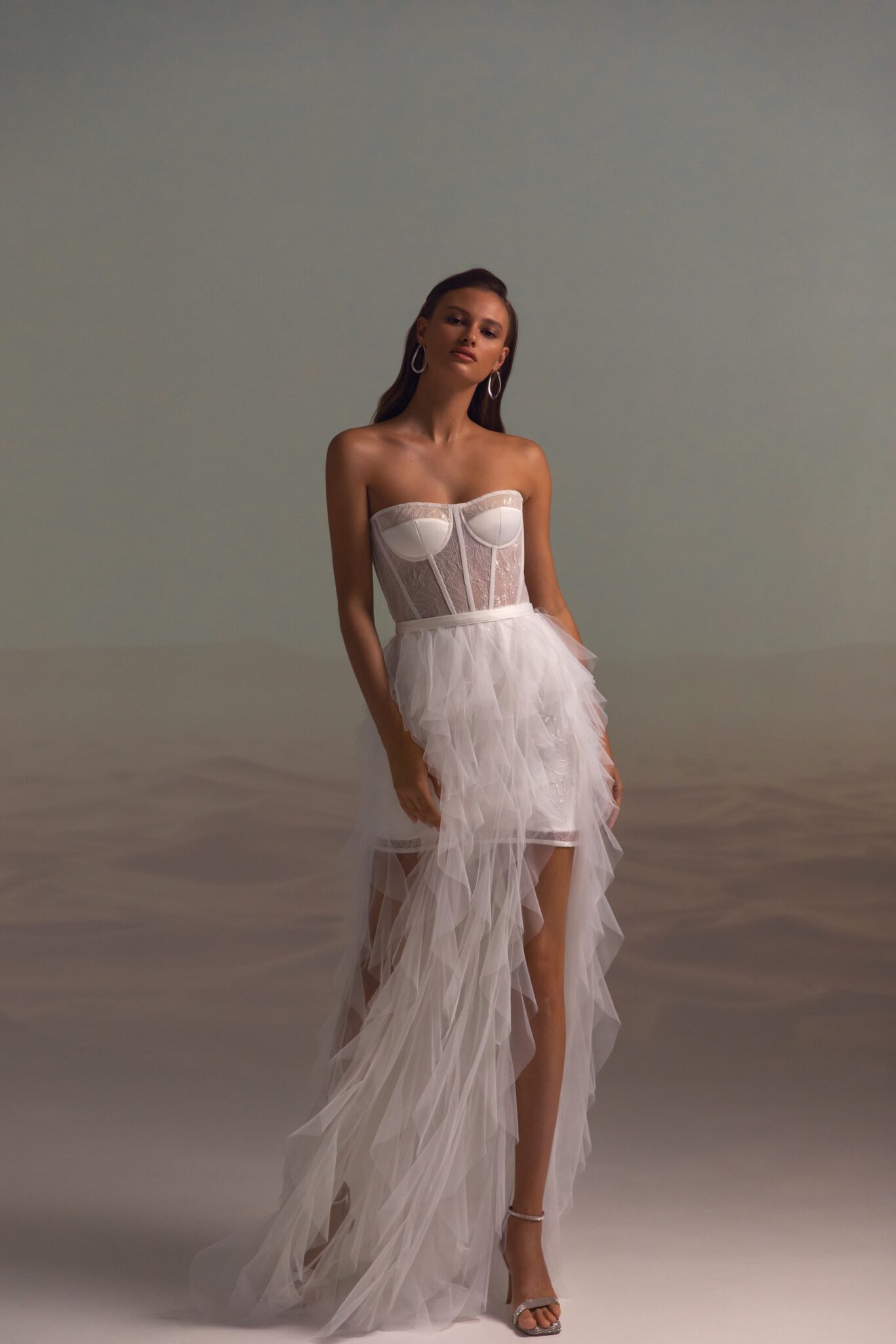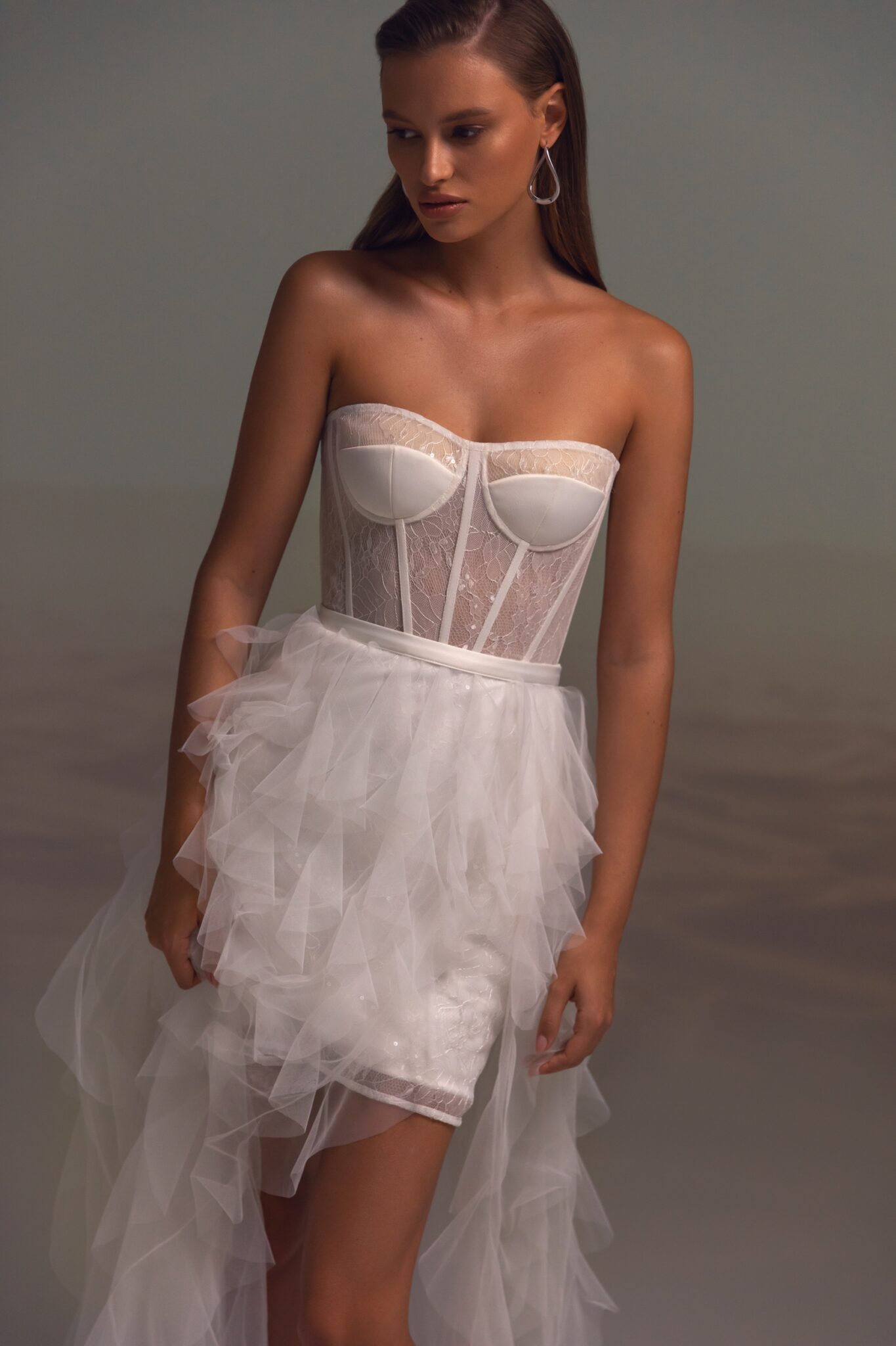 Стильна весільна сукня для сміливої нареченої. Корсет без бретелей класичного стилю прикрашений кісточками і елементами мережива. Спідниця-футляр довжини міні виконана з мережива. Верхня спідниця виготовлена з прозорого мережива та прикрашена рюшами. Сукня доступна в кольорах молочний та беж.
