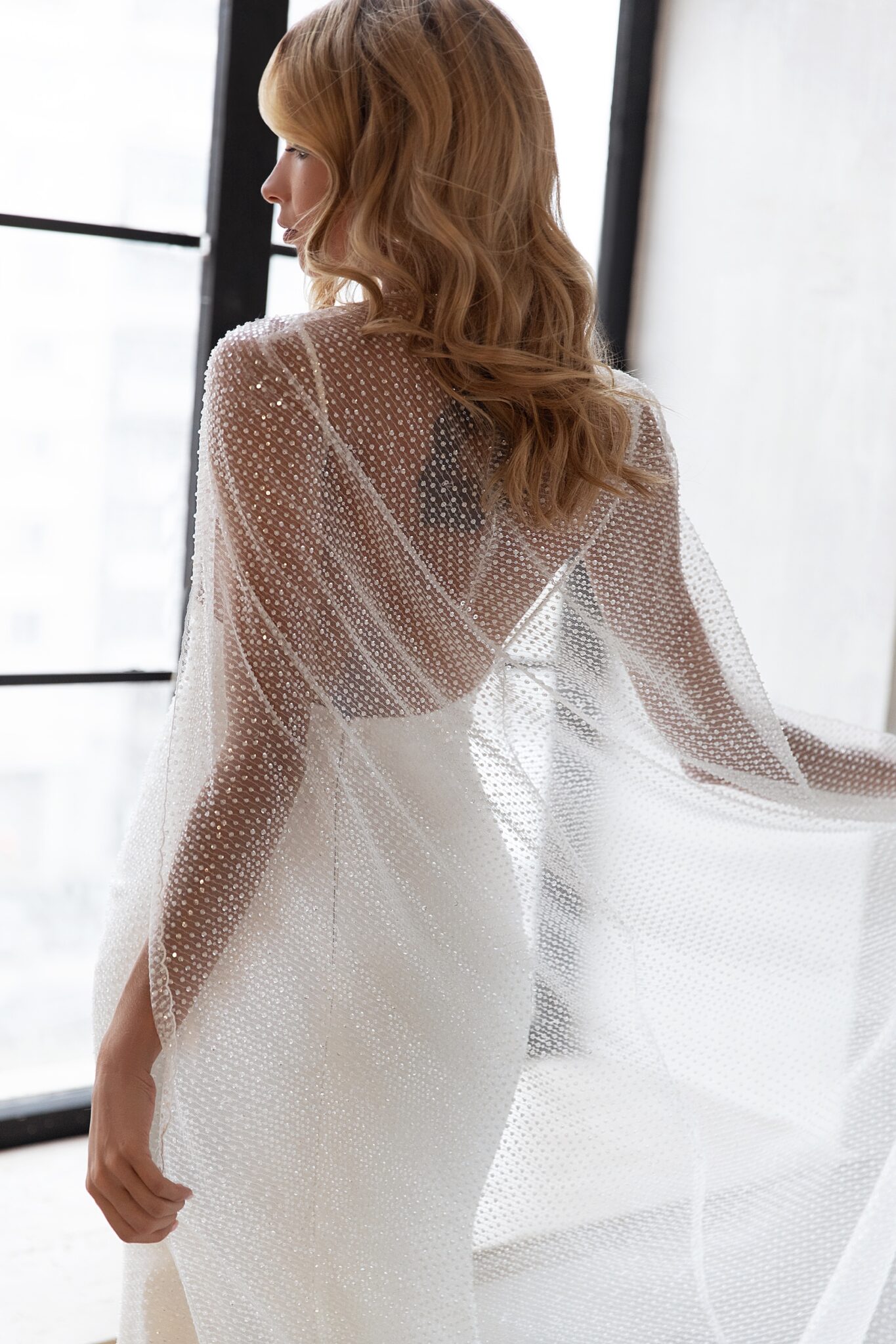 Це блискуче весільне плаття, яке має прозорий накид. Одяг зі силуетом “sheath” прикрашений сукню зі солодким вирізом на тонких бретелях. Саме весільне плаття повністю прикрашене блискучими паєтками. Також у нього є відкритий спин. Ніжний накид зроблений з блискучої прозорої тканини і закріплений на шиї. Є короткий шлейф.