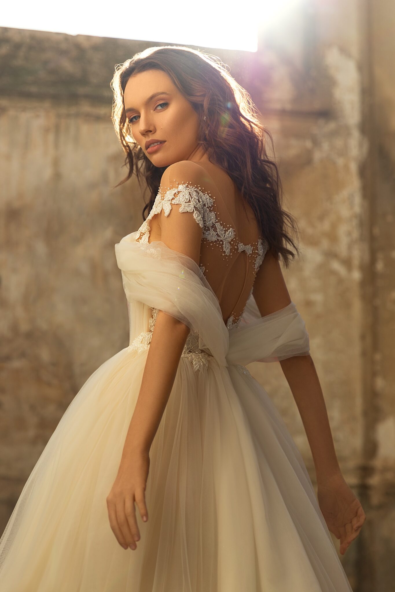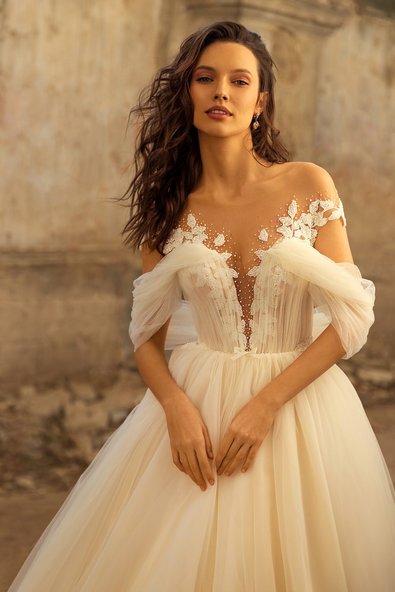 Легка весільна сукня з сердечковим вирізом та унікальними відкритими плечима, поєднана з мереживним верхом. Унікальний верх ідеально поєднується з простою спідницею.