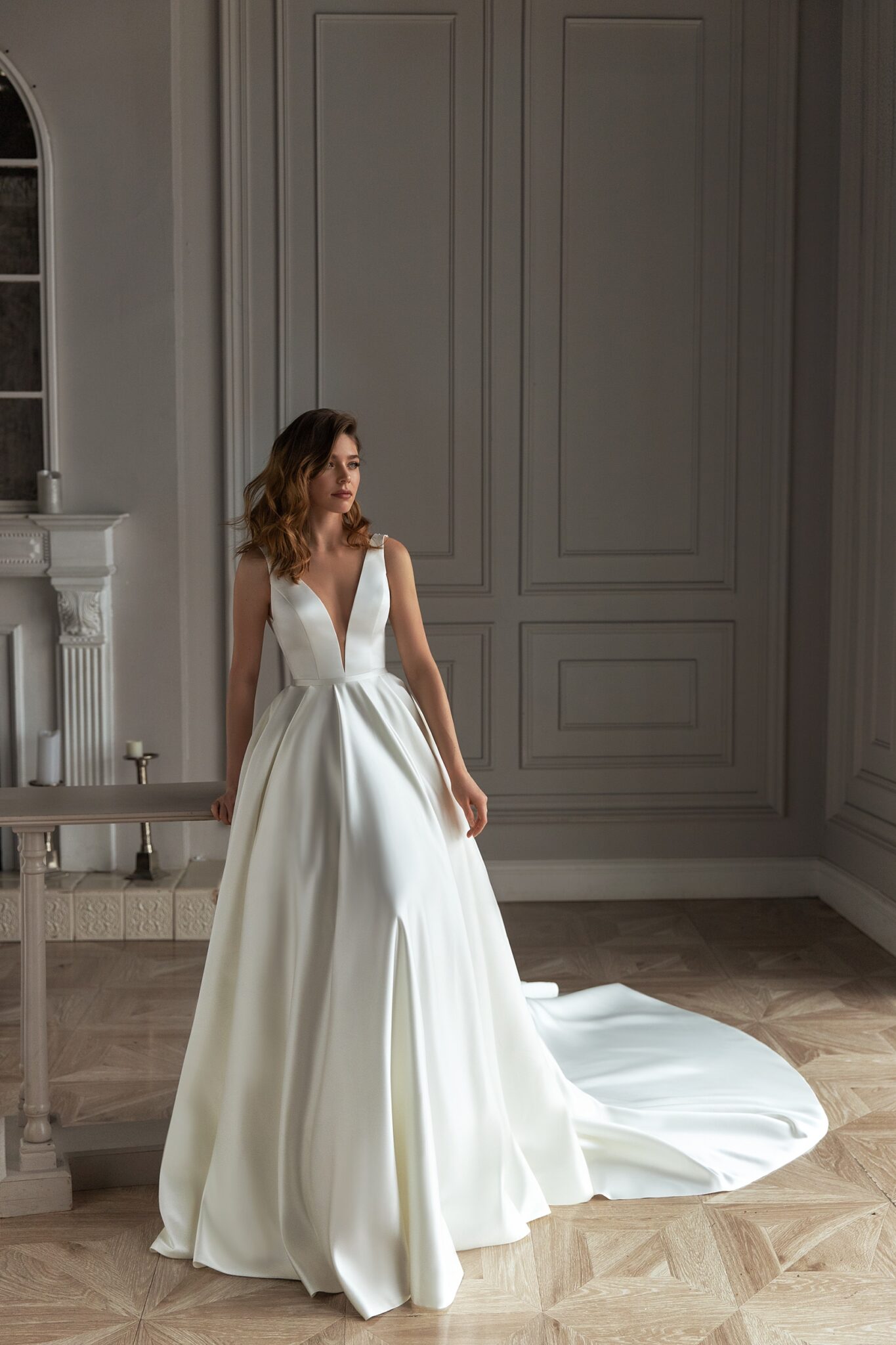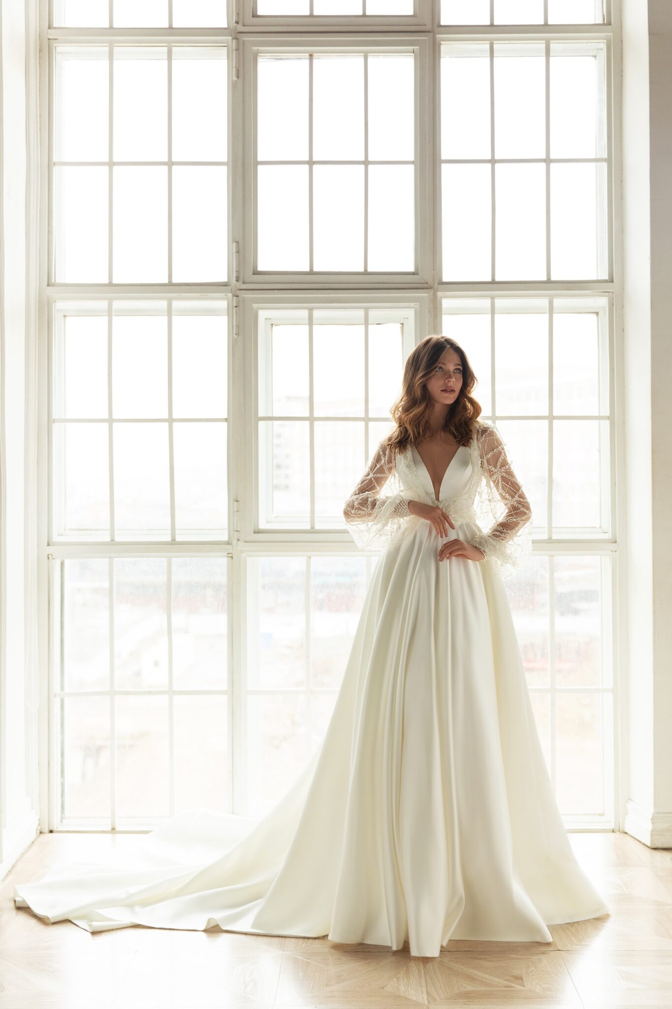 Це весільне плаття у стилі “A-line” виконане з блискучої тканини. V-подібний виріз підкреслює прекрасний декольте. Фантастичний глибокий виріз на спині прикрашений рядами чудових перлів. Тонкий пояс підкреслює талію. Ніжна спідниця переходить у довгий шлейф. Є додатковий болеро, який виконаний з прозорої тканини і прикрашений малюнком з намистин і кристалів. На зап’ястях також є перли.