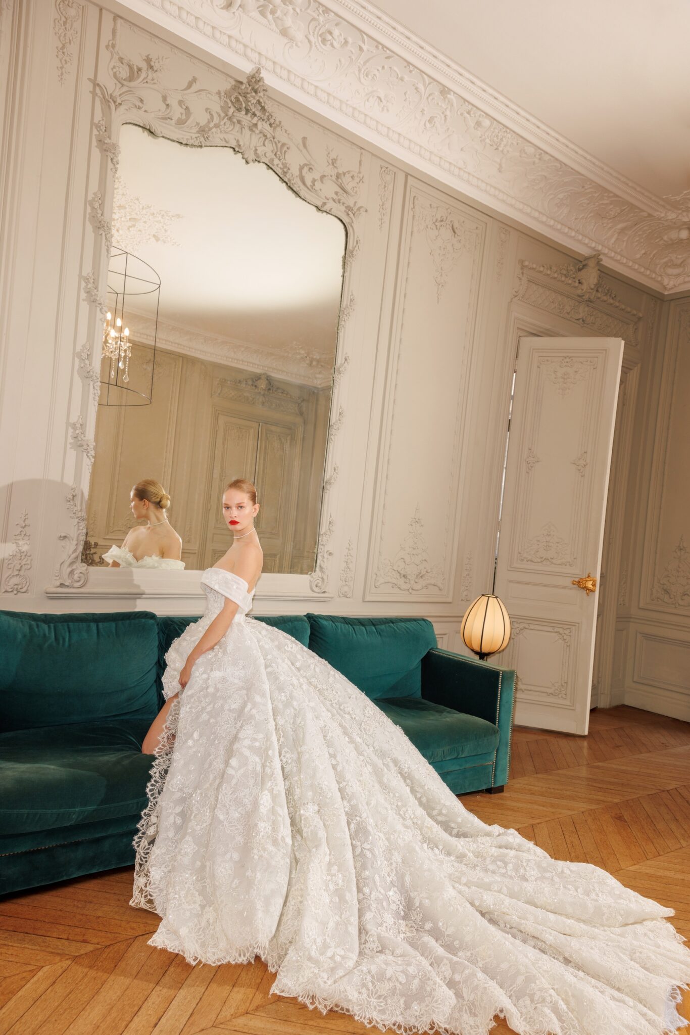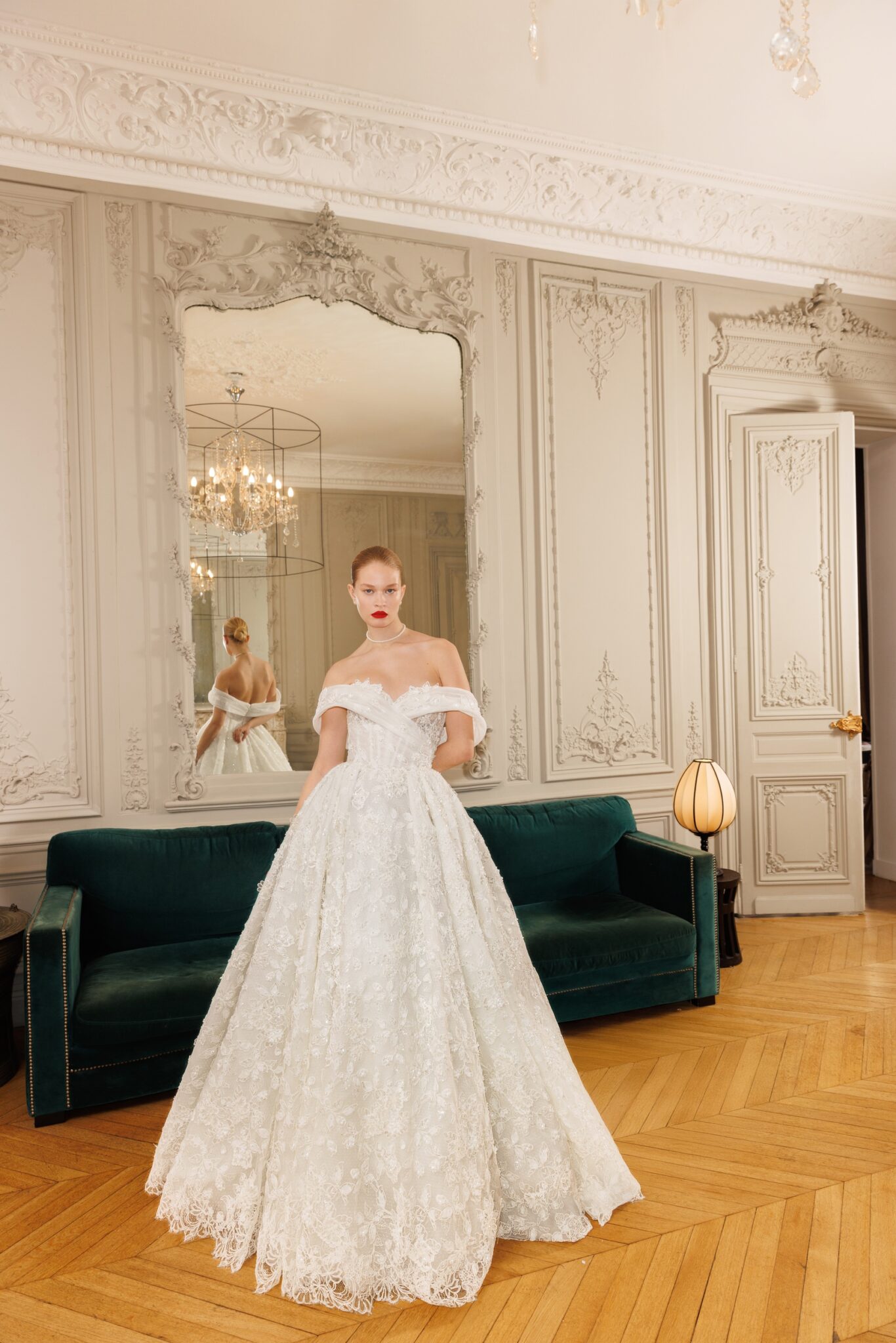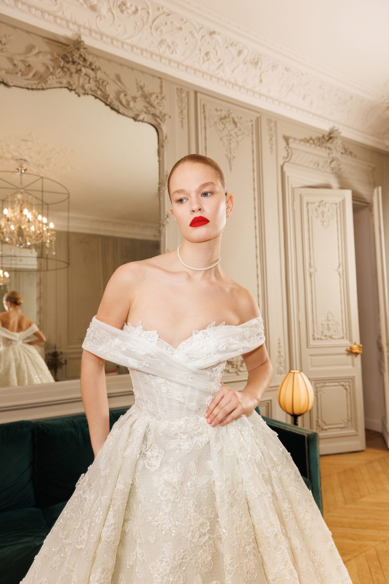 Ідеальна сукня для принцеси з вирізами на плечах («cold shoulder»), що відкривають ключиці, та фігурним вирізом у формі серця, прикрашеним квітковим мереживом. Об’ємна спідниця має довгий шлейф, оздоблений таким же квітковим мереживом.