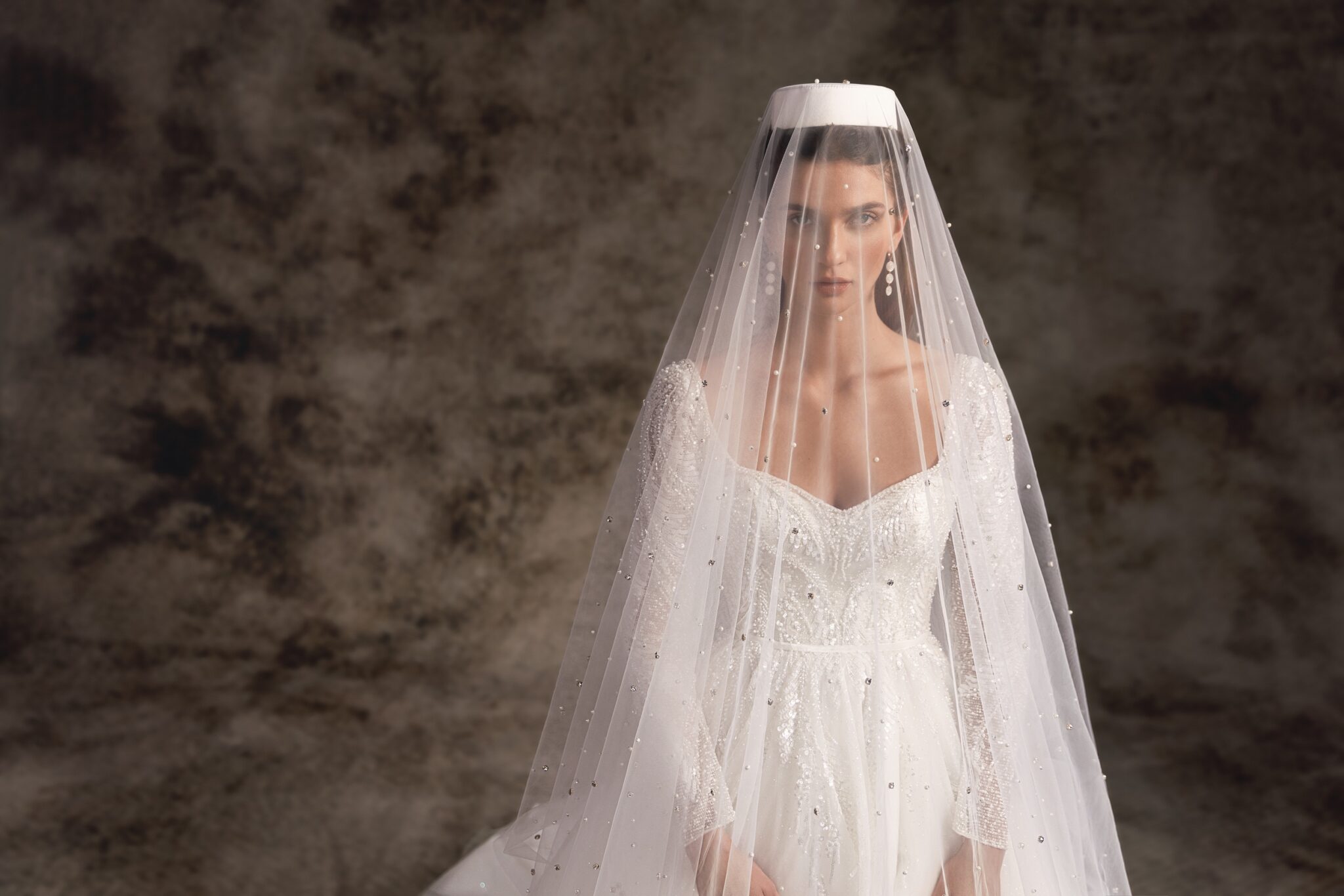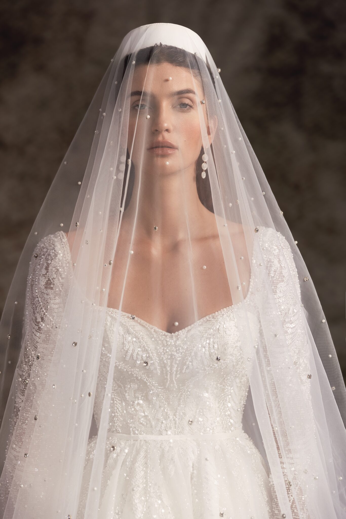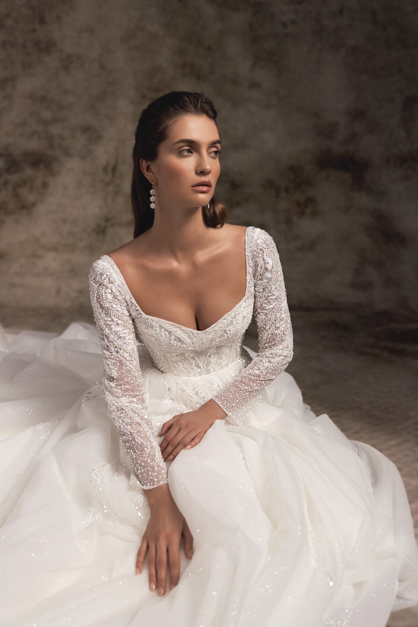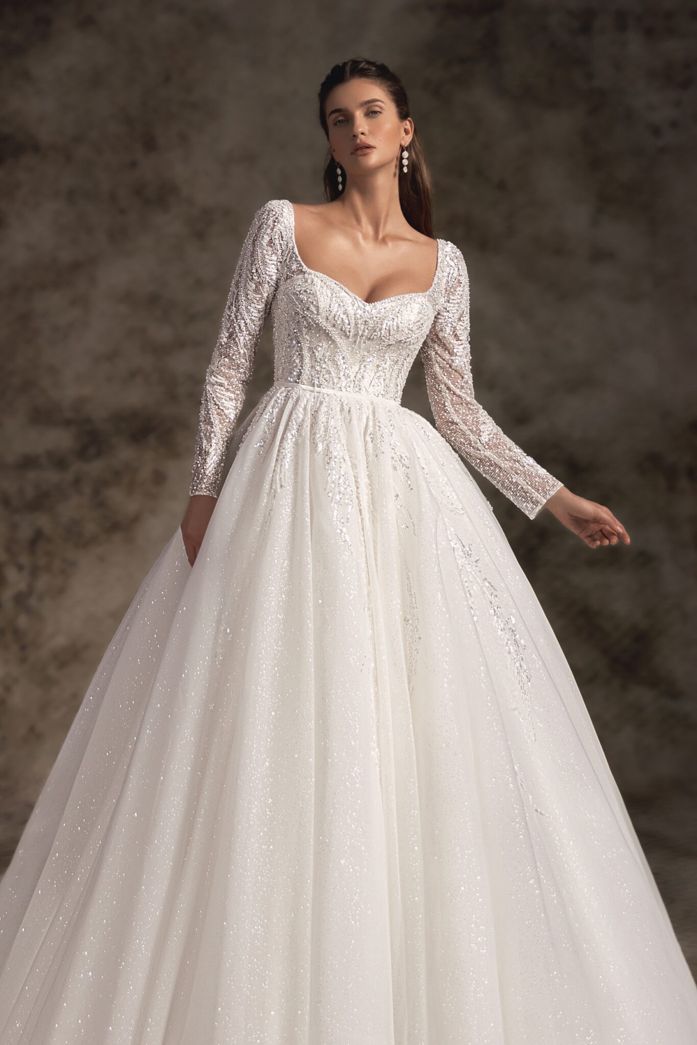 Ця стримано вишукана, об’ємна бальна сукня з глибоким серцевидним вирізом і вражаючими довгими рукавами з мережива втілює справжню силует принцеси. Розкидані ручною вишивкою квіткові мотиви впадають на об’ємну повну спідницю, що переходить в королівський довгий шлейф.