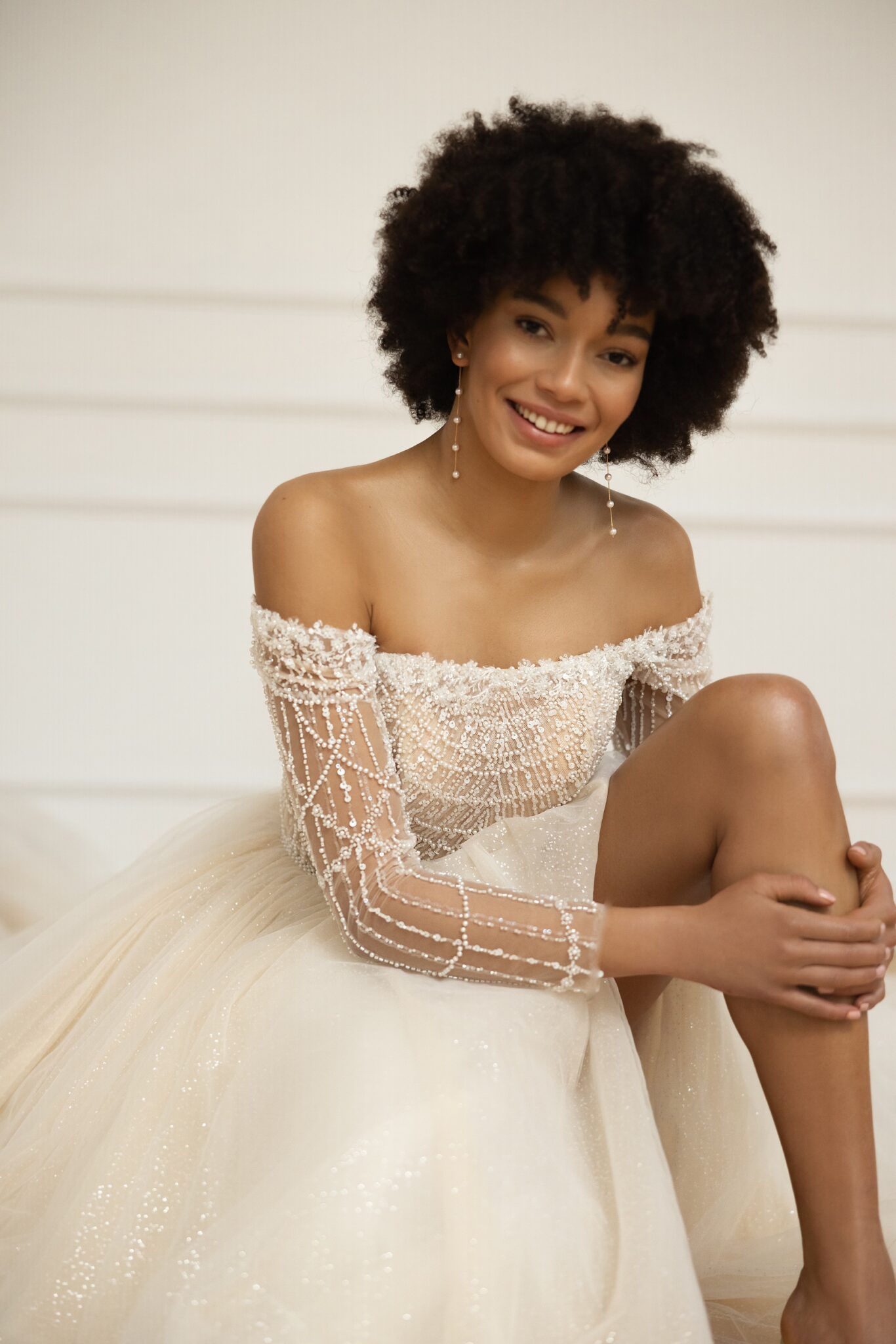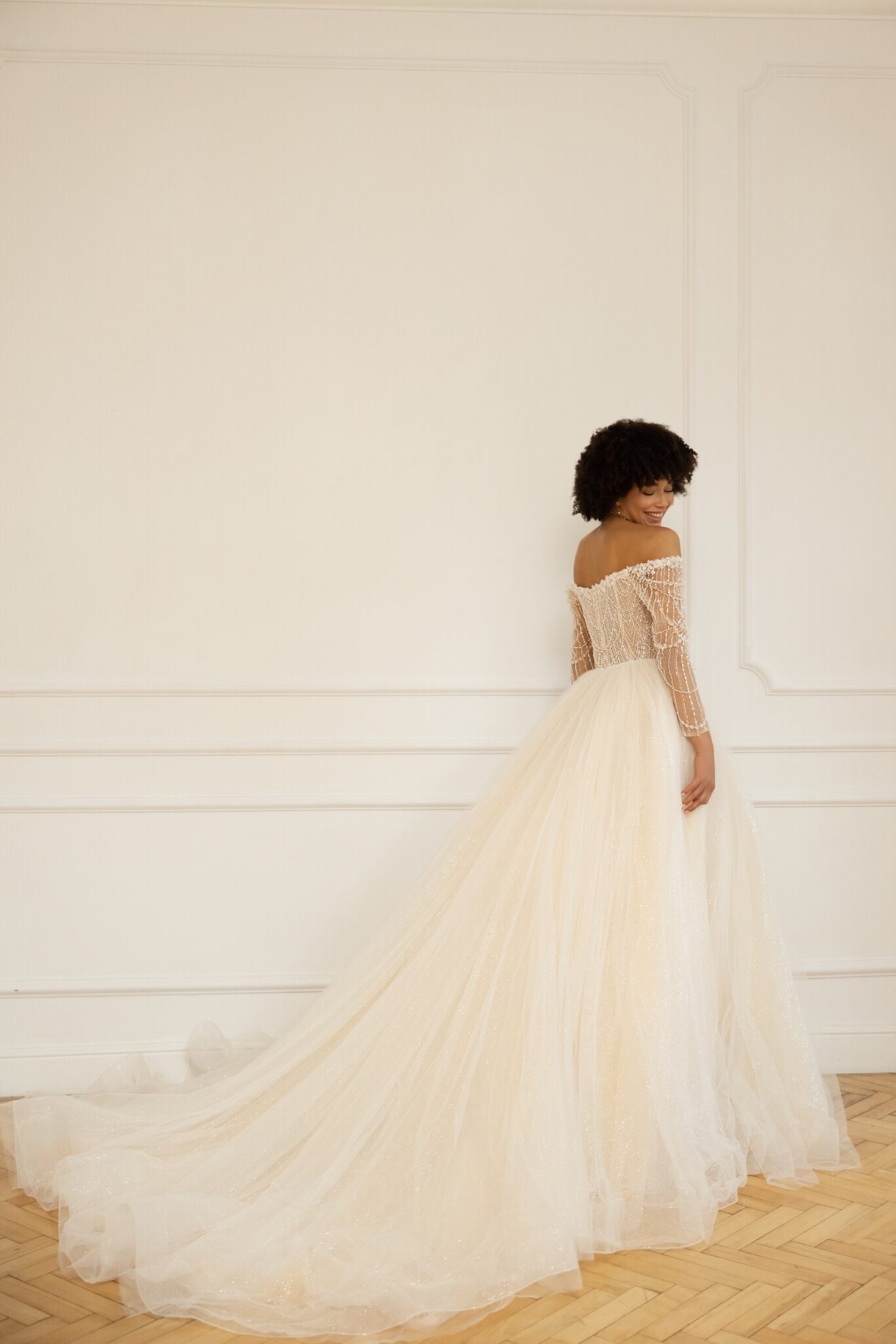 Ця фантастична сукня для сучасних романтичних принцес має хмарину вуального тюлю, яка створює спідницю з елегантним розрізом до стегна і кафедральним шлейфом. Корсетний верх прикрашений вишуканою бісерною вишивкою, а вражаючі довгі прозорі рукави видають красу ключиць, надаючи більш жіночий вигляд.