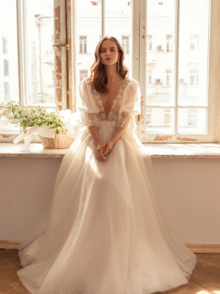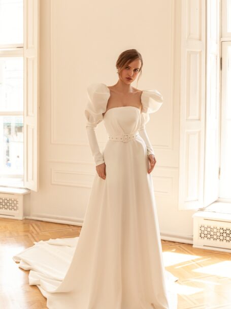Gillian – це абсолютно захопливий весільний наряд. Ця сукня з стильним силуетом “рибка” зроблена з блискучого атласу. Облягаючий корсет переходить у довгий рукав з одного боку, а на плечі розташована фантастична об’ємна квітка з тюлю та прикрашена перлинами. Спідниця облягає стегна і навіть трохи розширяється внизу, маючи невеликий шлейф.