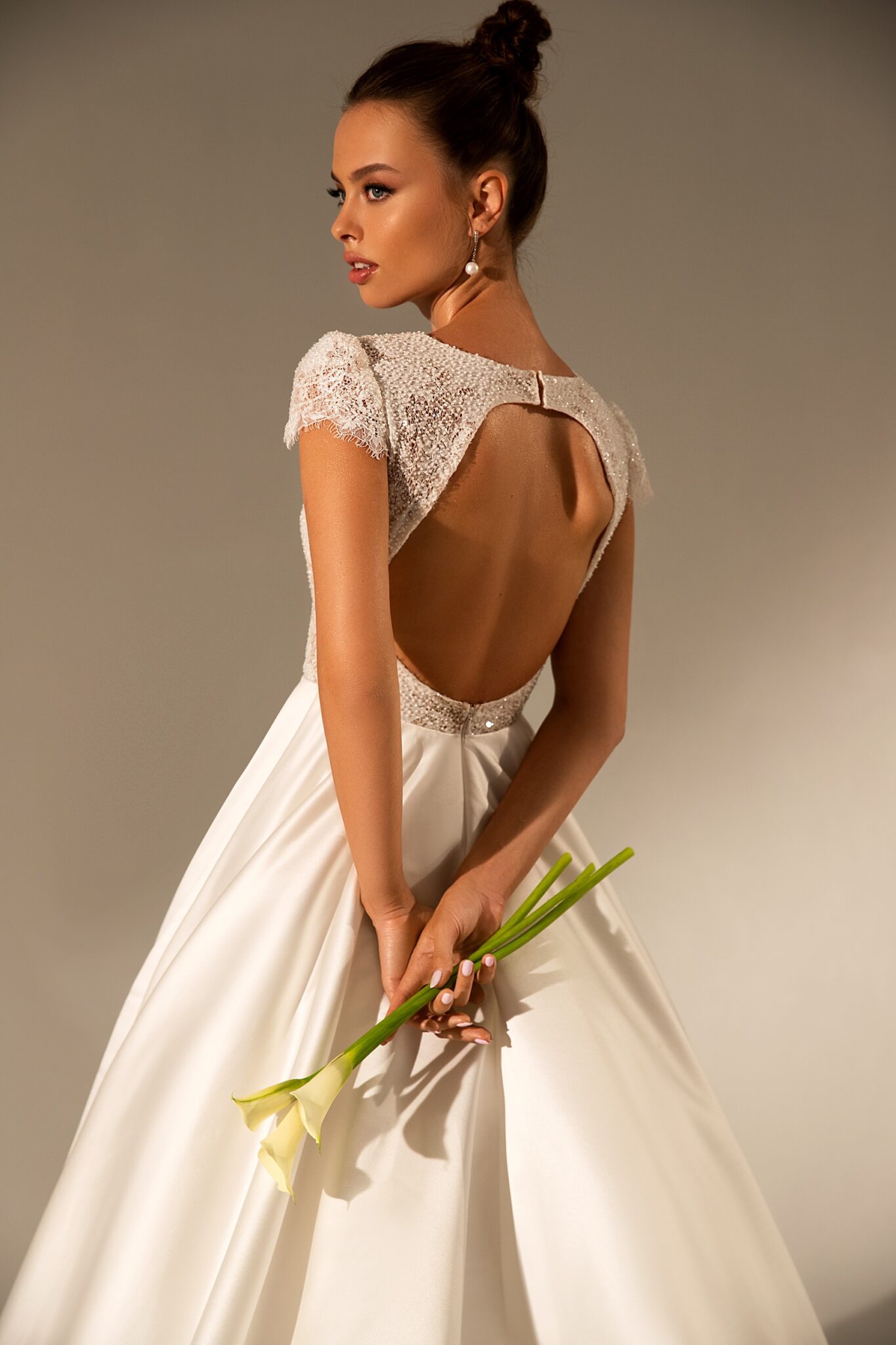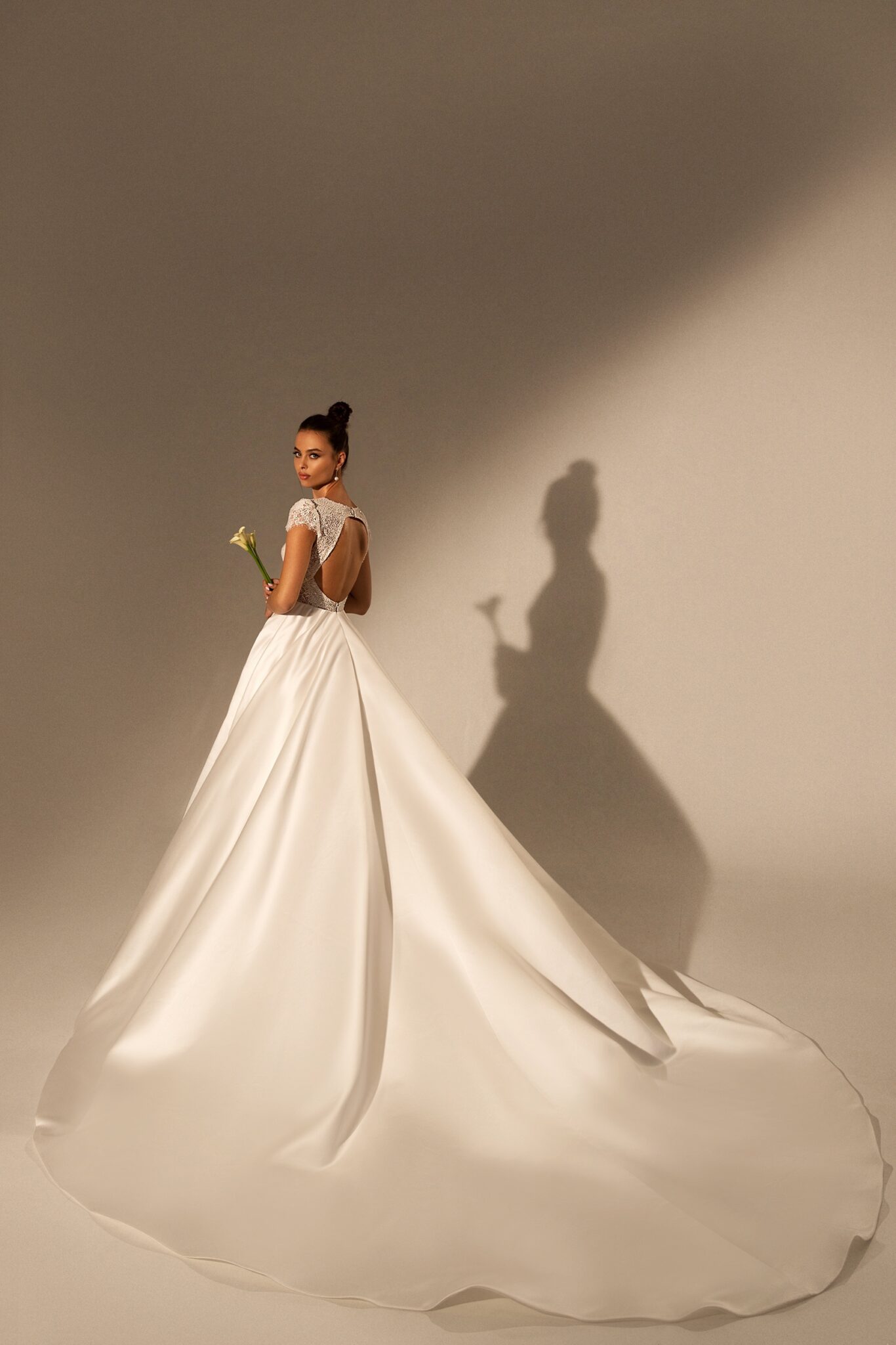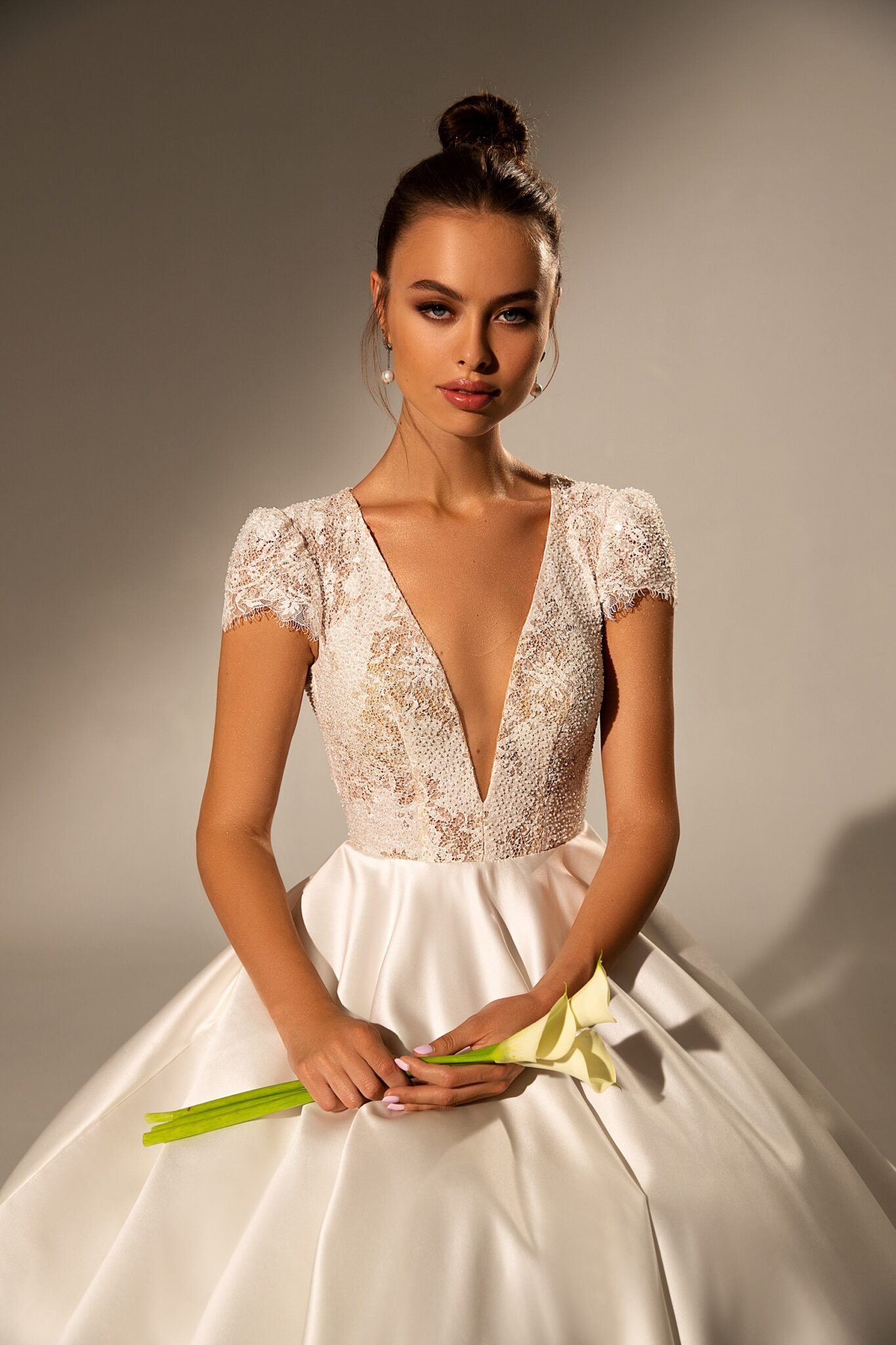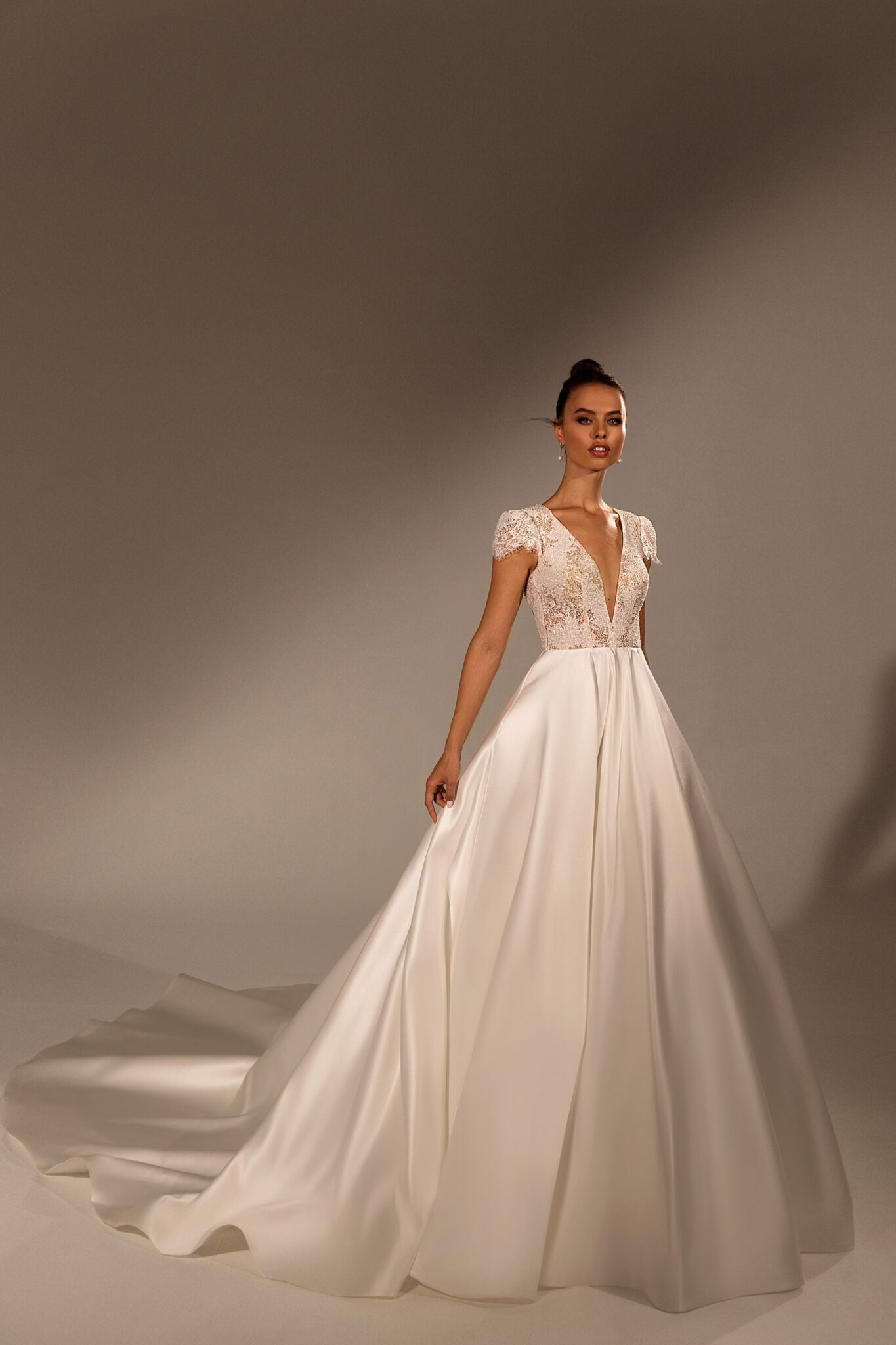Вражаюча весільна сукня з V-подібним вирізом – це справжнє шедевр. Верх виконаний з мережива, а довга спідниця зі шовку.