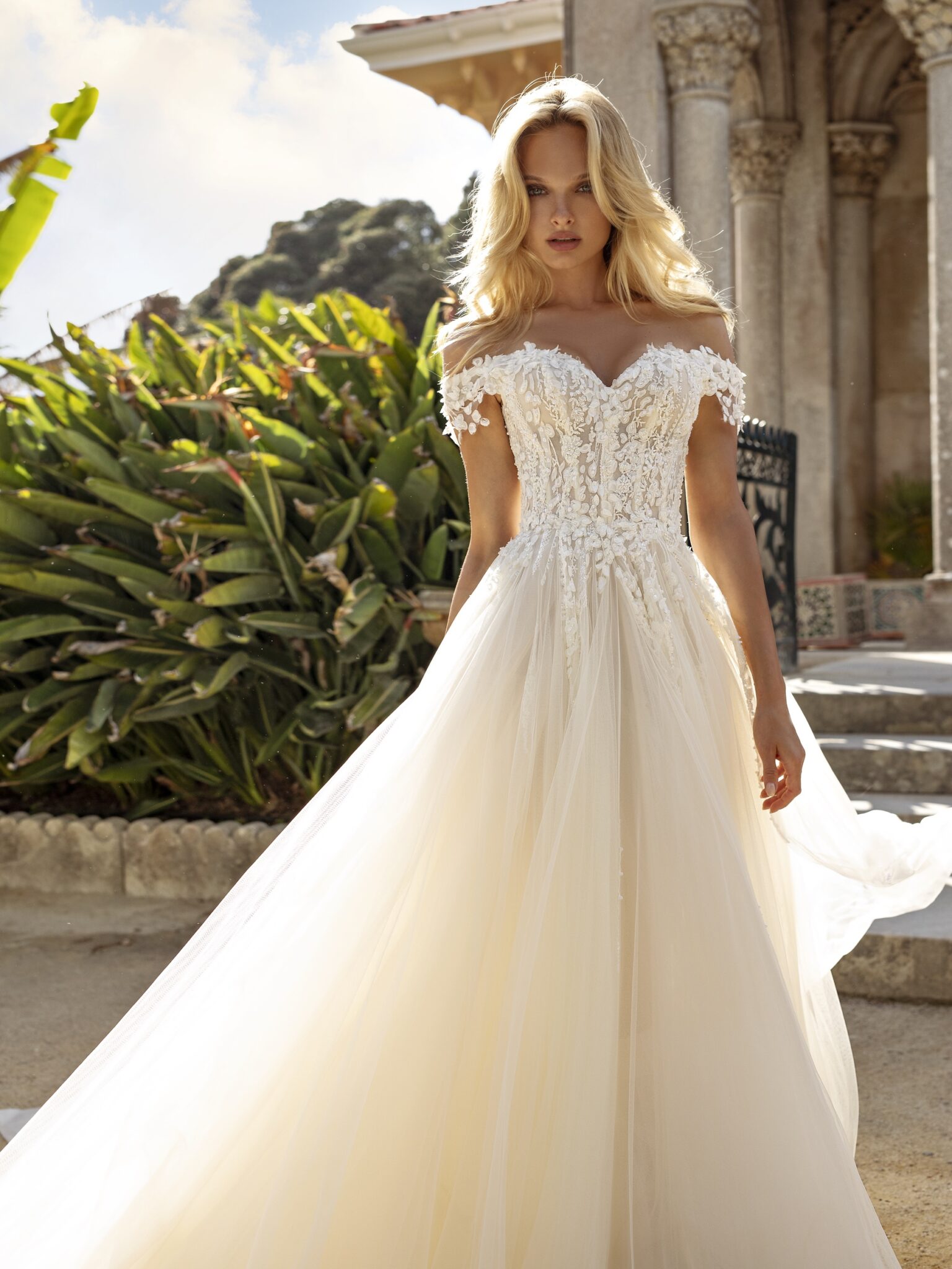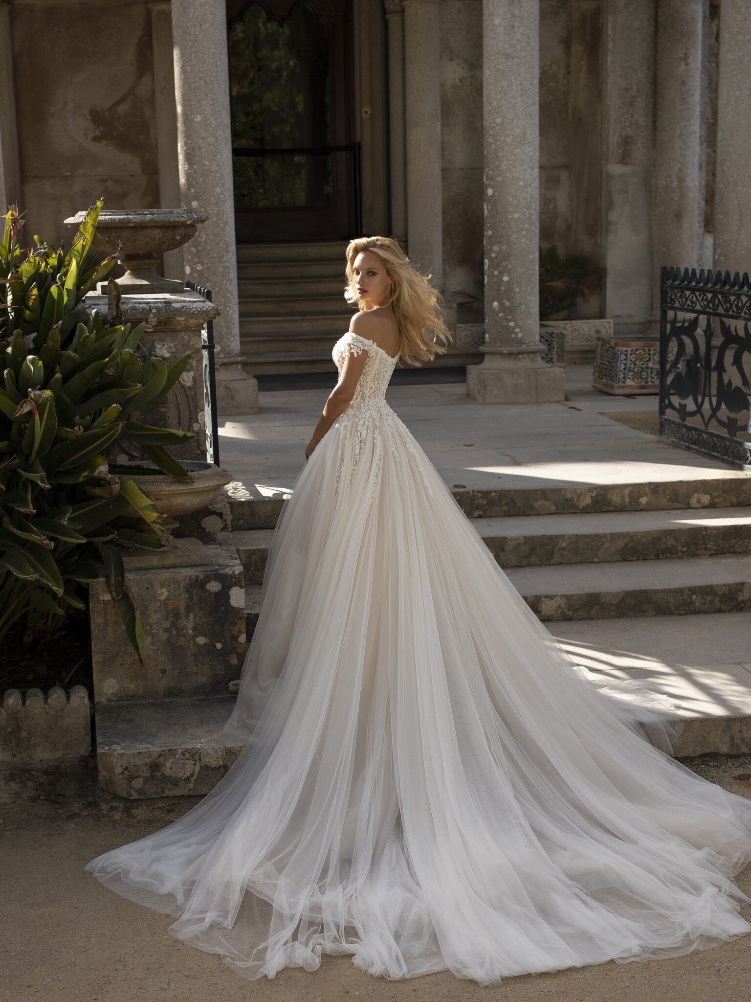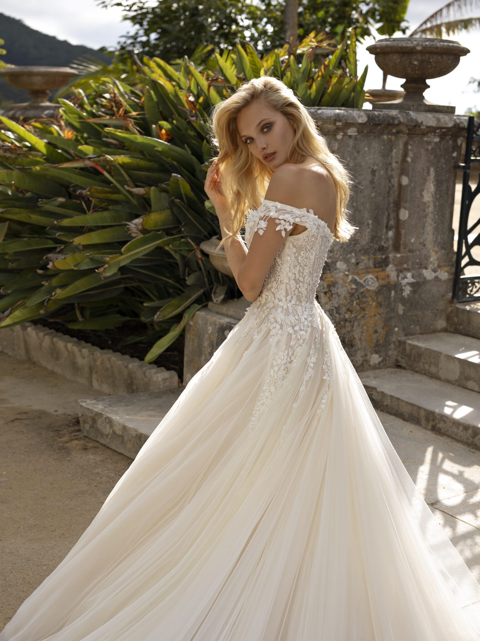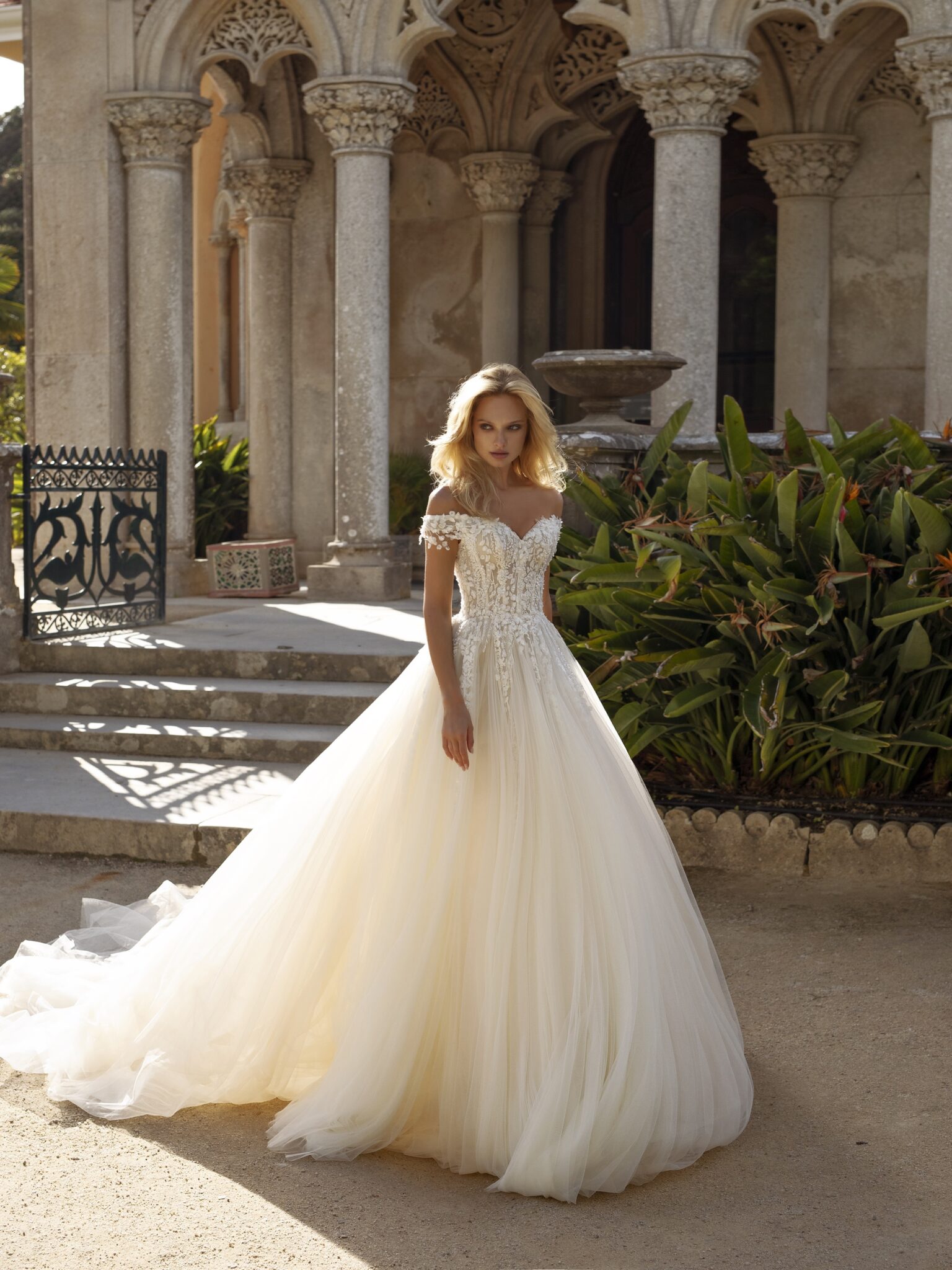 Весільна сукня Jolie – це чудове поєднання мережива та вуалі. Корсет з опущеними плечима повністю прикрашений маленькими мереживними квітами, які підкреслюють талію. Вільна спідниця з вуалі створює лаконічний силует.