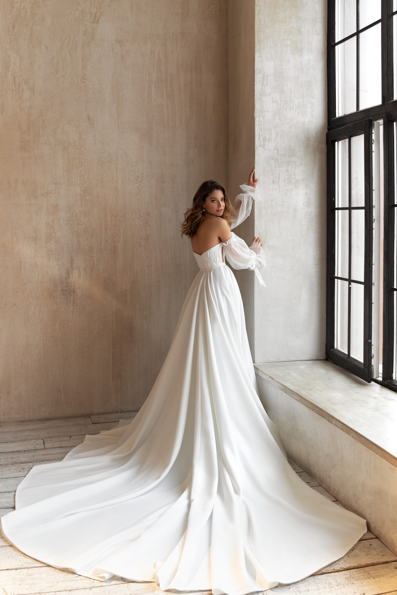 Ніжна весільна сукня з красивими рукавами у вільному стилі. Сукня у стилі “А-силует” без бретелей виготовлена з атласу-крепу. Корсет з V-подібним вирізом прикрашений лаконічними складками та розрізами під пахвами. Є додаткові вільні рукава з прозорої тканини. Ці еластичні рукава також прикрашені білими стрічками. Чудова спідниця переходить у довгий шлейф.