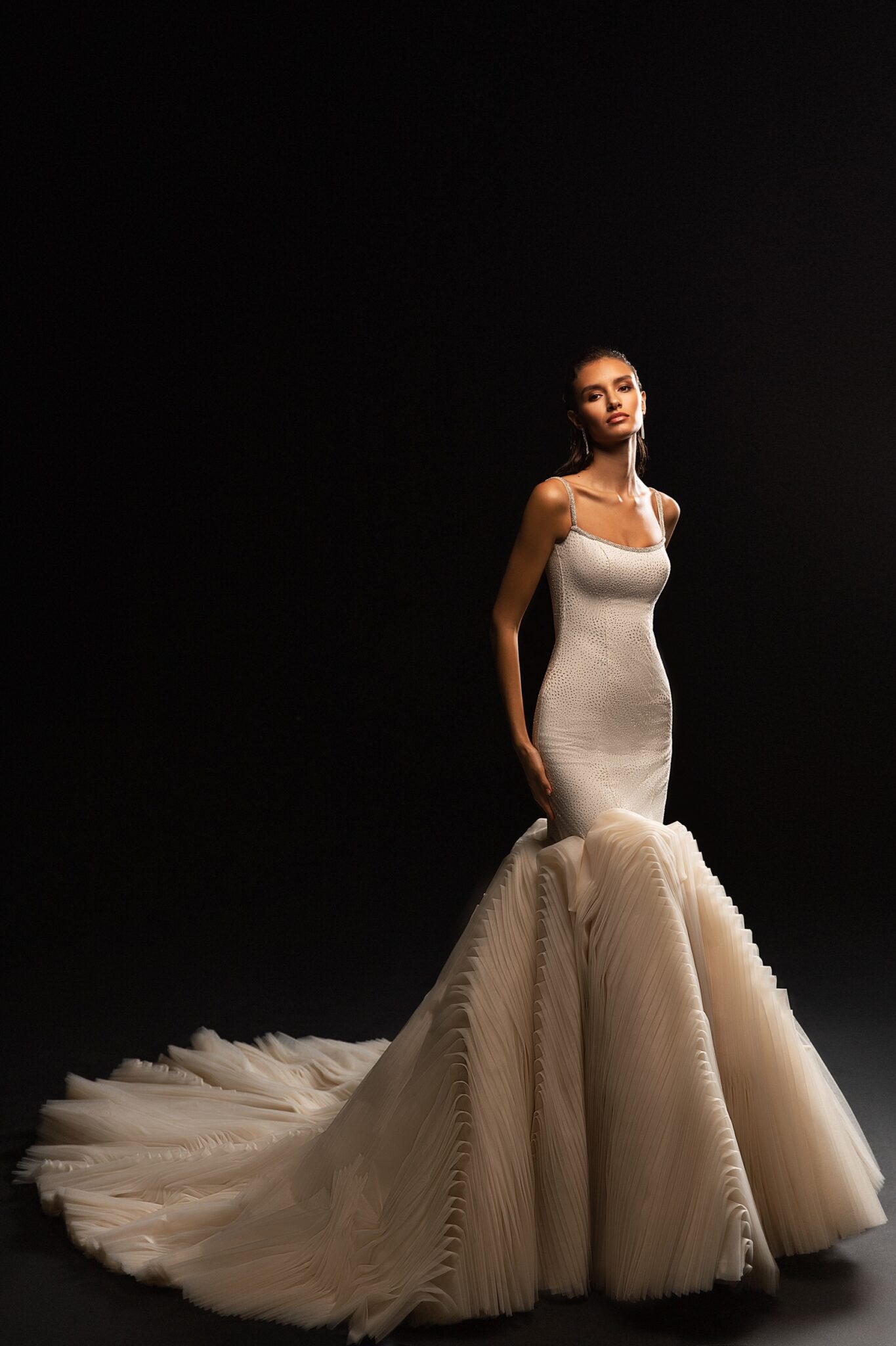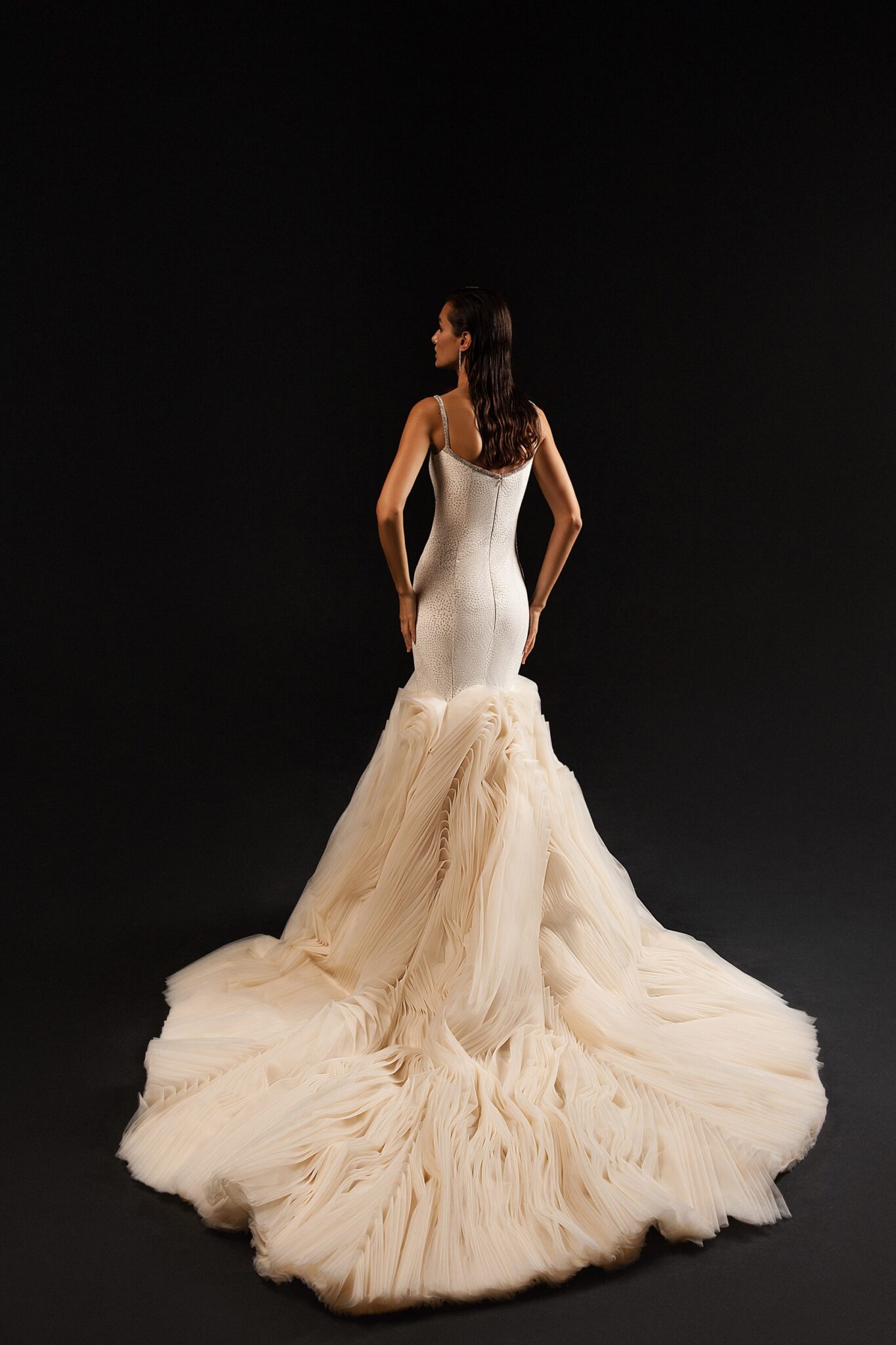 Ця ніжна весільна сукня має мінімалістичний та цікавий дизайн. Сукня поєднує унікальний образ в стилі “рибка” з особливими оборками на шлейфі.