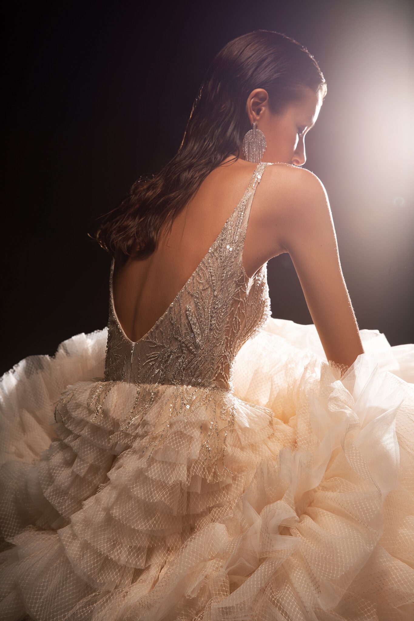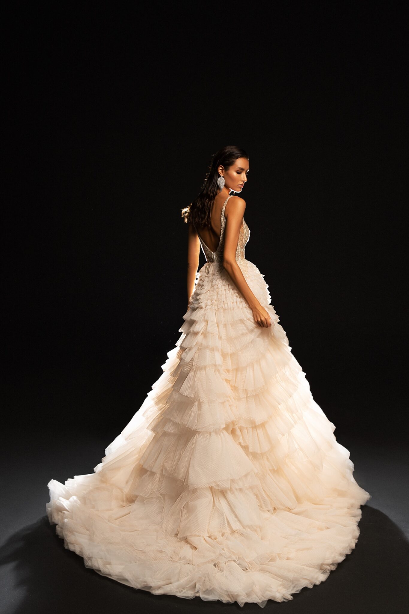 Королівська весільна сукня з вражаючим шлейфом. Верх сукні зроблений з прозорої тканини, яка повністю прикрашена візерунком з блискучих кристалів та намистин. Сукня виглядає жіночно завдяки V-подібному вирізу та глибокому декольте.